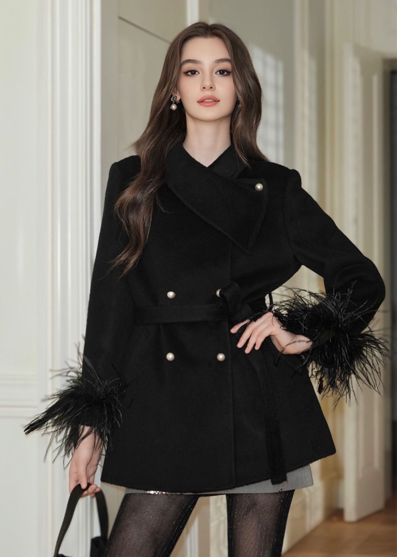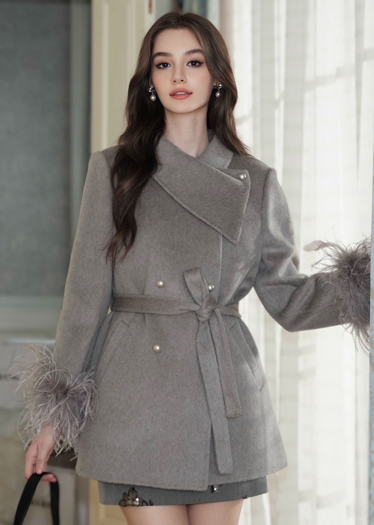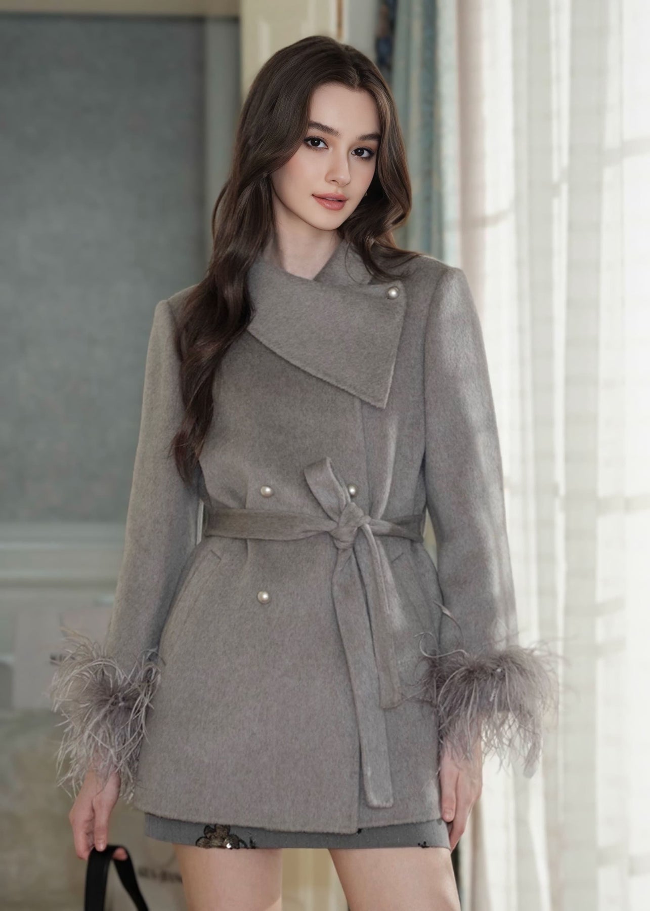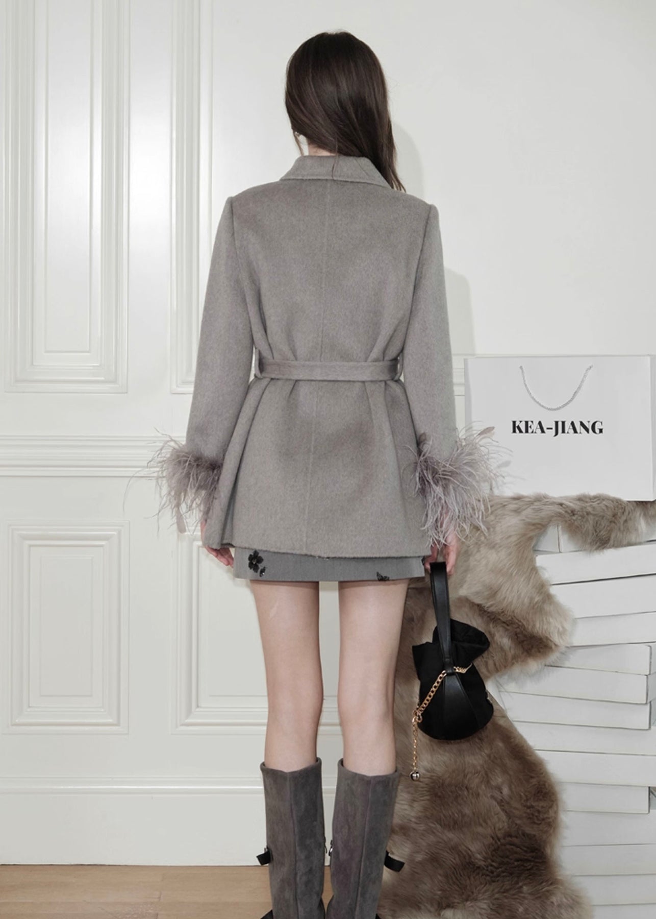 ふんわりと柔らかなウール素材に、袖口へ贅沢にあしらわれたフェザーが目を惹く、特別感たっぷりの1着です。