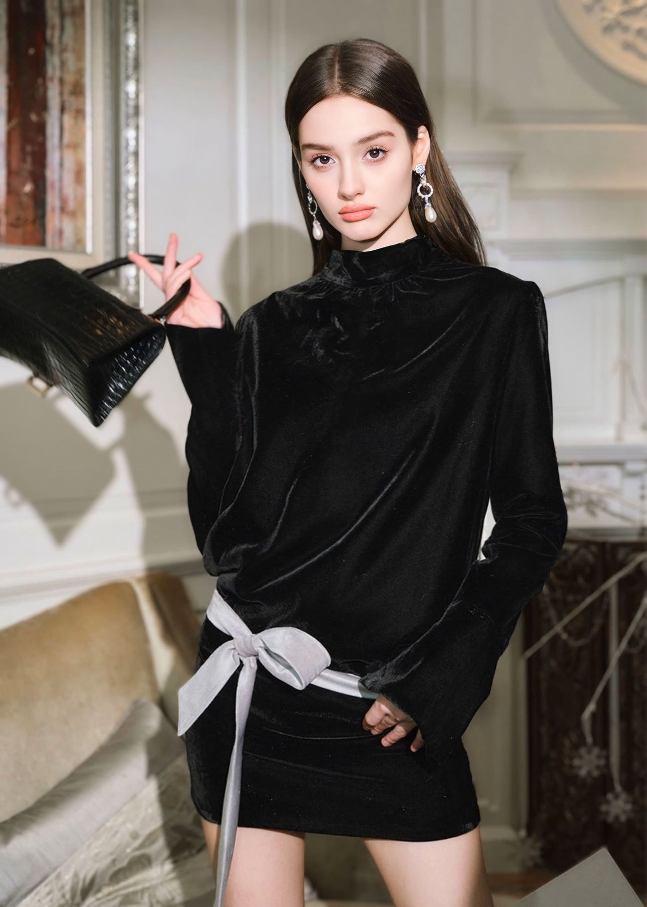 首筋を美しく包み込むハイネックは、露出を抑えながらも知的な印象を与え、ミニ丈×長袖の組み合わせで肌の見せ方にメリハリが生まれ、大人の女性らしい洗練された雰囲気に。