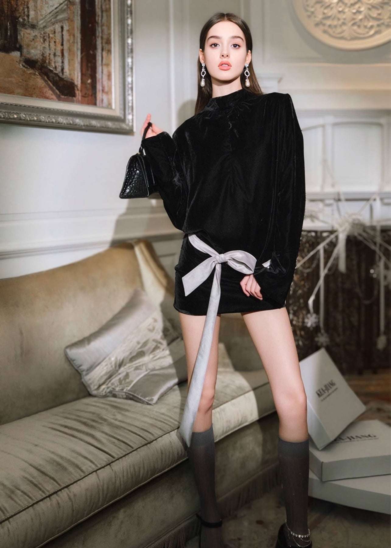 夜の帳のような深みのあるブラックベルベット生地に、クラシカルな要素を落とし込んだ、周囲と差をつける特別感のある一着。