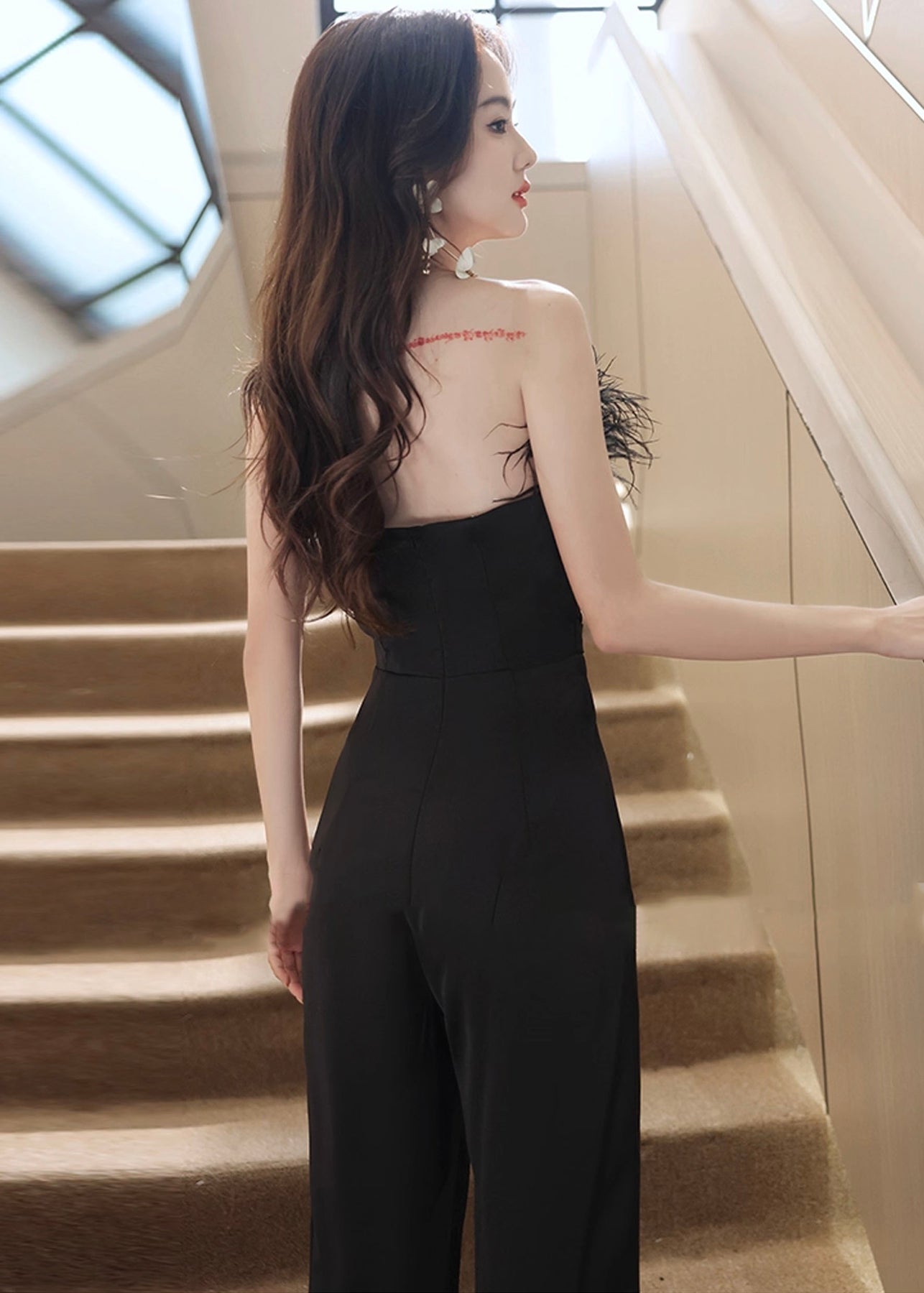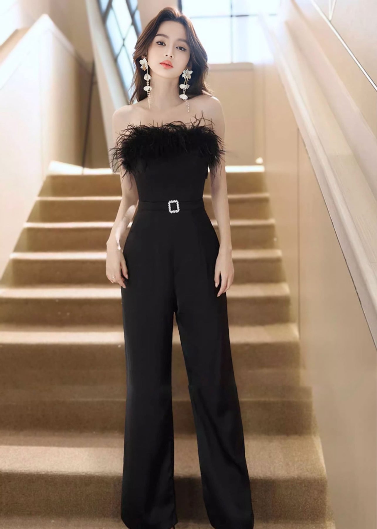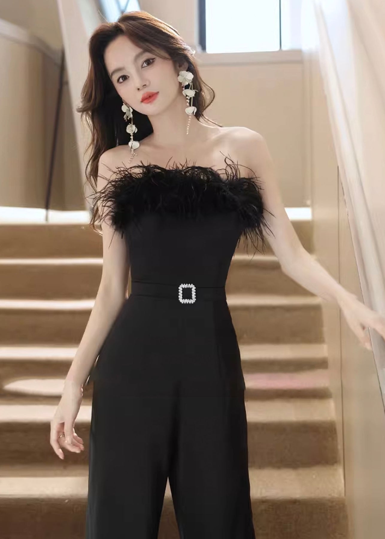 デコルテ部分にボリューム感のあるファーをあしらった、ベアトップデザインのジャンプスーツ。ファーが顔まわりを華やかに見せつつ、肩まわりはすっきりとした印象に仕上げています。