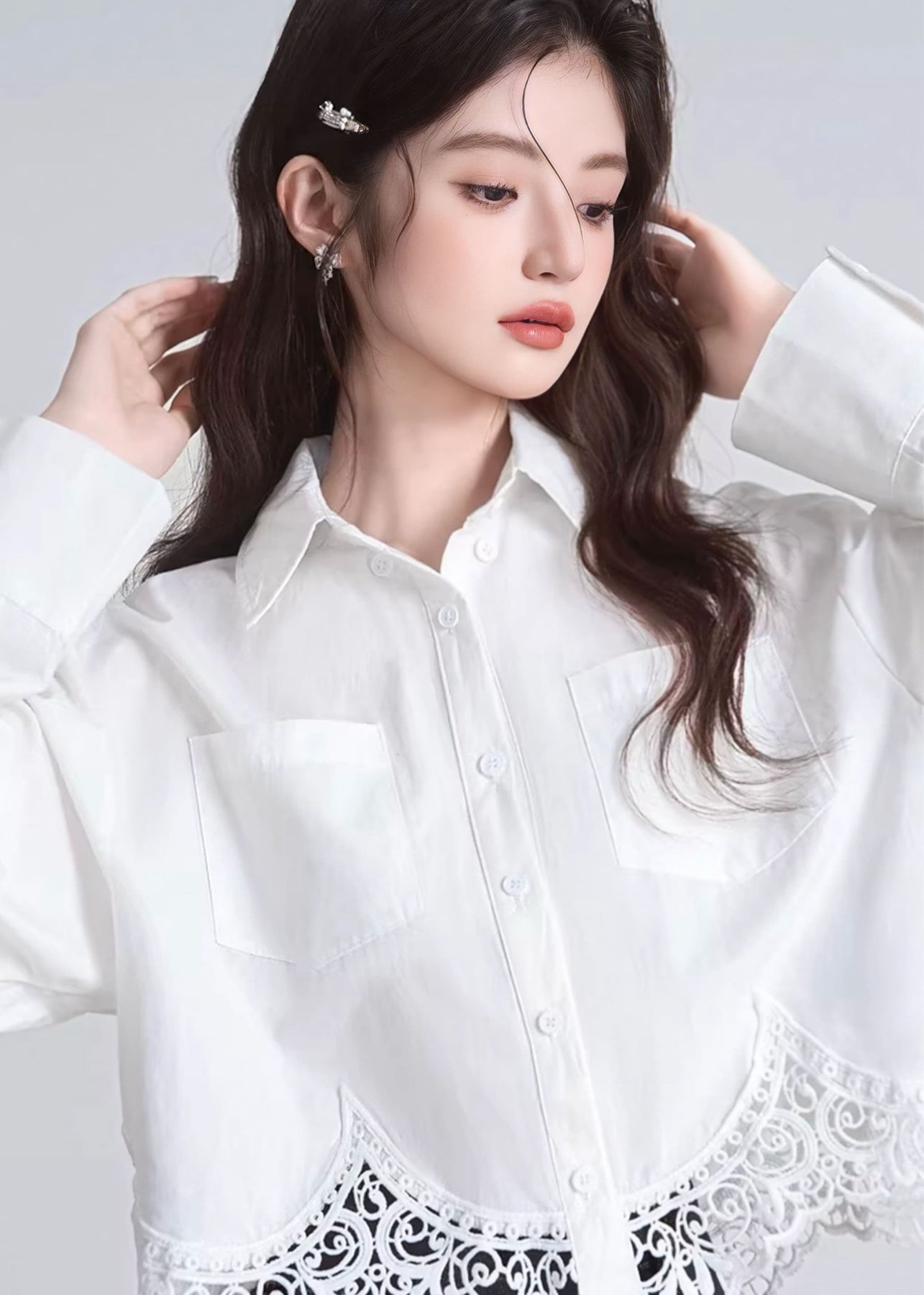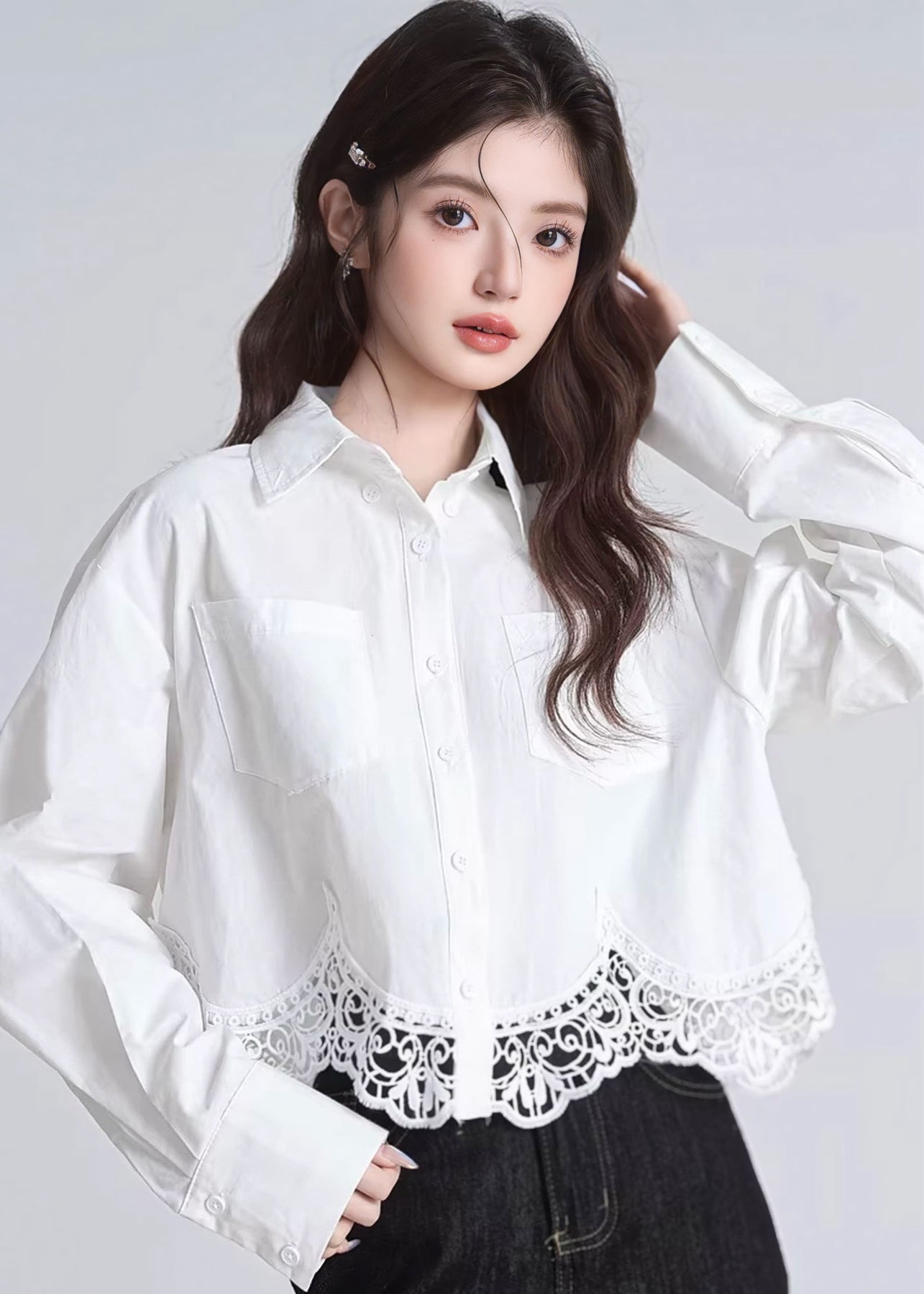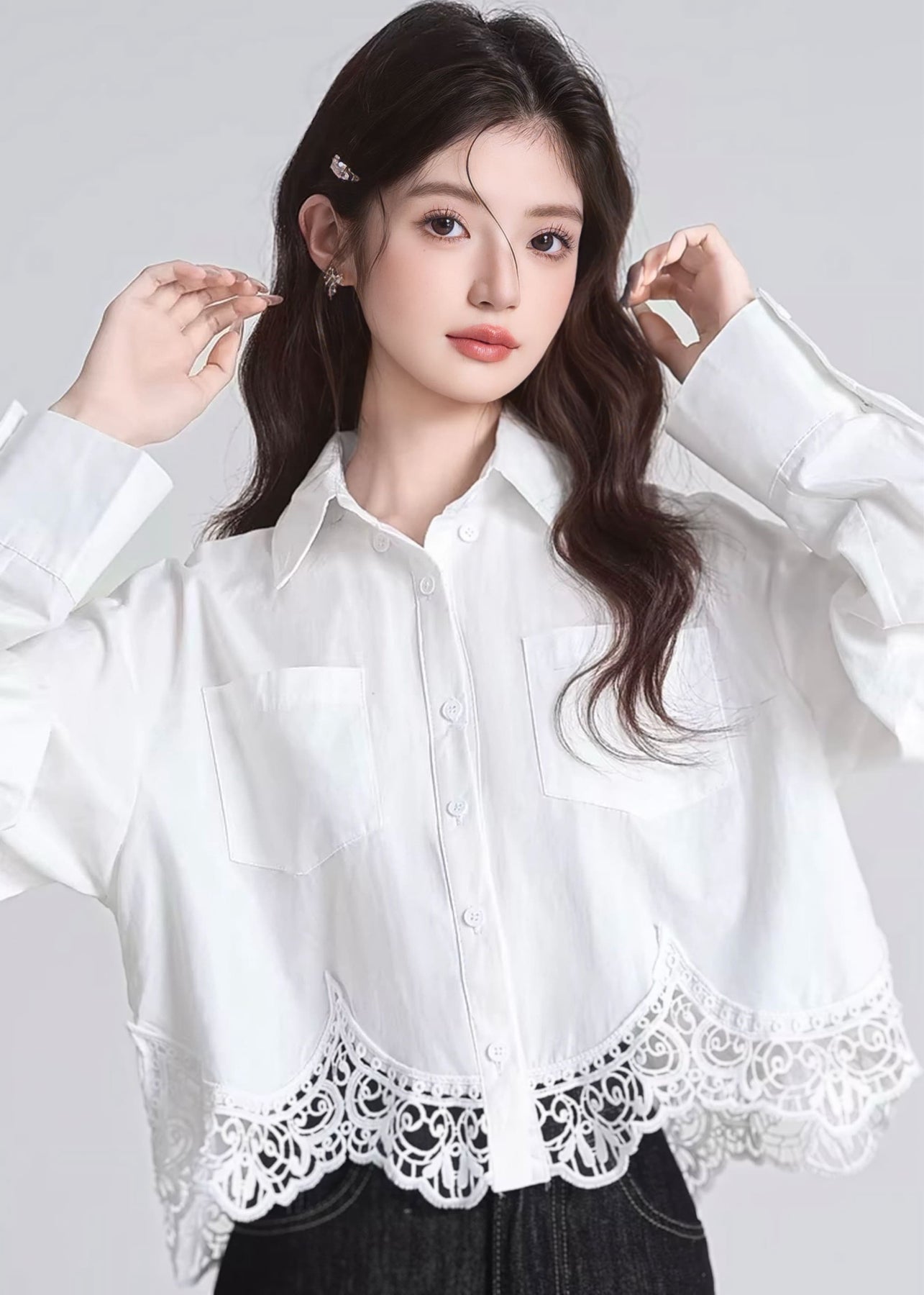 クリーンなホワイトシャツに、繊細なレースをあしらったヘムデザインが映えるクロップドシャツ。裾はスカラップ仕立てのレースになっており、シンプルな中にも女性らしいやわらかさと華やかさを添えています。