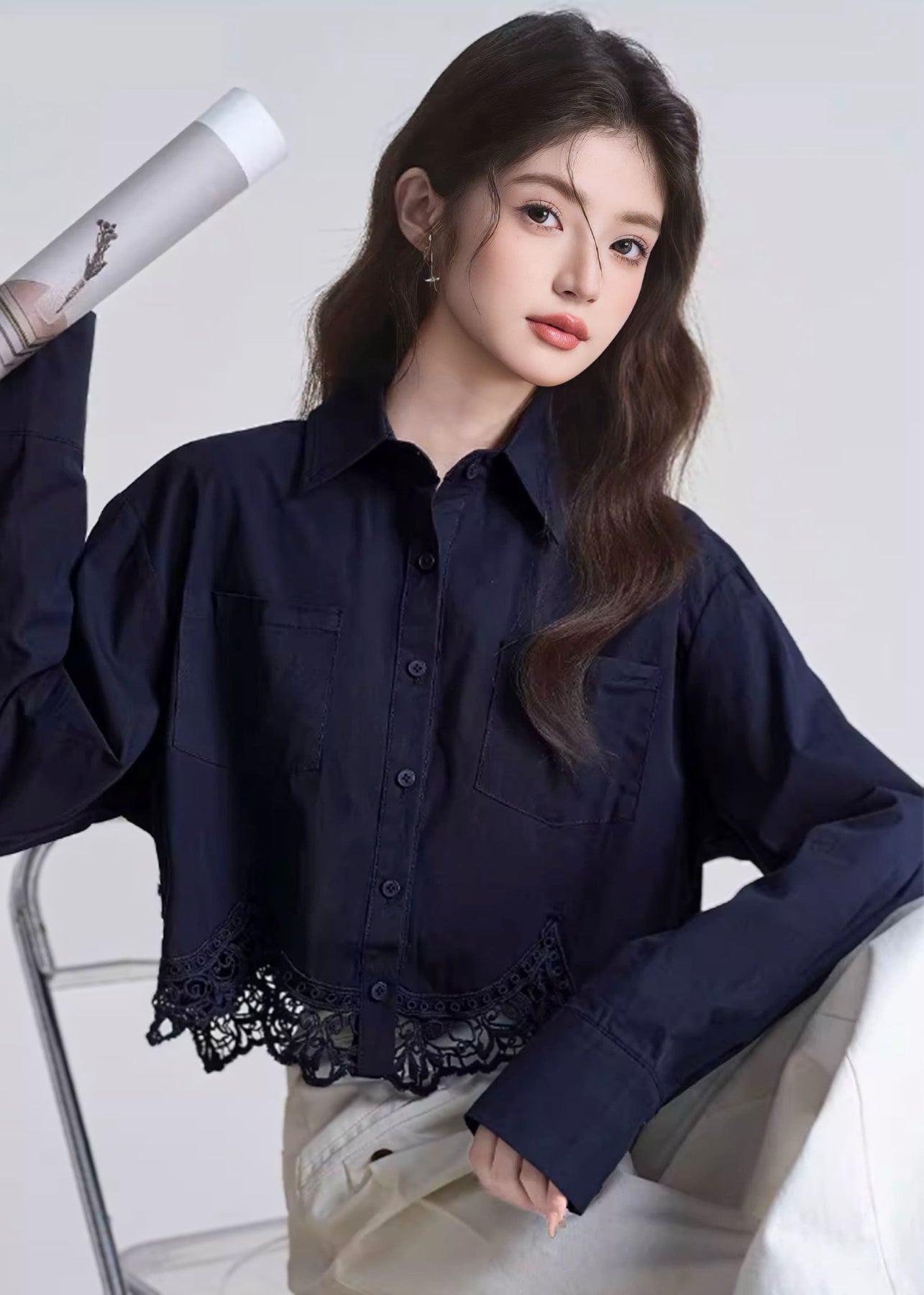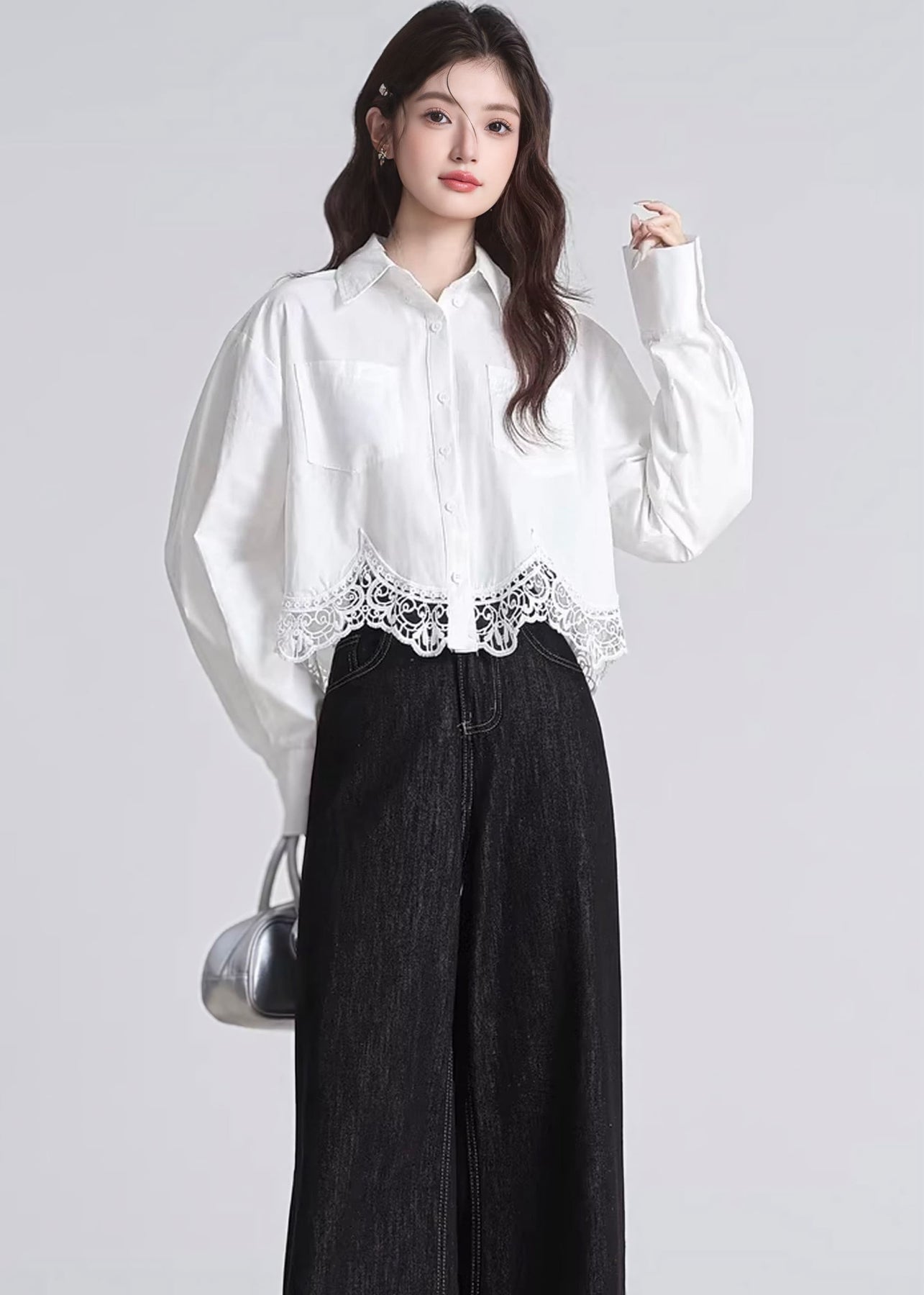 程よいクロップド丈がバランスよく、ハイウエストのボトムスと合わせることで自然とスタイルアップ。シャツならではのきちんと感がありながら、レースの透け感が軽やかな抜け感を演出します。