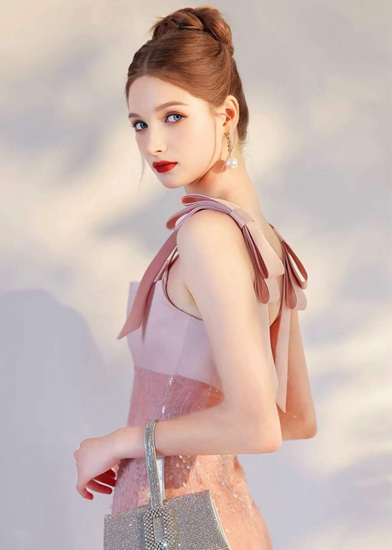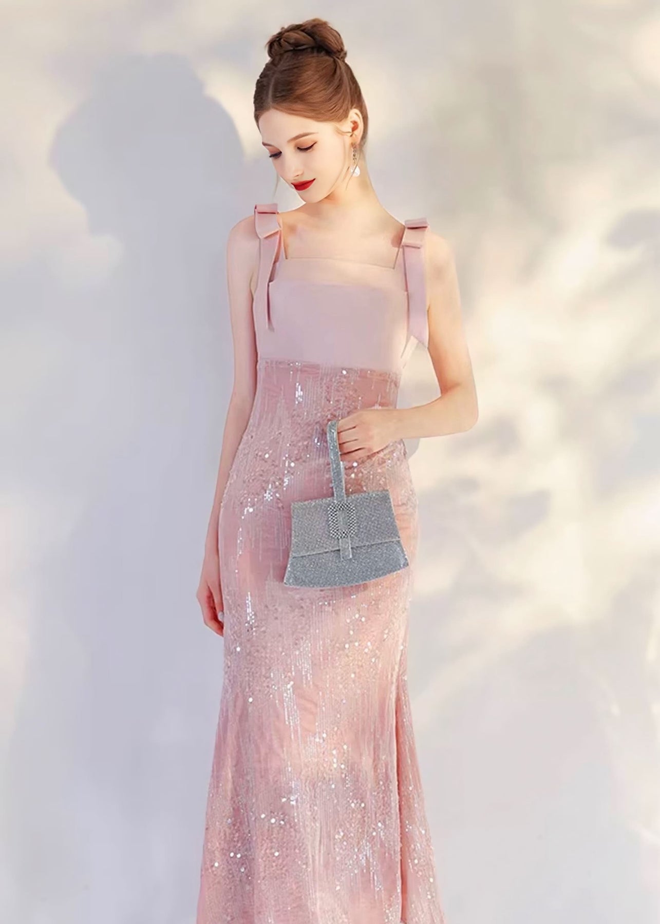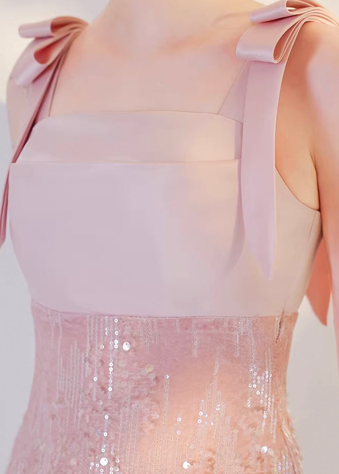 やさしく肌になじむパステルピンクが印象的な、華やかさと上品さを併せ持つマーメイドドレス。