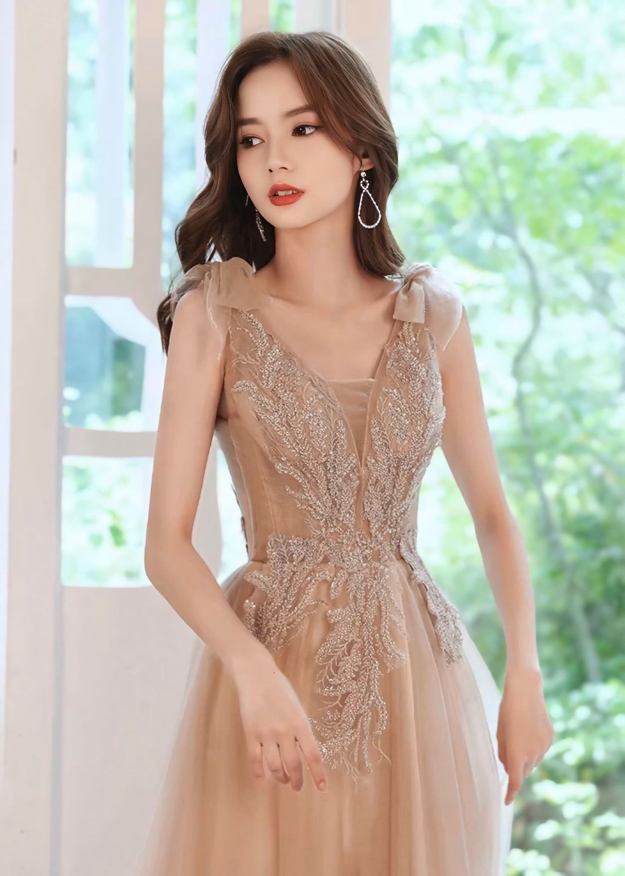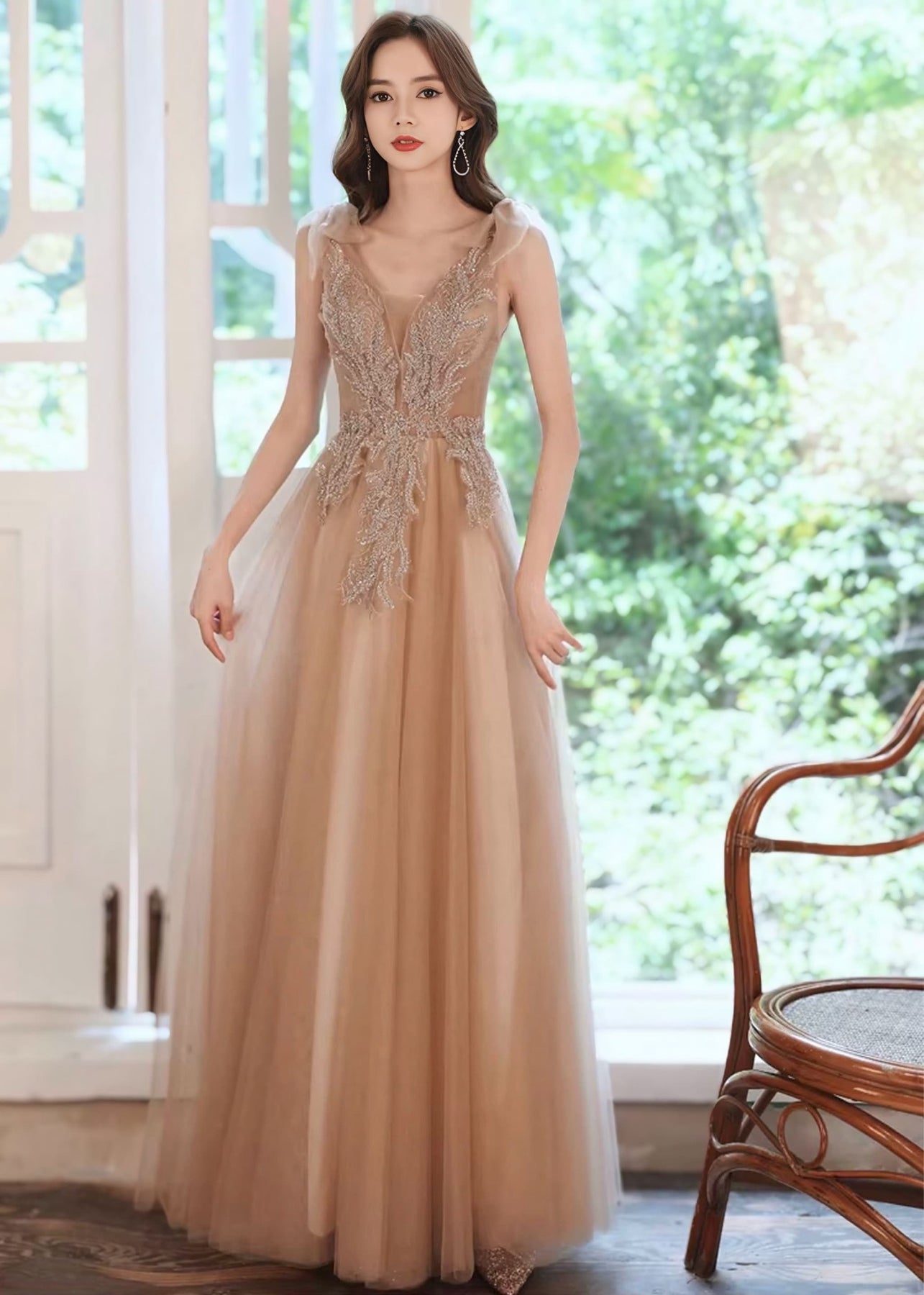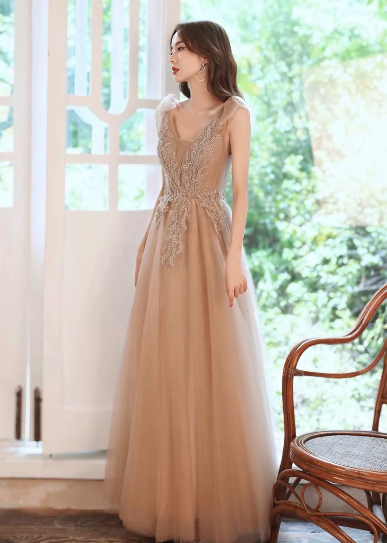 やわらかな光を含んだシャンパンカラーが美しく映える、気品あふれるロングドレス。