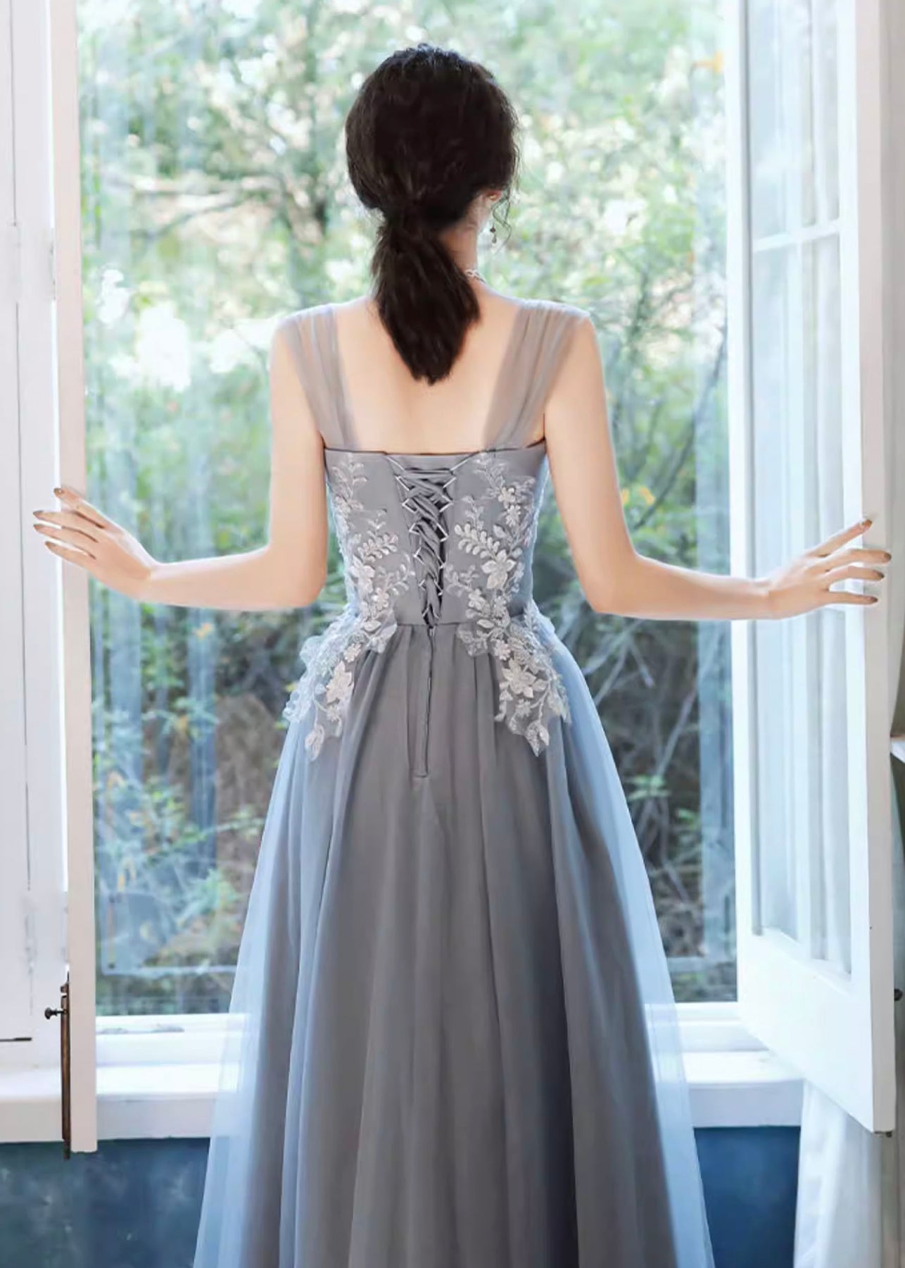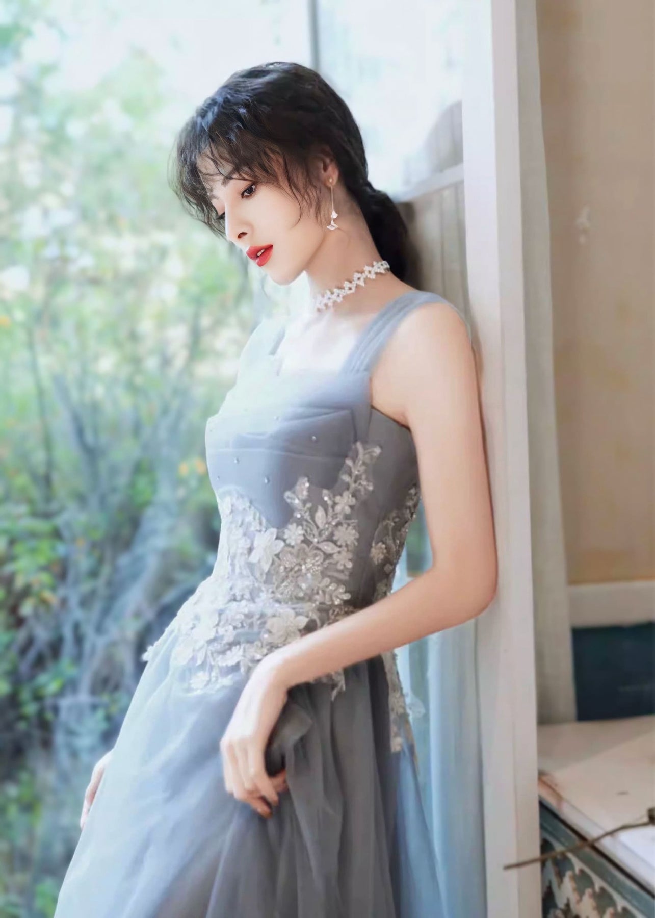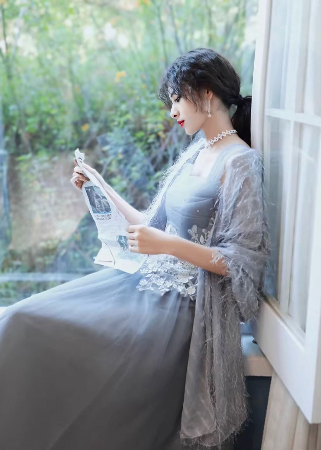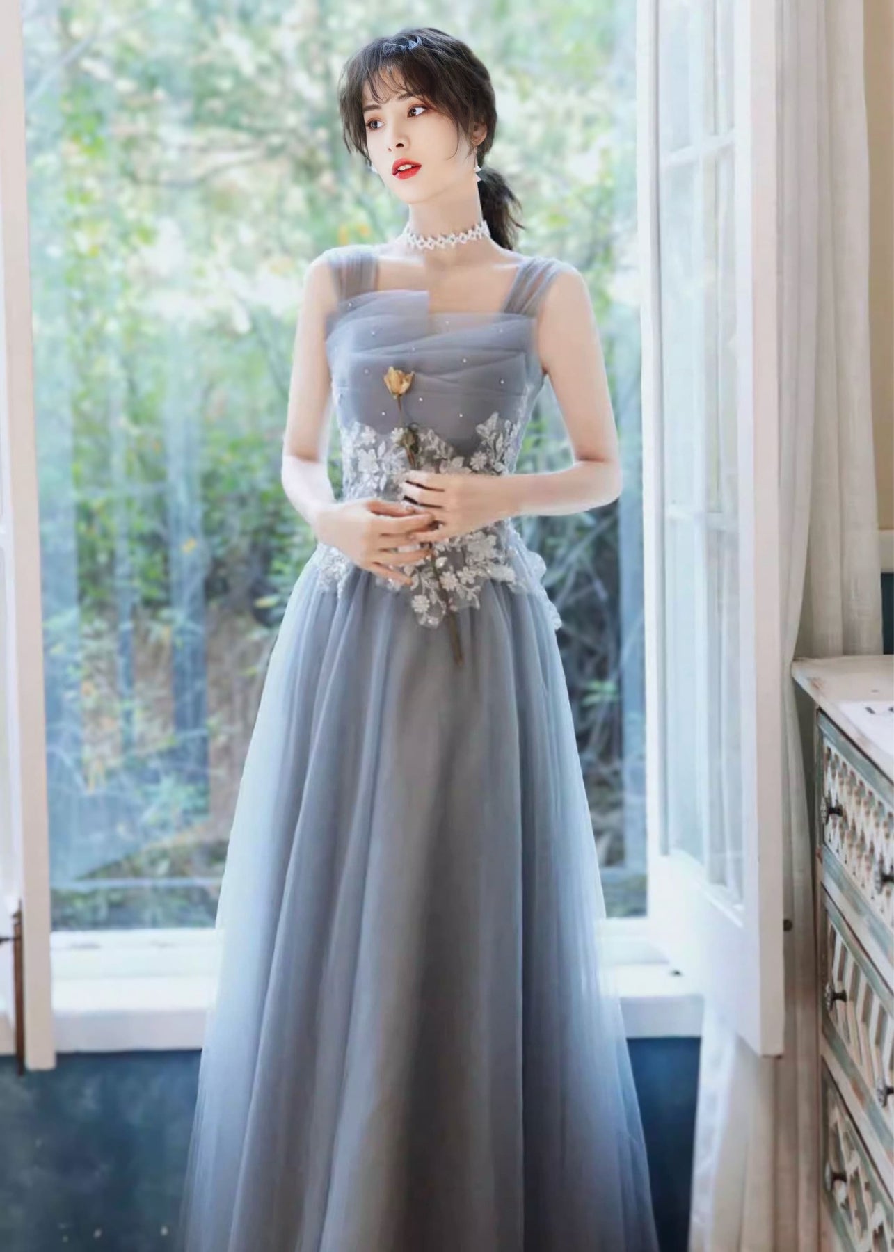 やわらかな光をまとったような、ニュアンスブルーのロングドレス。