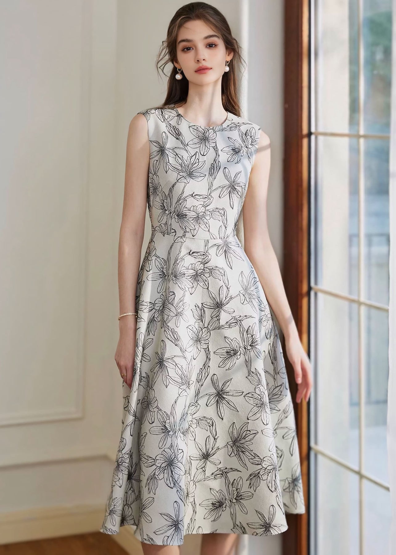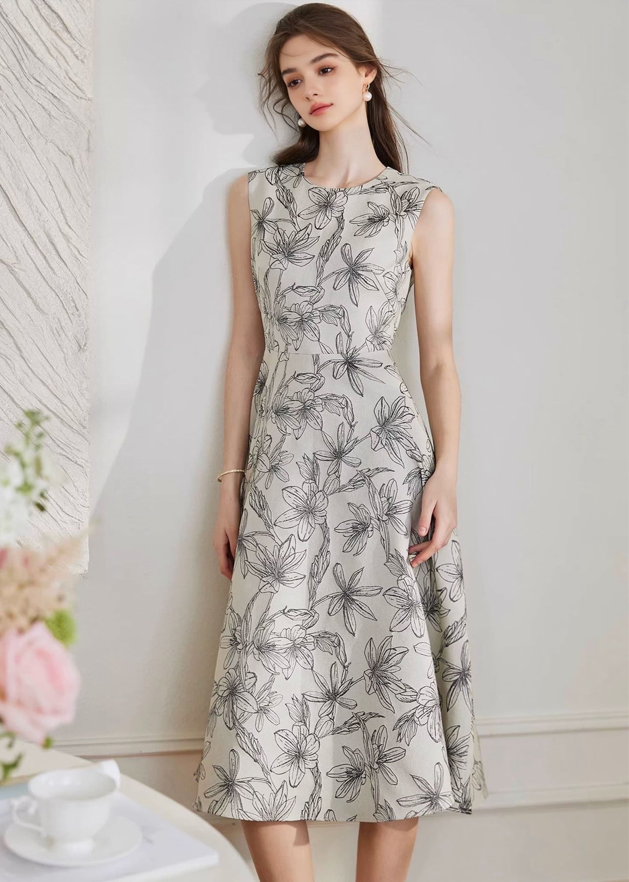 ノースリーブのすっきりとしたトップスと、裾に向かってやわらかく広がるフレアシルエットが、身体のラインを美しく見せつつ、軽やかな印象に。