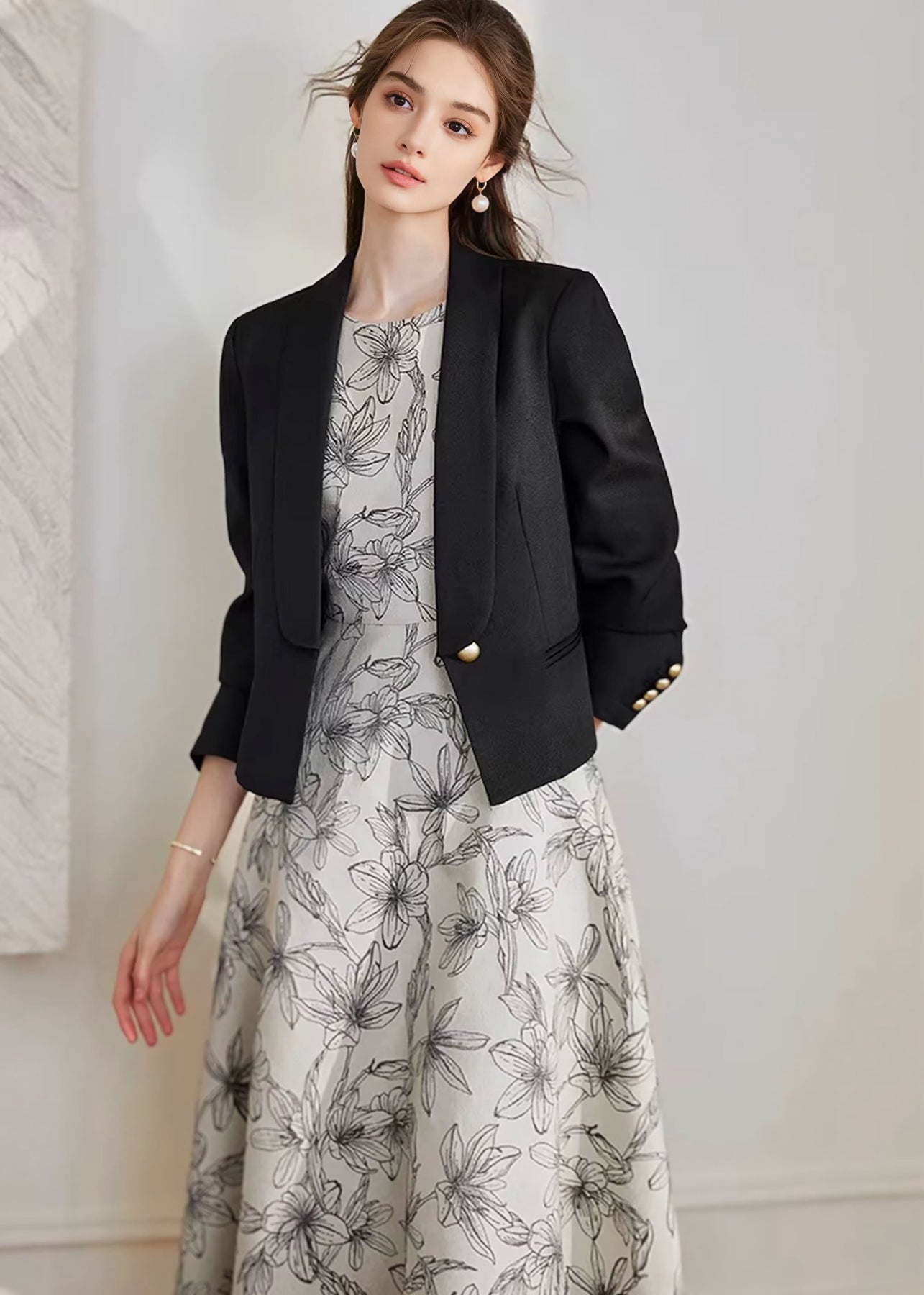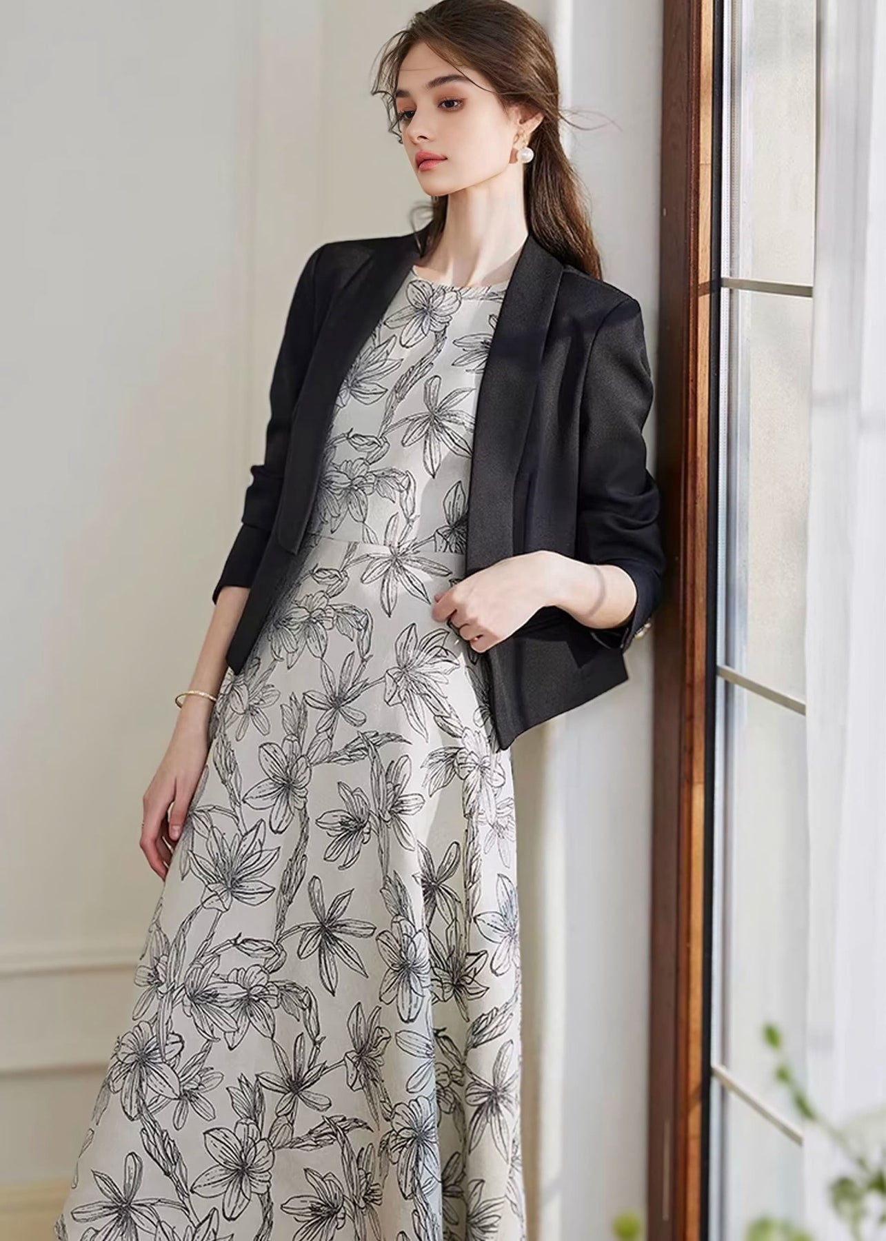 立体感のあるジャガード素材に、繊細なフラワーモチーフをあしらった上品なミディドレス。