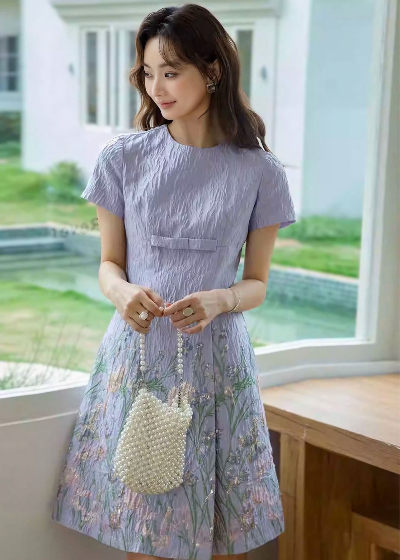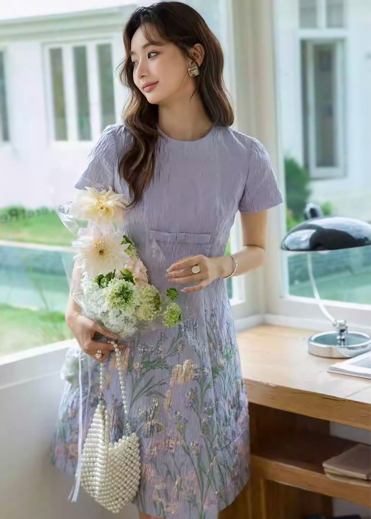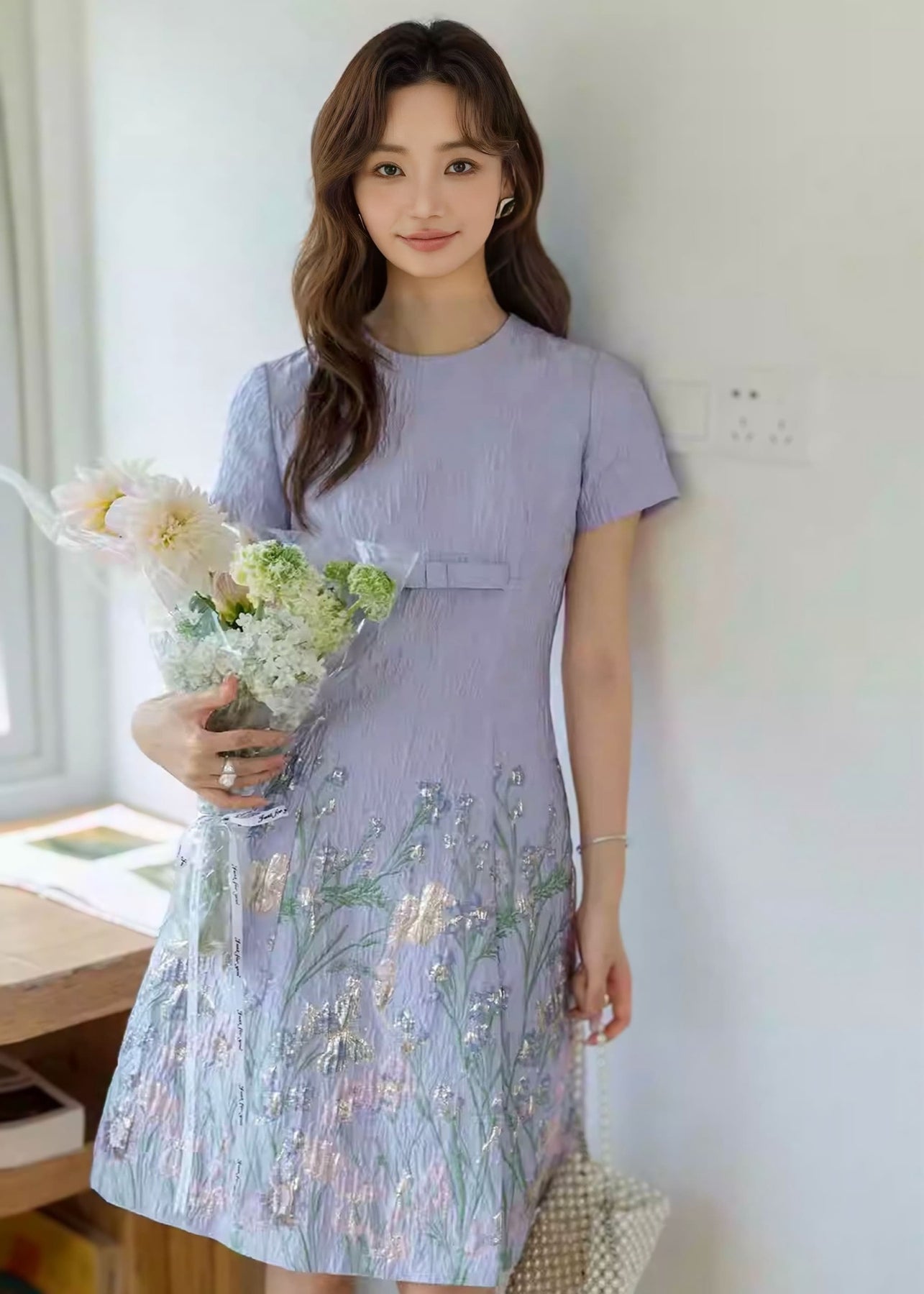 淡いパープルの生地に、ピンクとグリーンの花柄刺繍をあしらった、やさしく可憐な印象の一着。