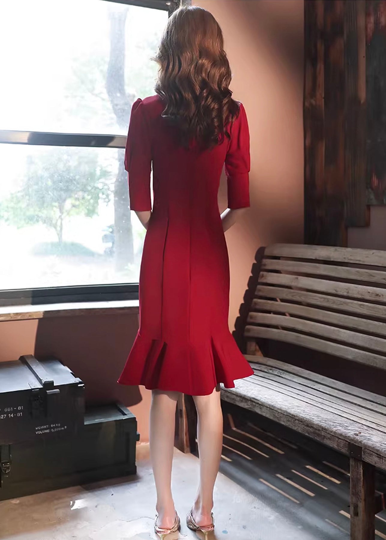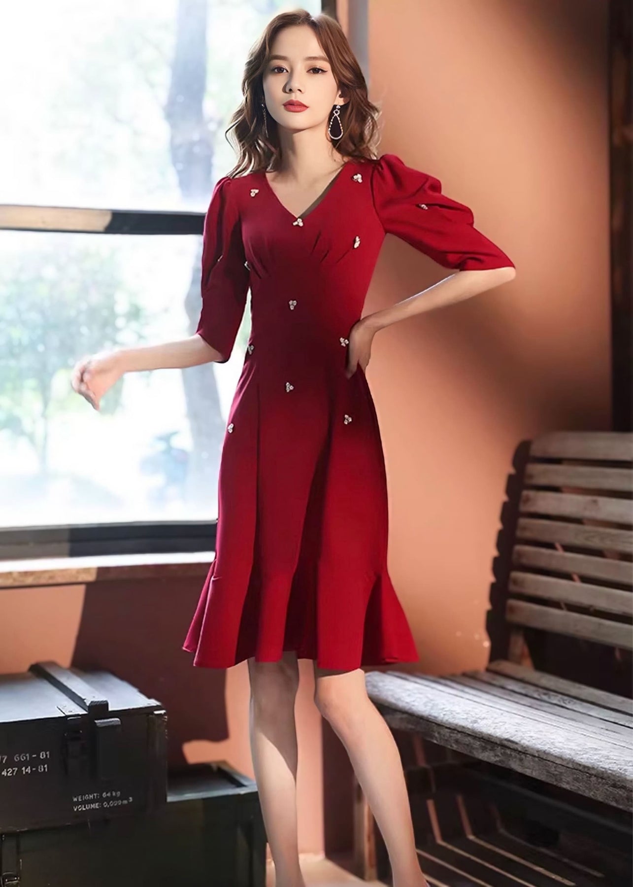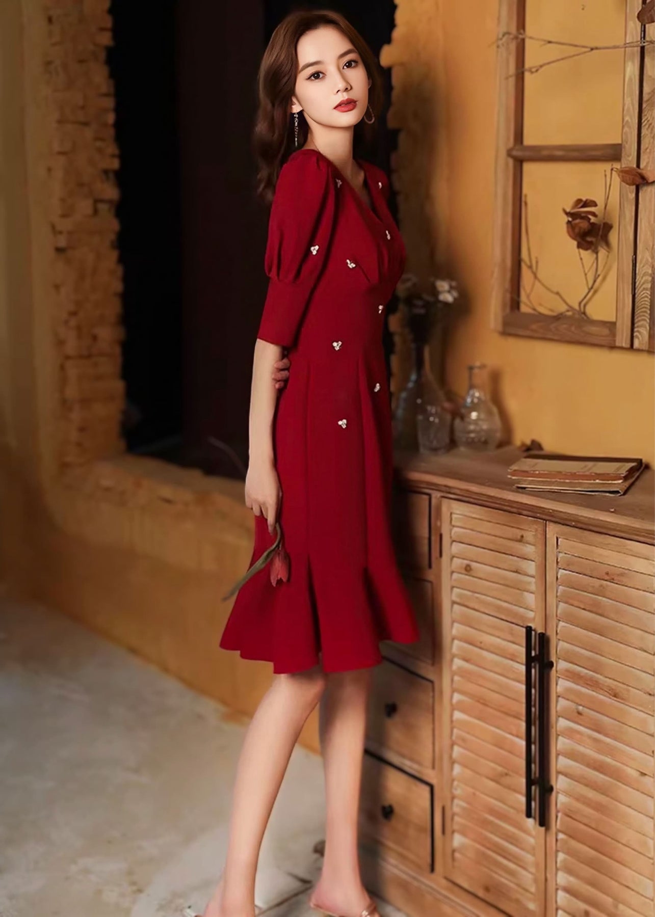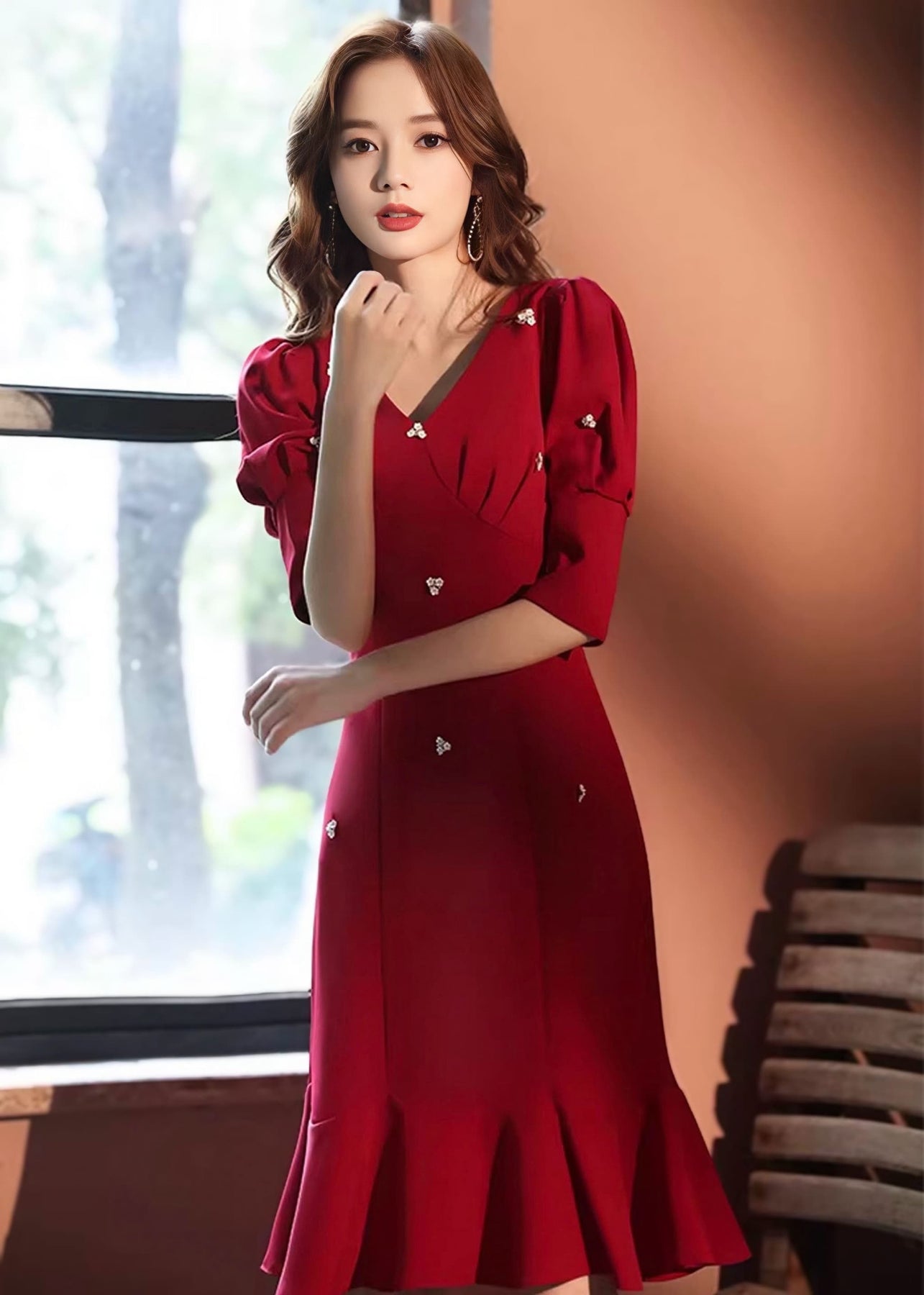 深みのあるワインレッドカラーが大人の華やかさを引き立てる、上品な印象のフラワービジュードレス。落ち着いた色味の中に繊細な装飾が映え、特別な日やお呼ばれシーンにもぴったりの一着です。女性らしいシルエットと華やかなディテールが絶妙に調和し、エレガントな雰囲気を演出します。