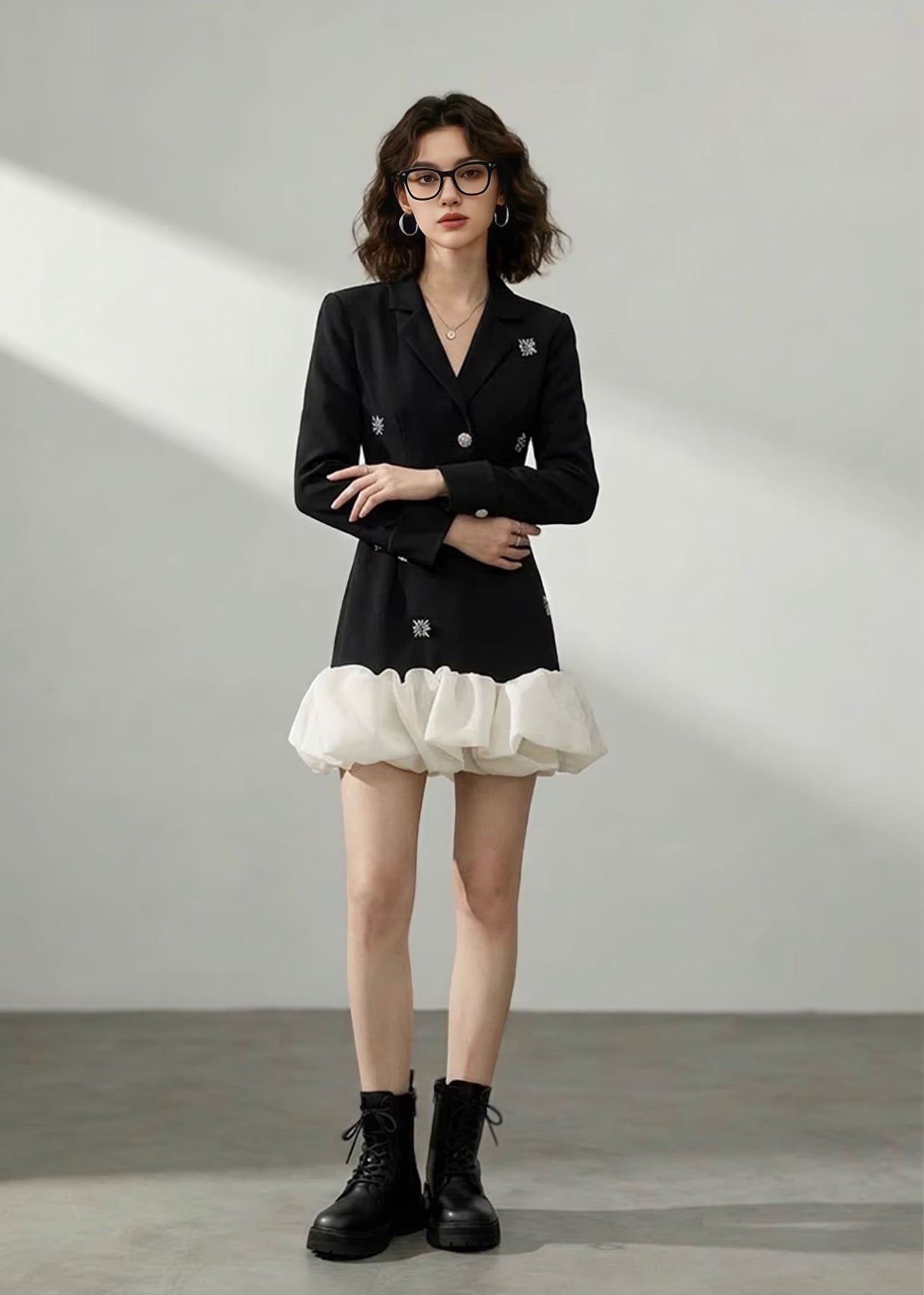 スカート部分はタイトラインをベースにしながら、裾にはホワイトのバルーンフリルをプラス。