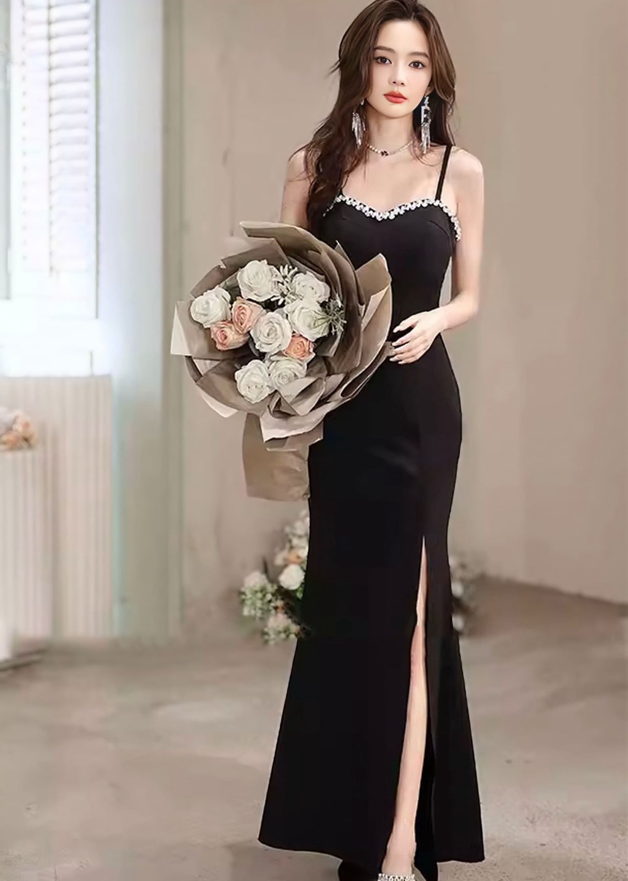 パーティーやディナー、特別なシーンにふさわしい、気品とセンシュアルさを兼ね備えた一着です。