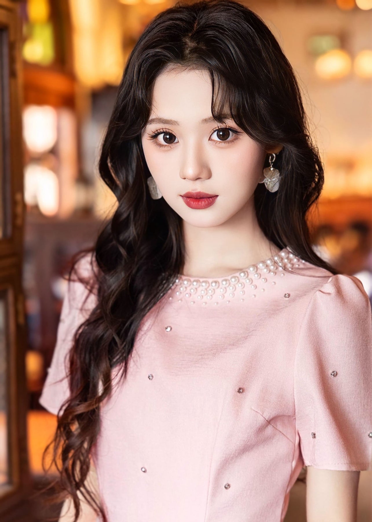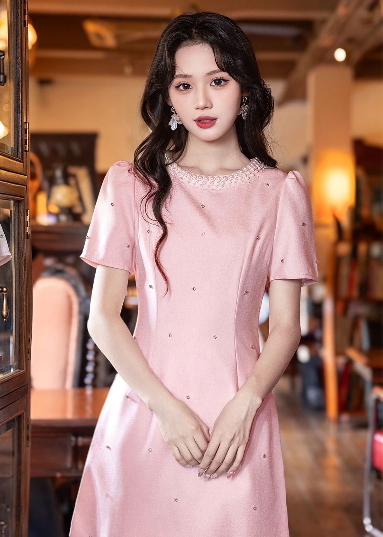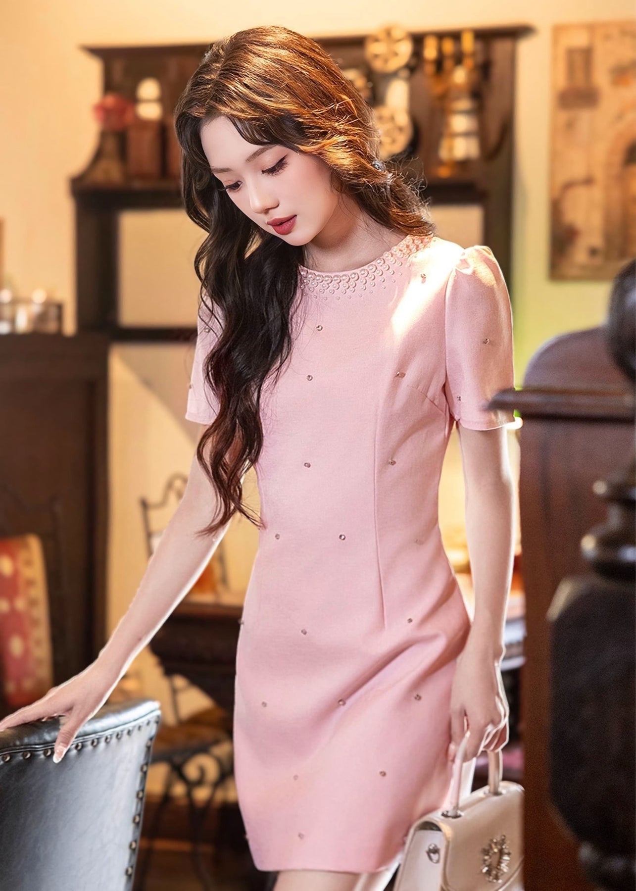 淡いピンクカラーが優しく肌を包み込み、上品さと可愛らしさを両立したミニドレス。