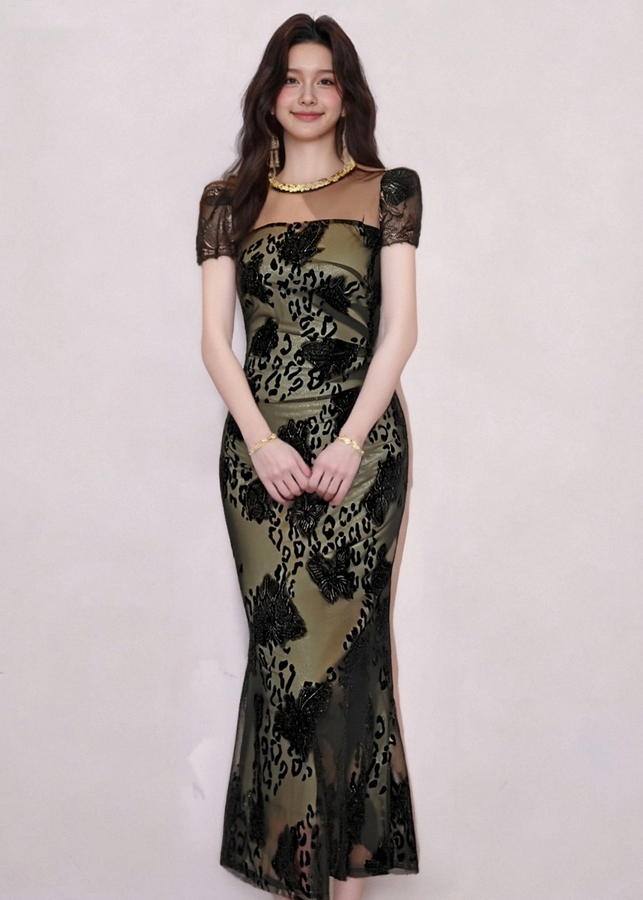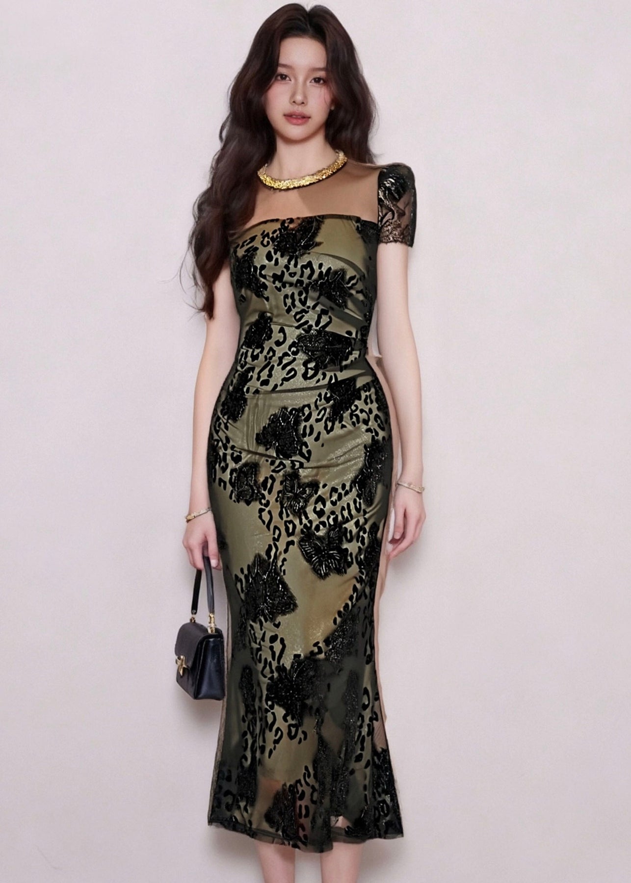 落ち着きのあるカーキカラーに、さりげなく浮かぶレオパード柄を重ねた、洗練されたマーメイドドレス。