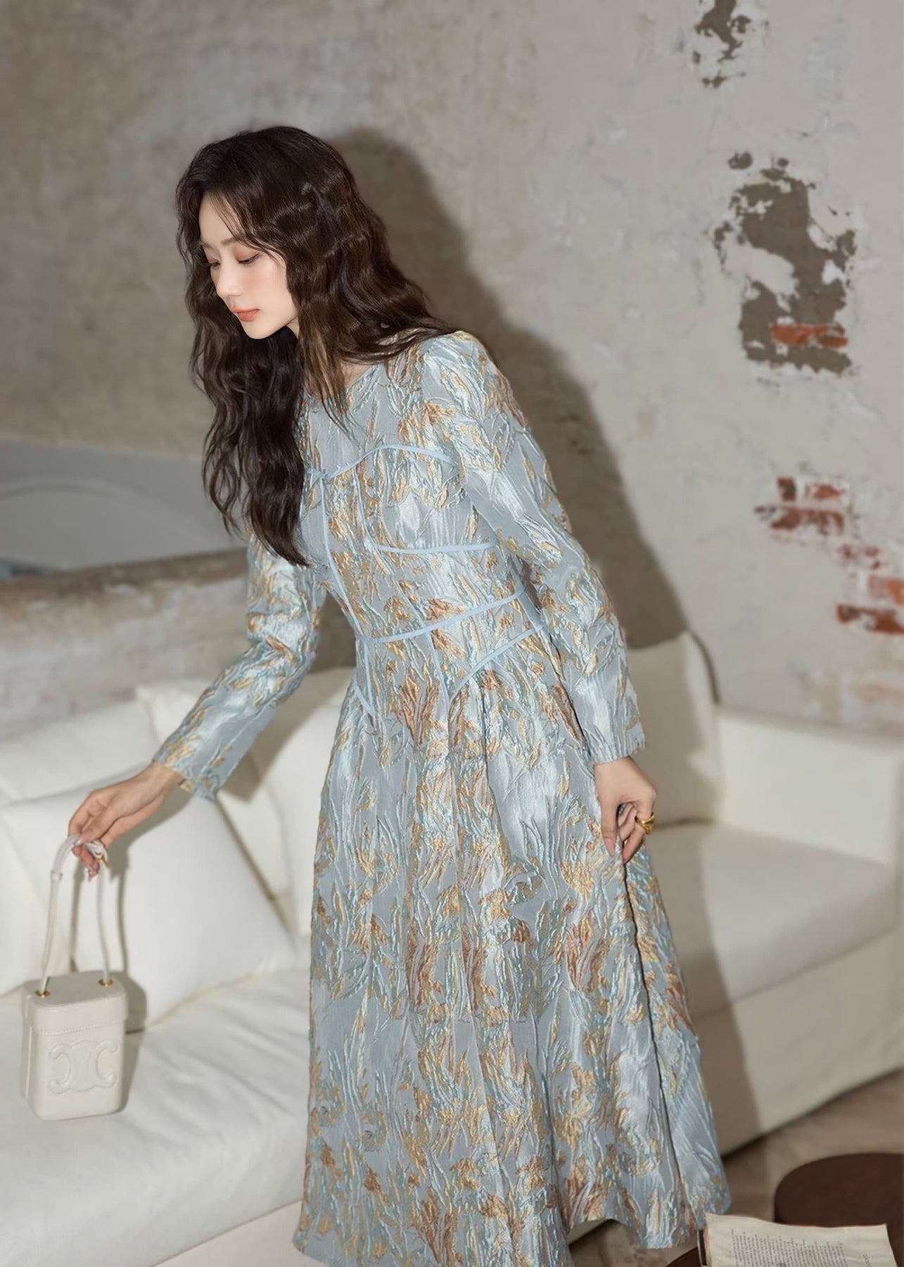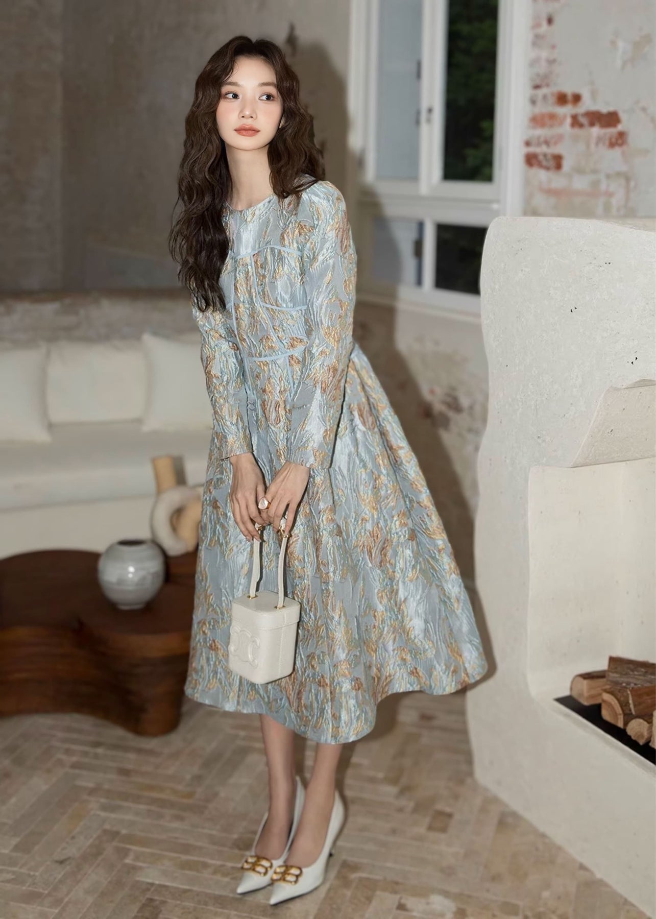 光沢感のあるジャガード素材が、動くたびに優美な輝きを放ち、まるでヴィンテージドレスのような存在感を演出します。