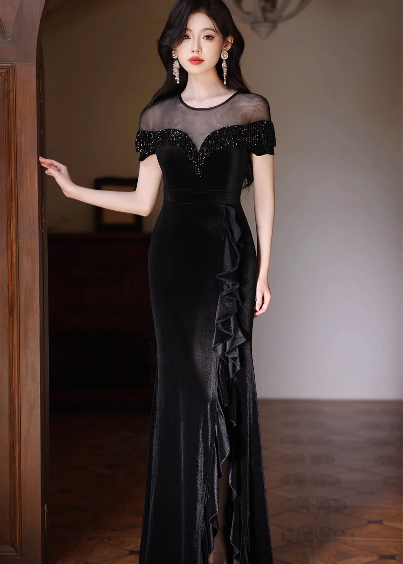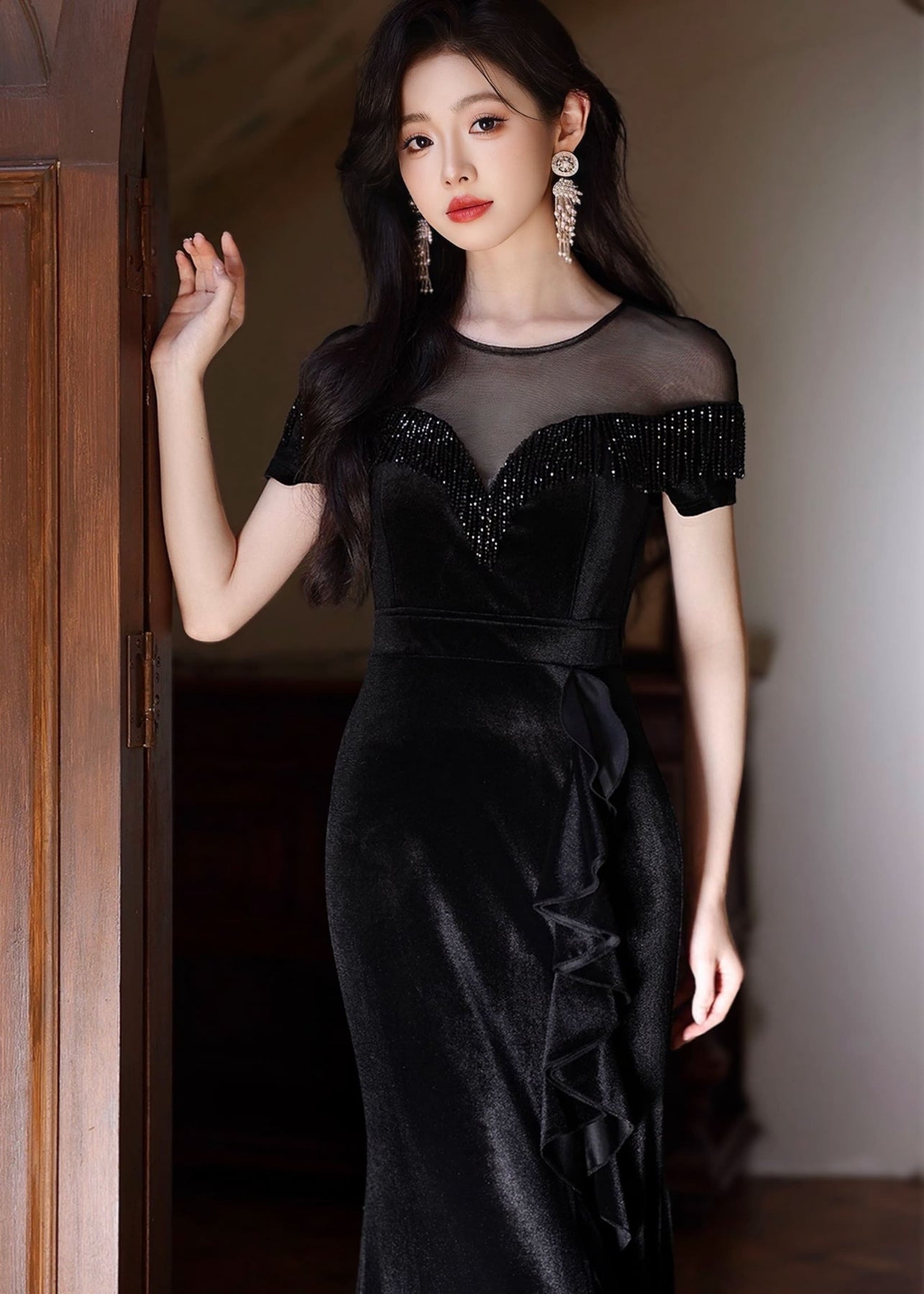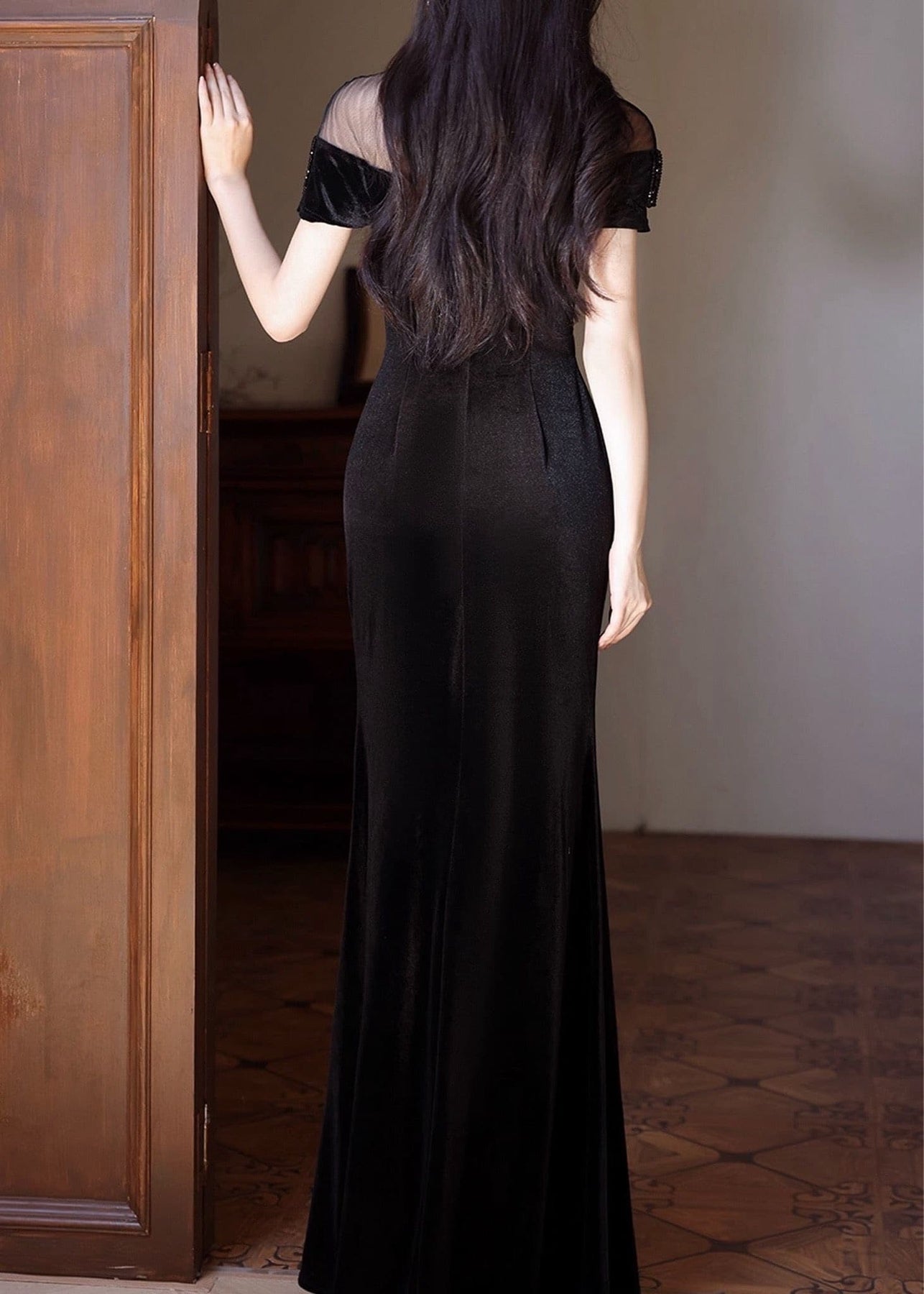 上品な艶を放つベルベット素材と、デコルテを美しく透かすシアーデザインが絶妙にマッチしたロングドレス。