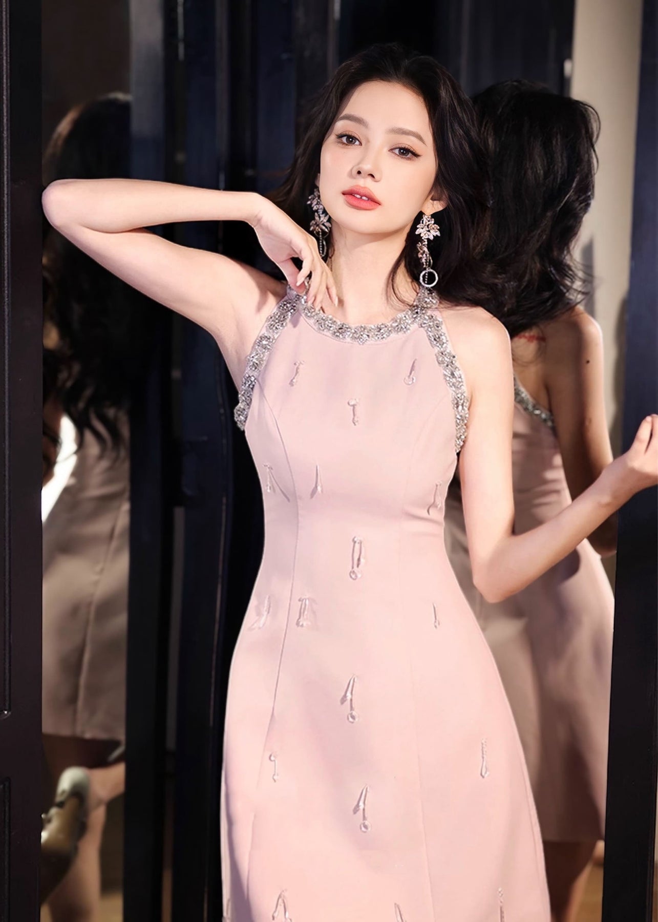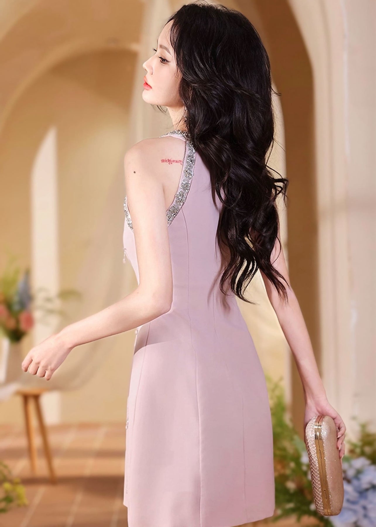 繊細に輝くスパンコールとビジューが首元をぐるりと飾る、華やかでエレガントなミニドレス。