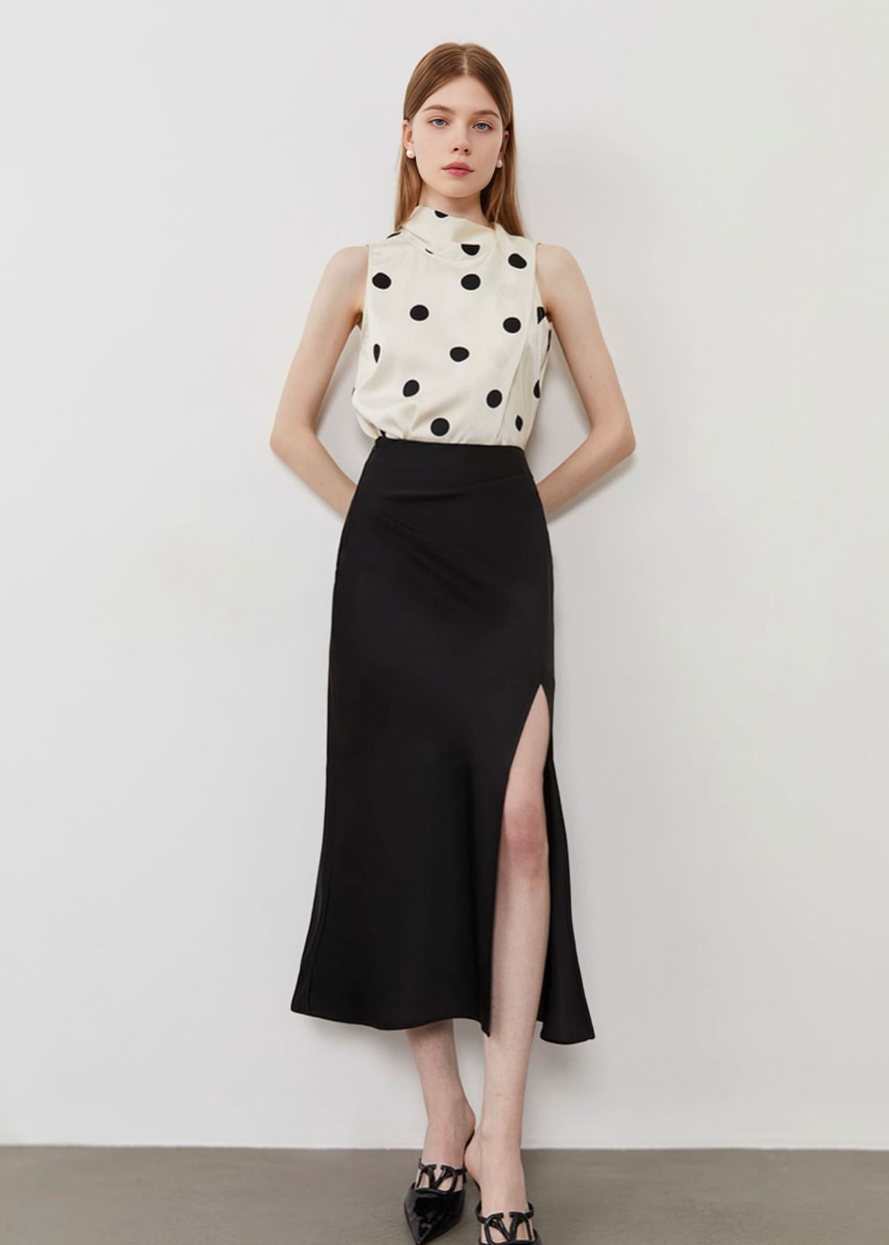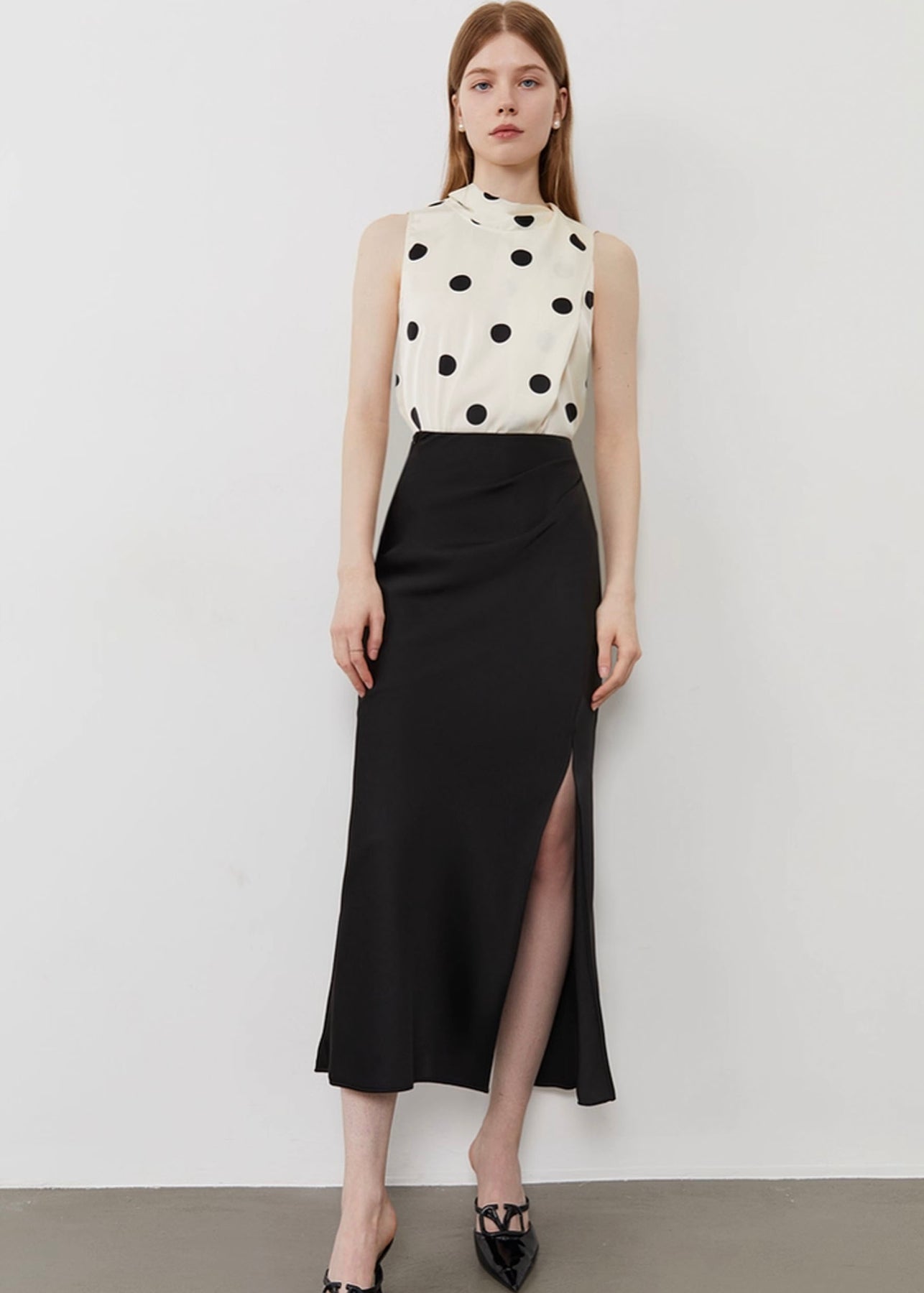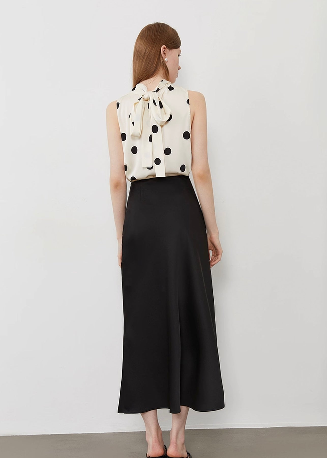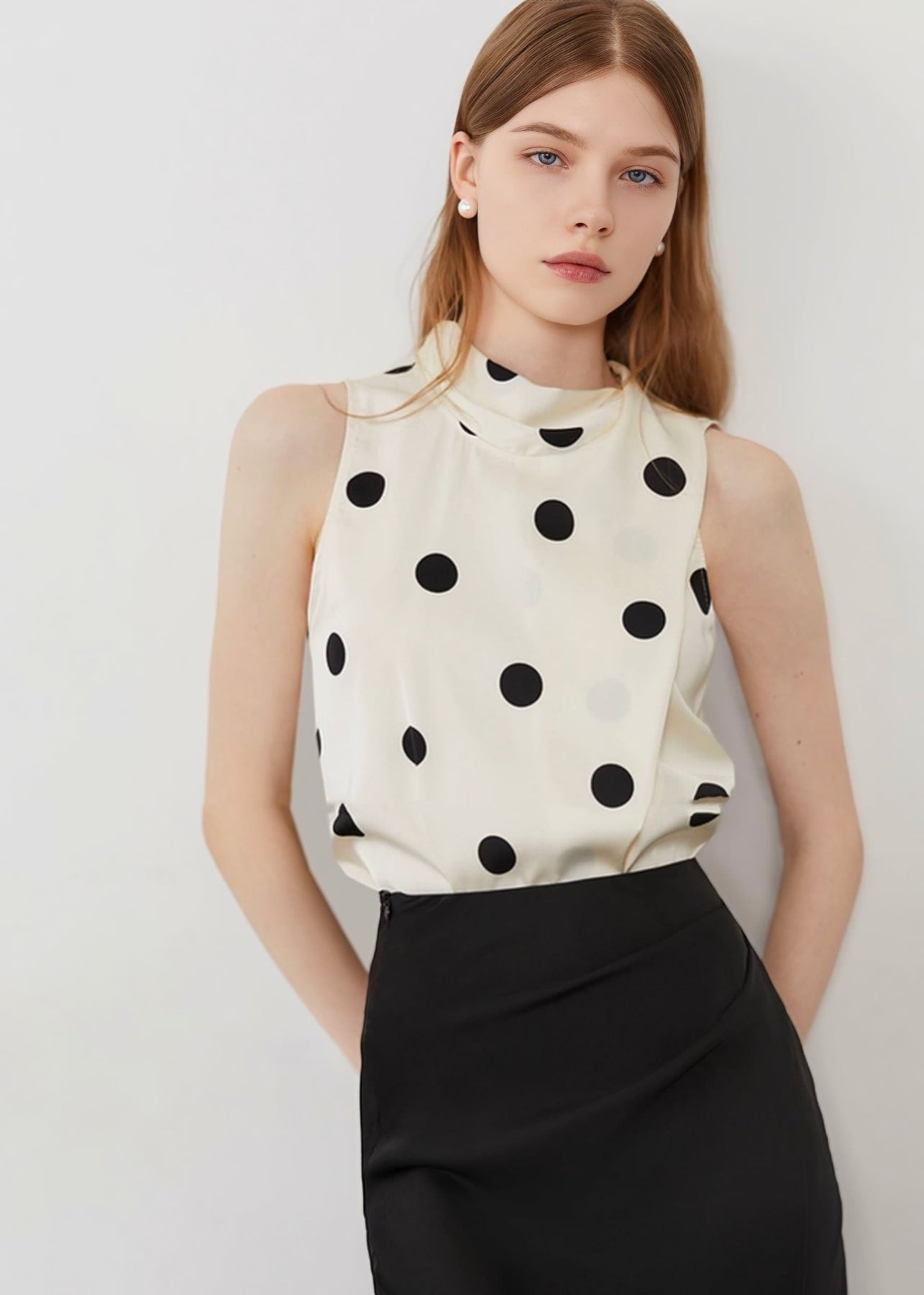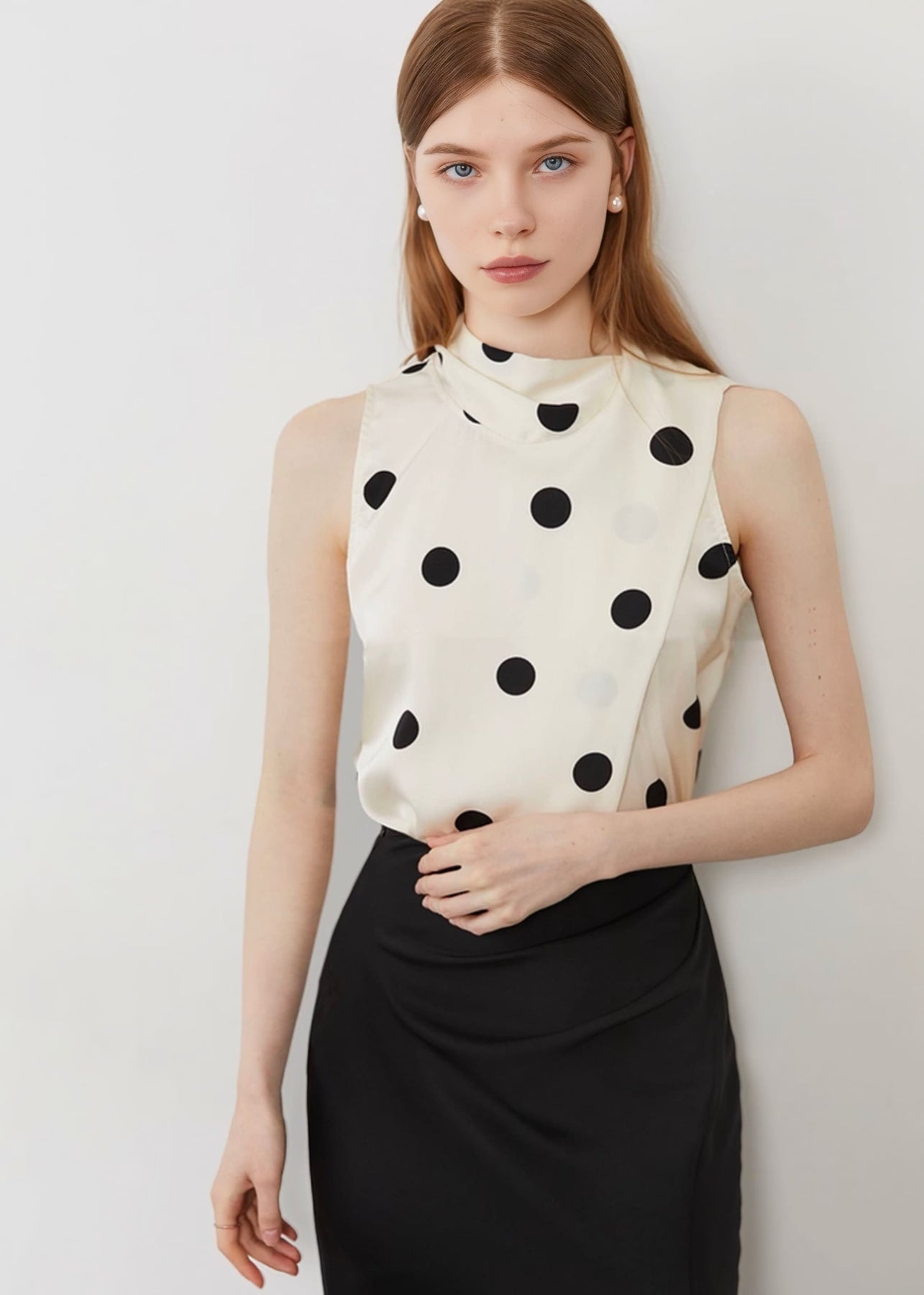 クラシカルなドット柄をモダンに仕上げた、サテン調ノースリーブブラウス。