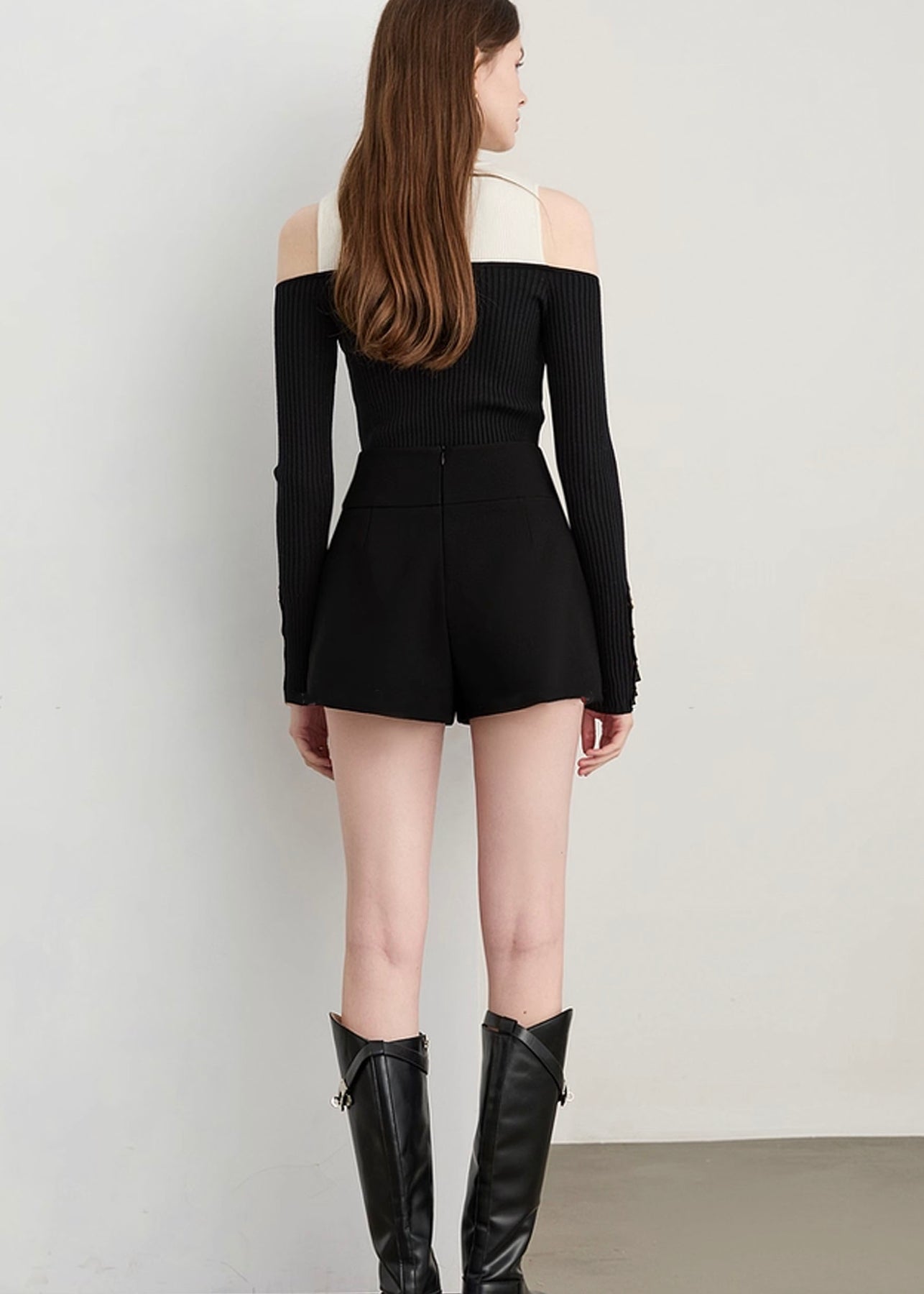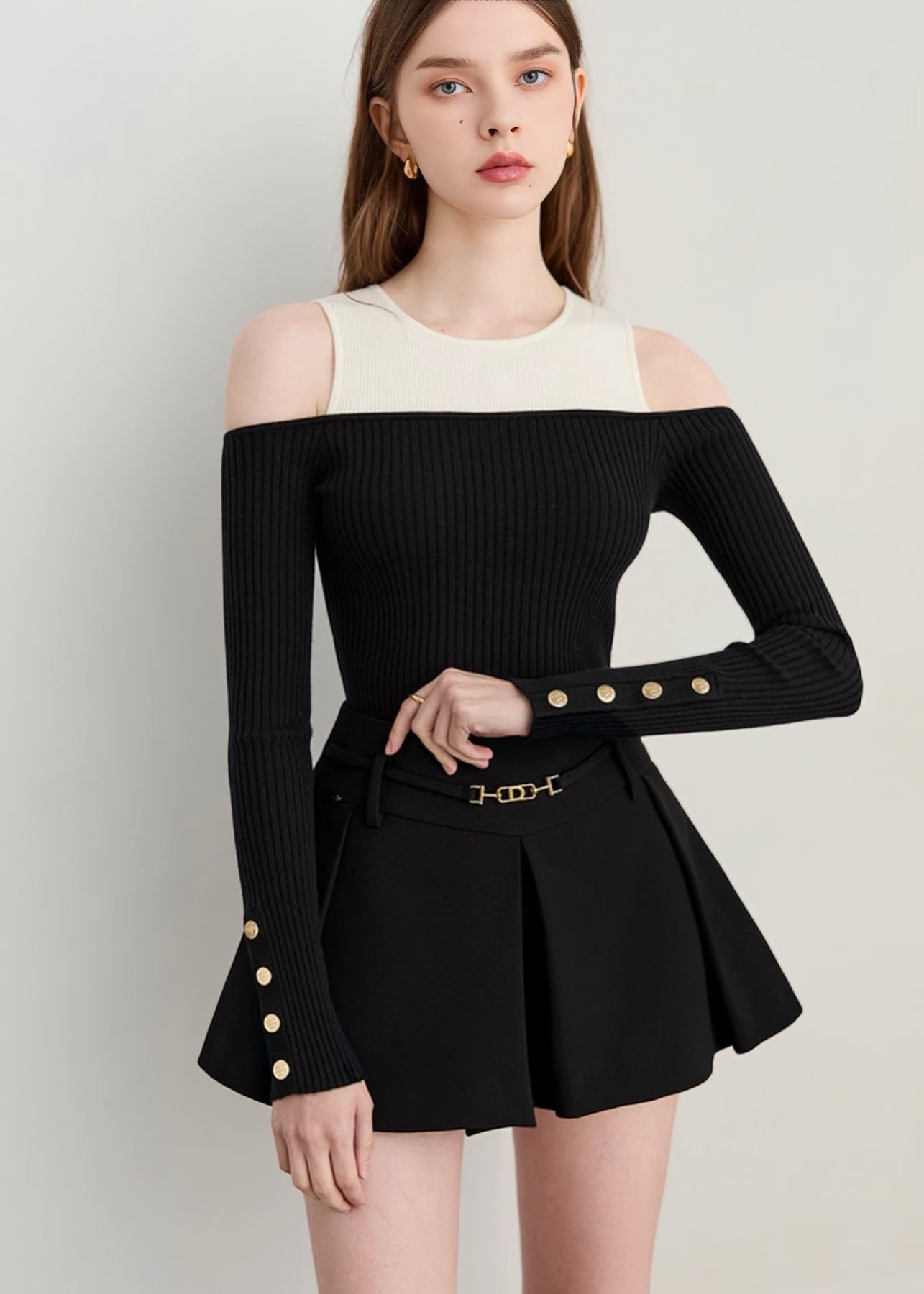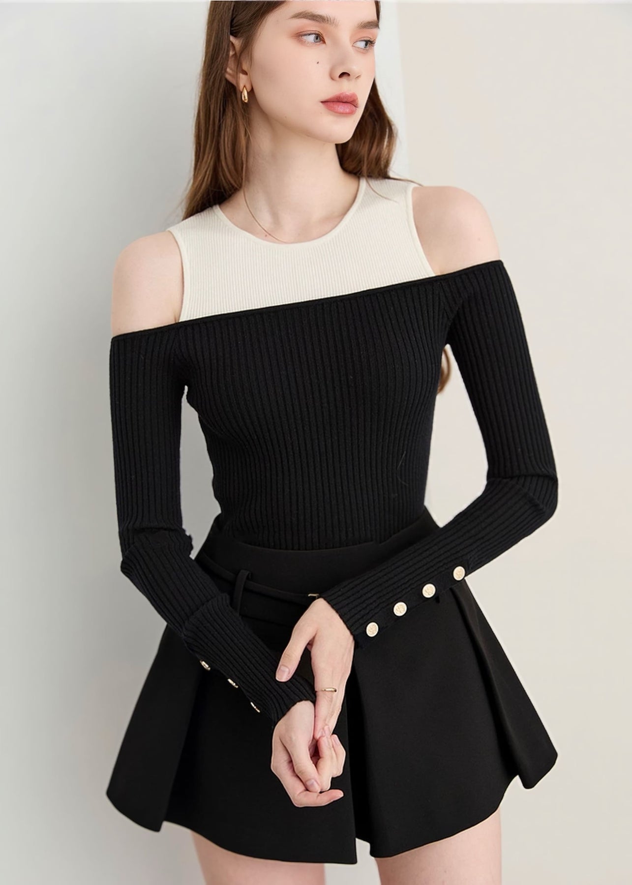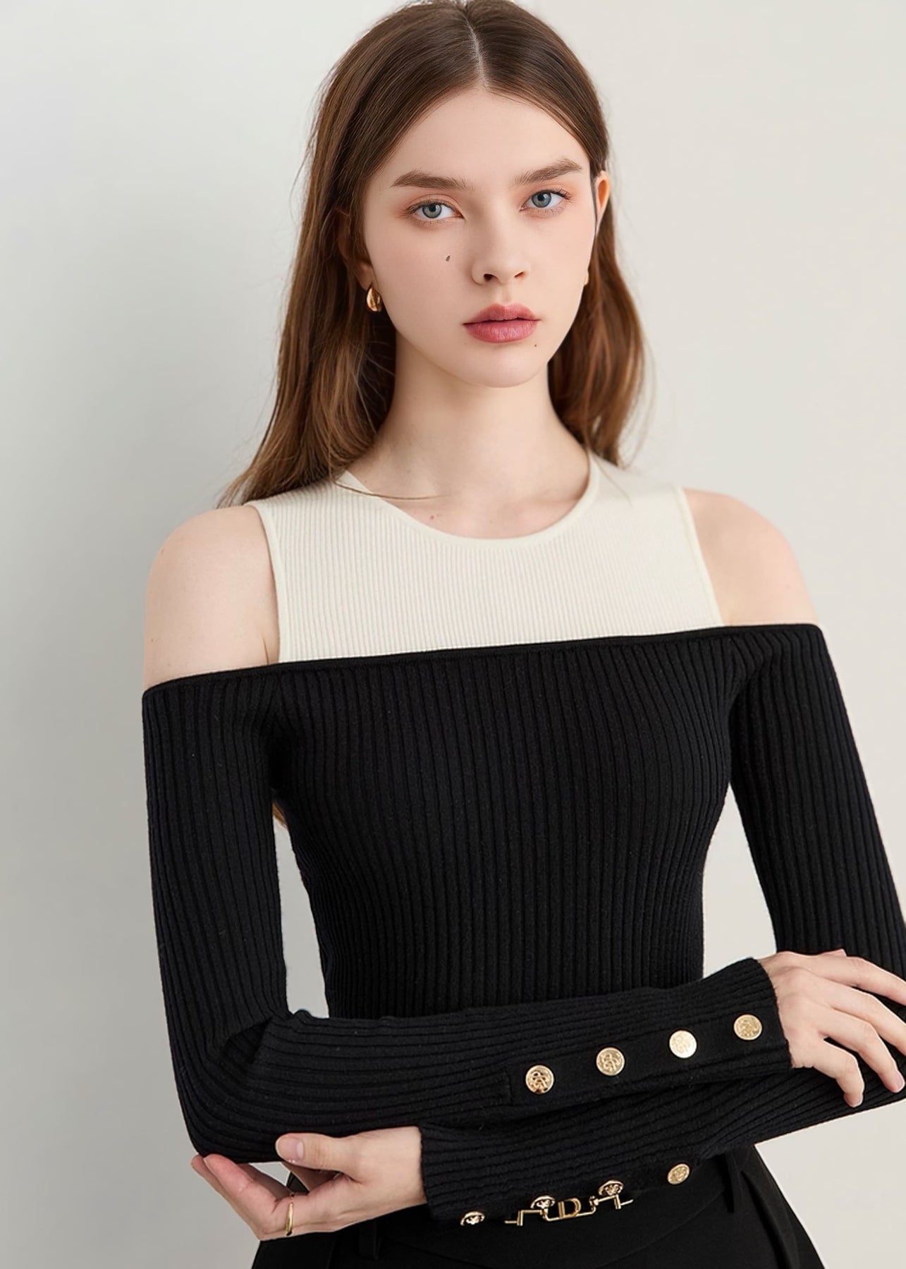 モードな表情と女性らしさを兼ね備えた、オープンショルダーデザインのリブニットトップス。