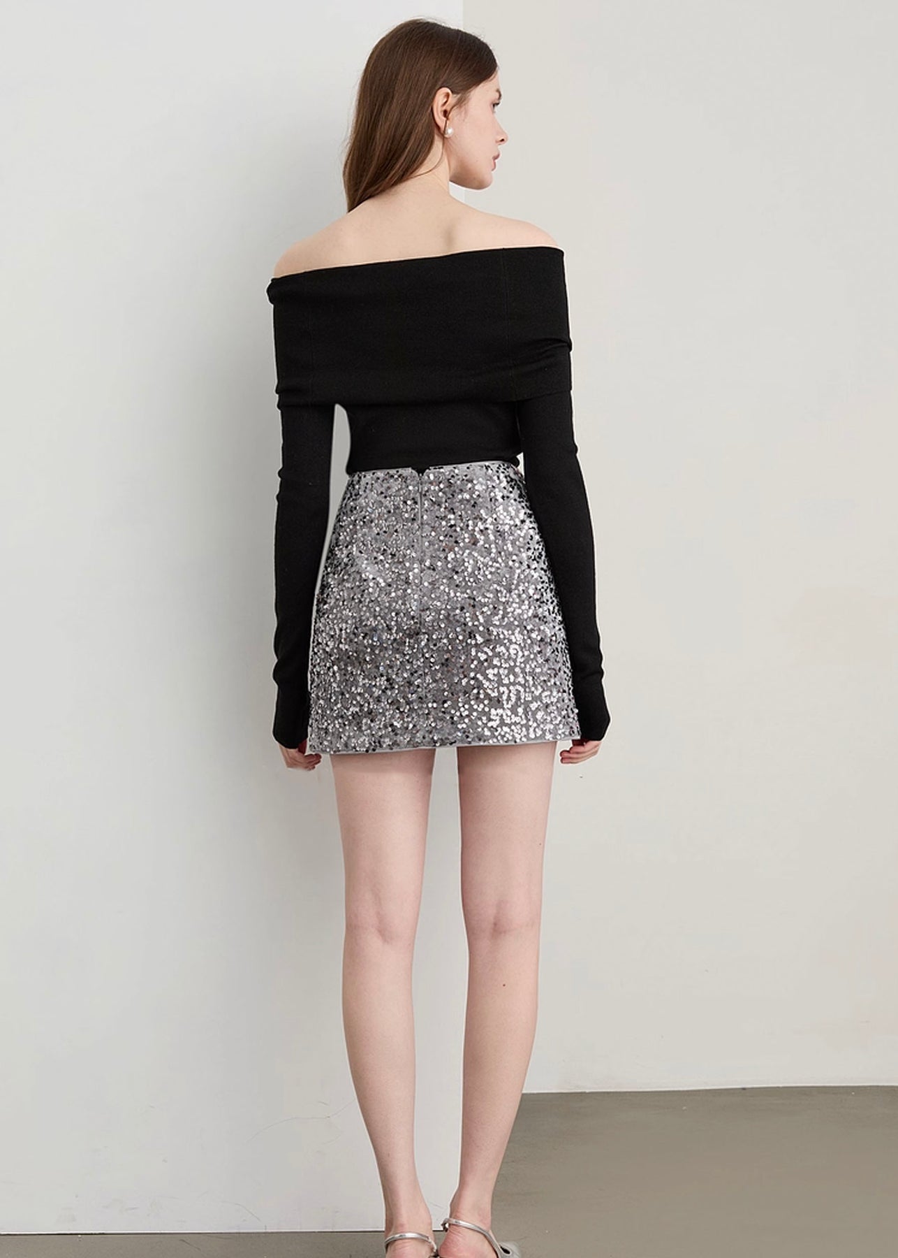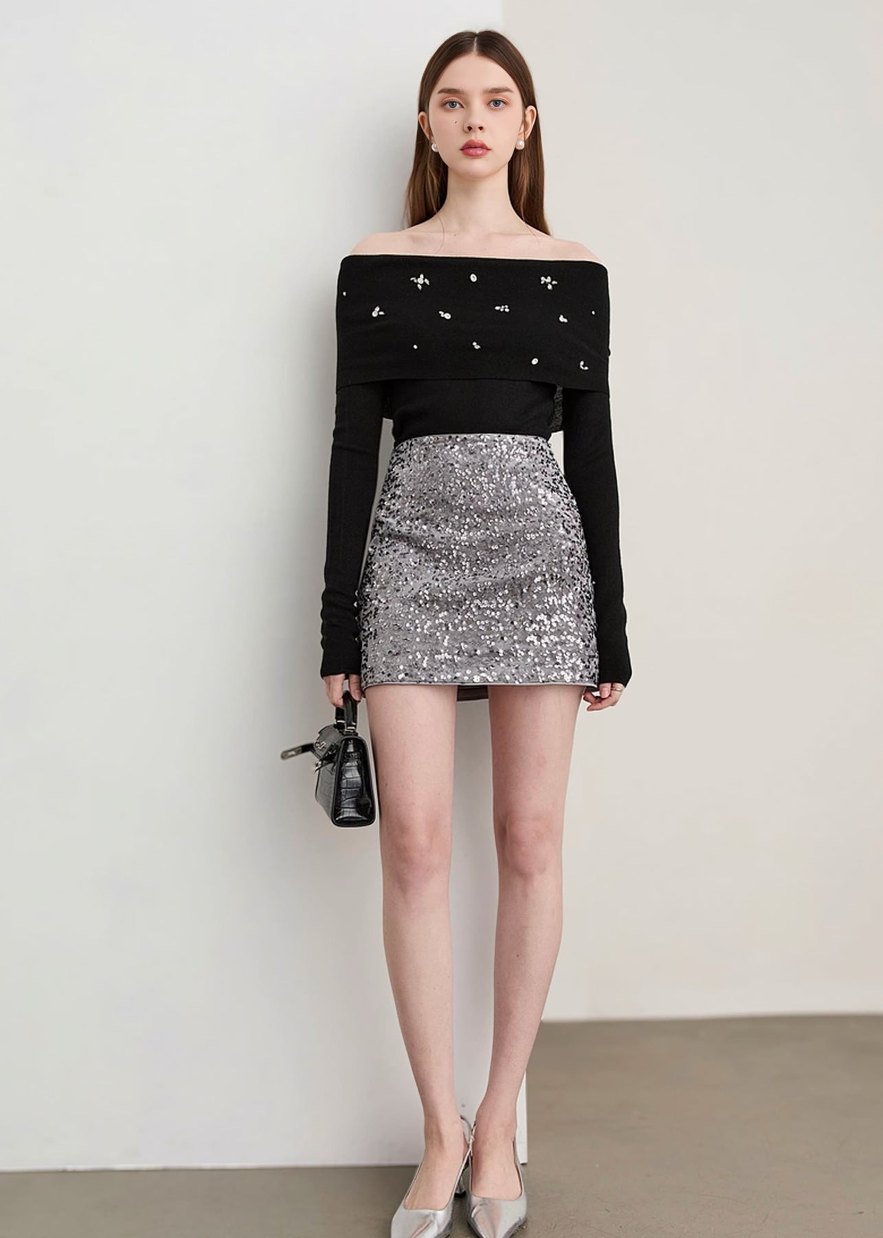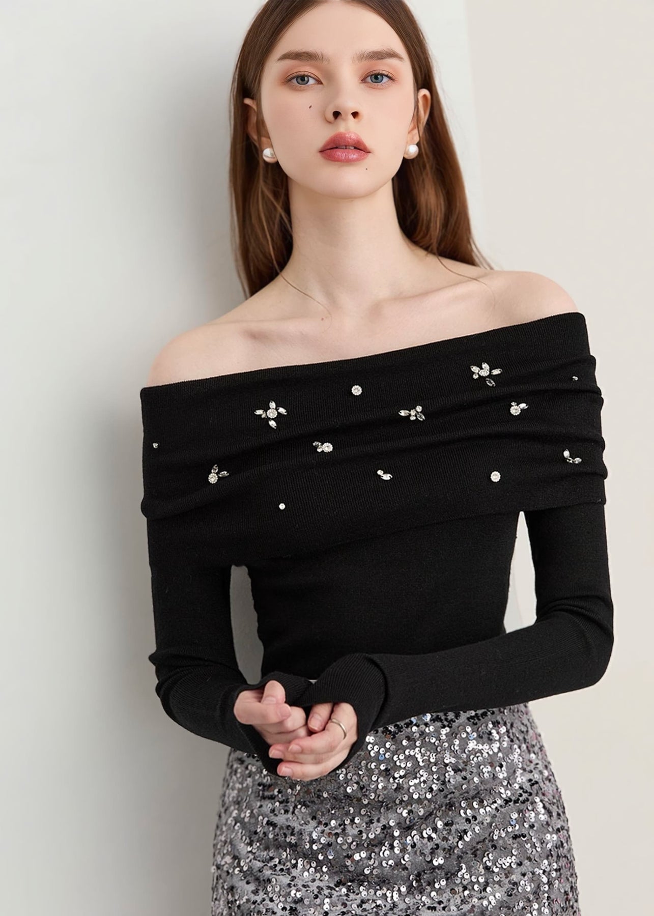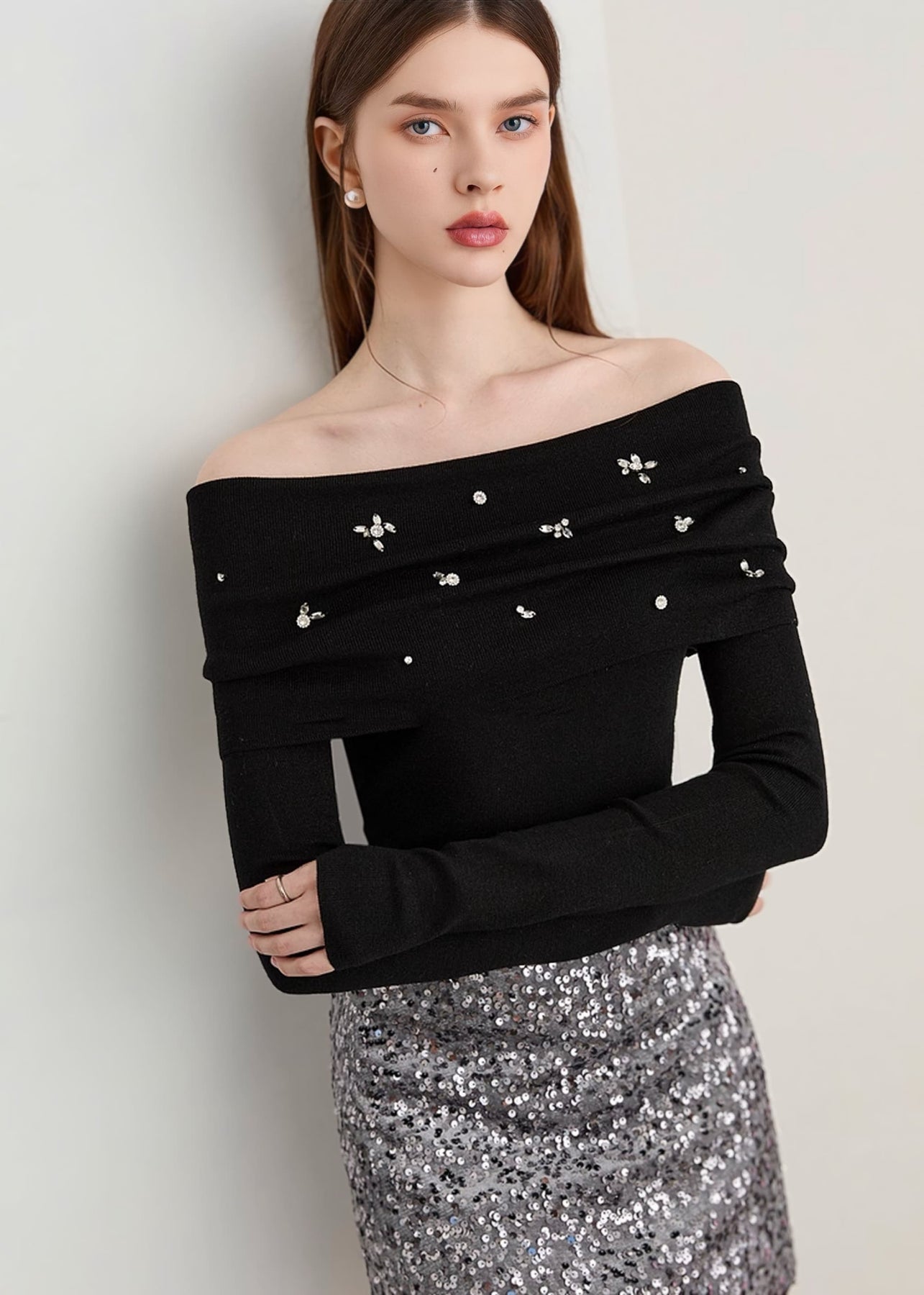 太めに切り替えられたオフショル部分にはビジューをあしらい、シンプルな中に華やかな輝きをプラスしました。