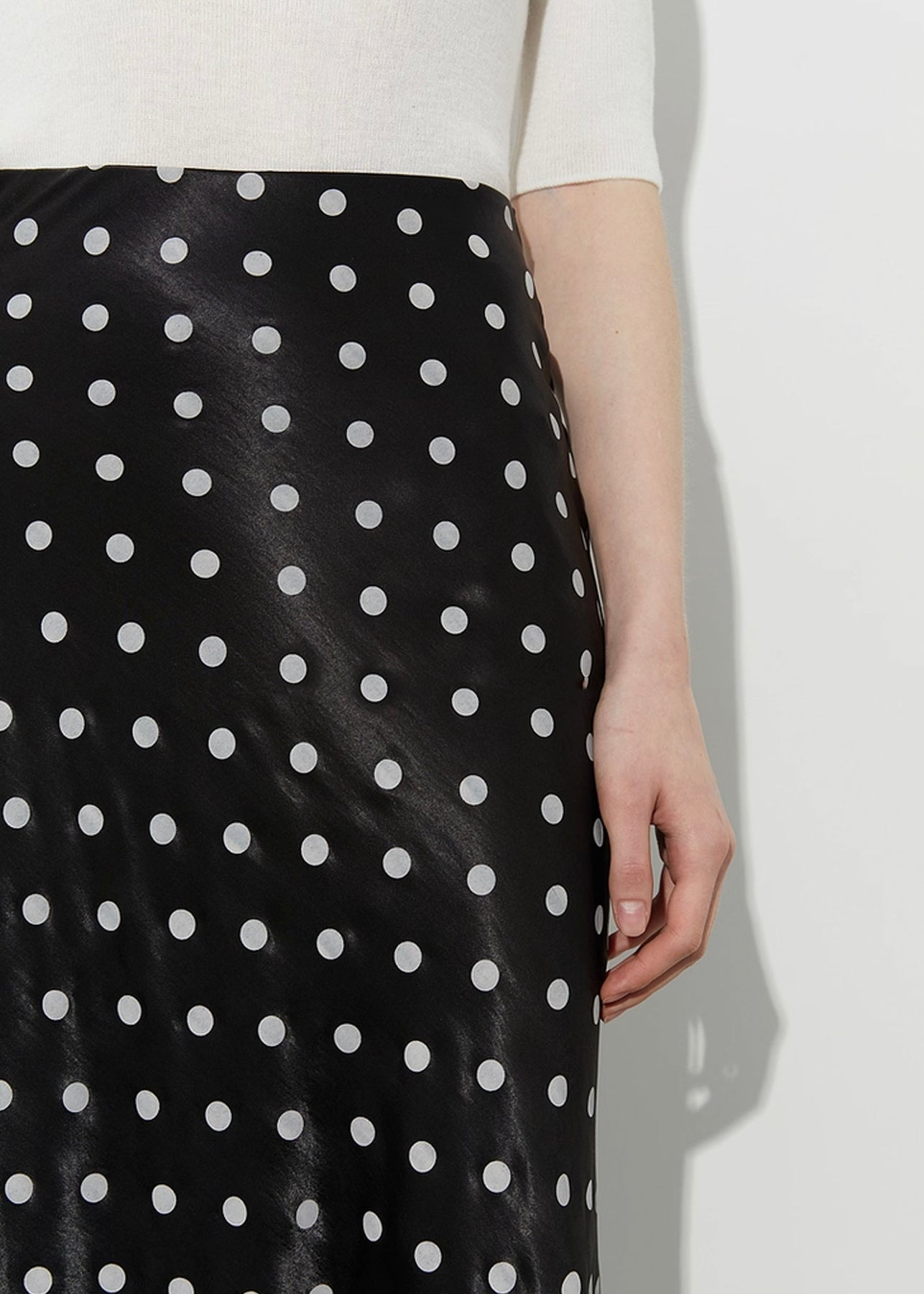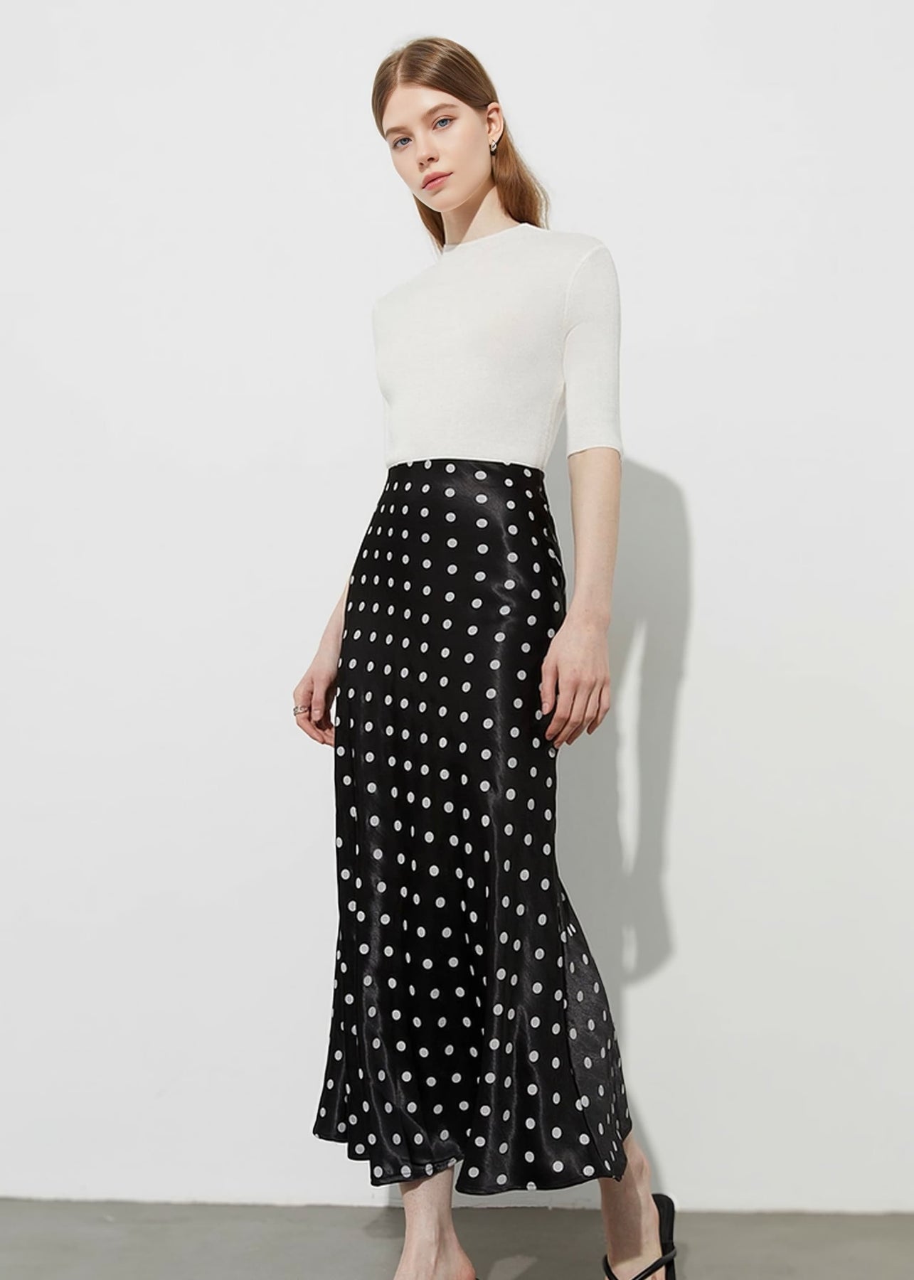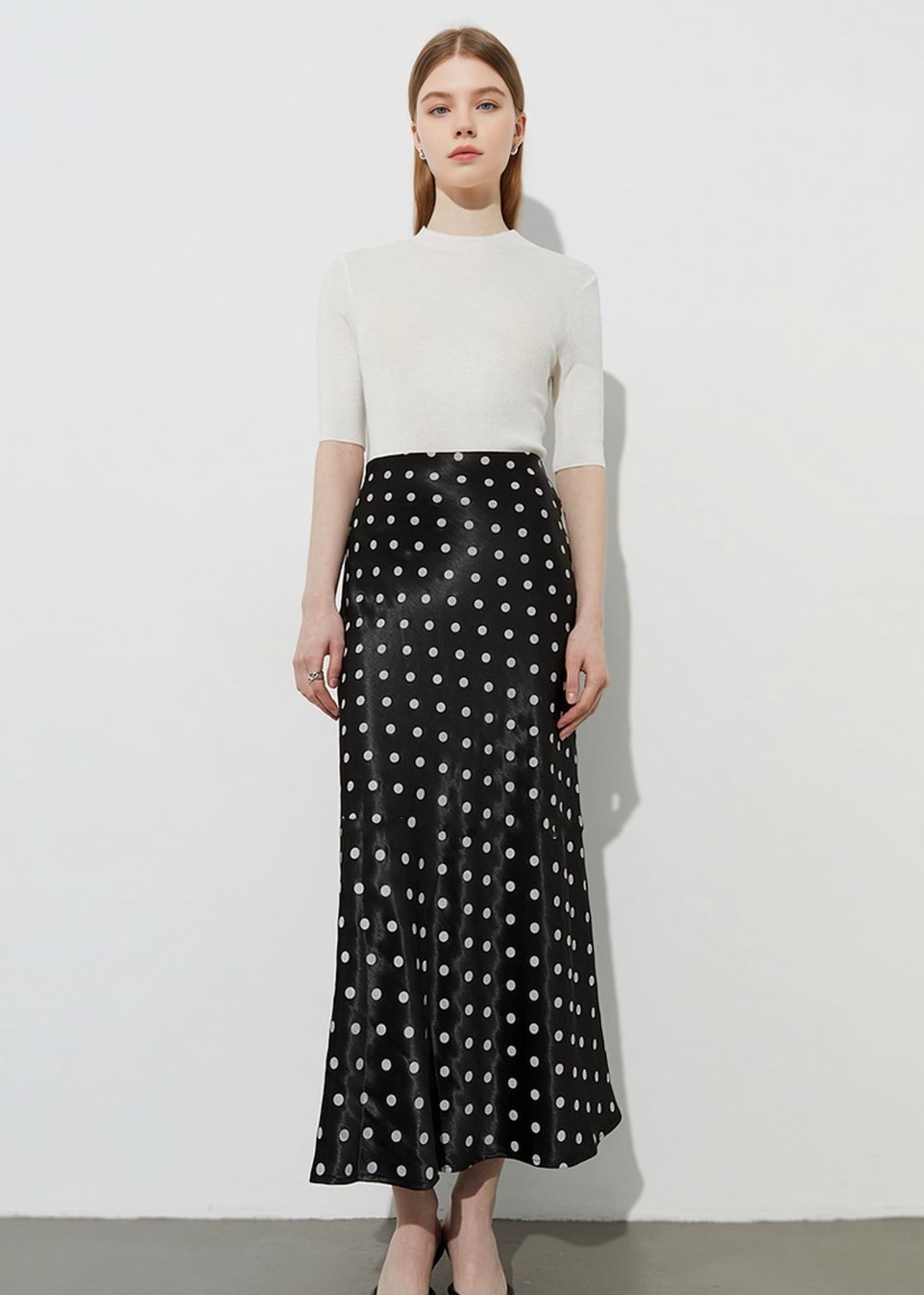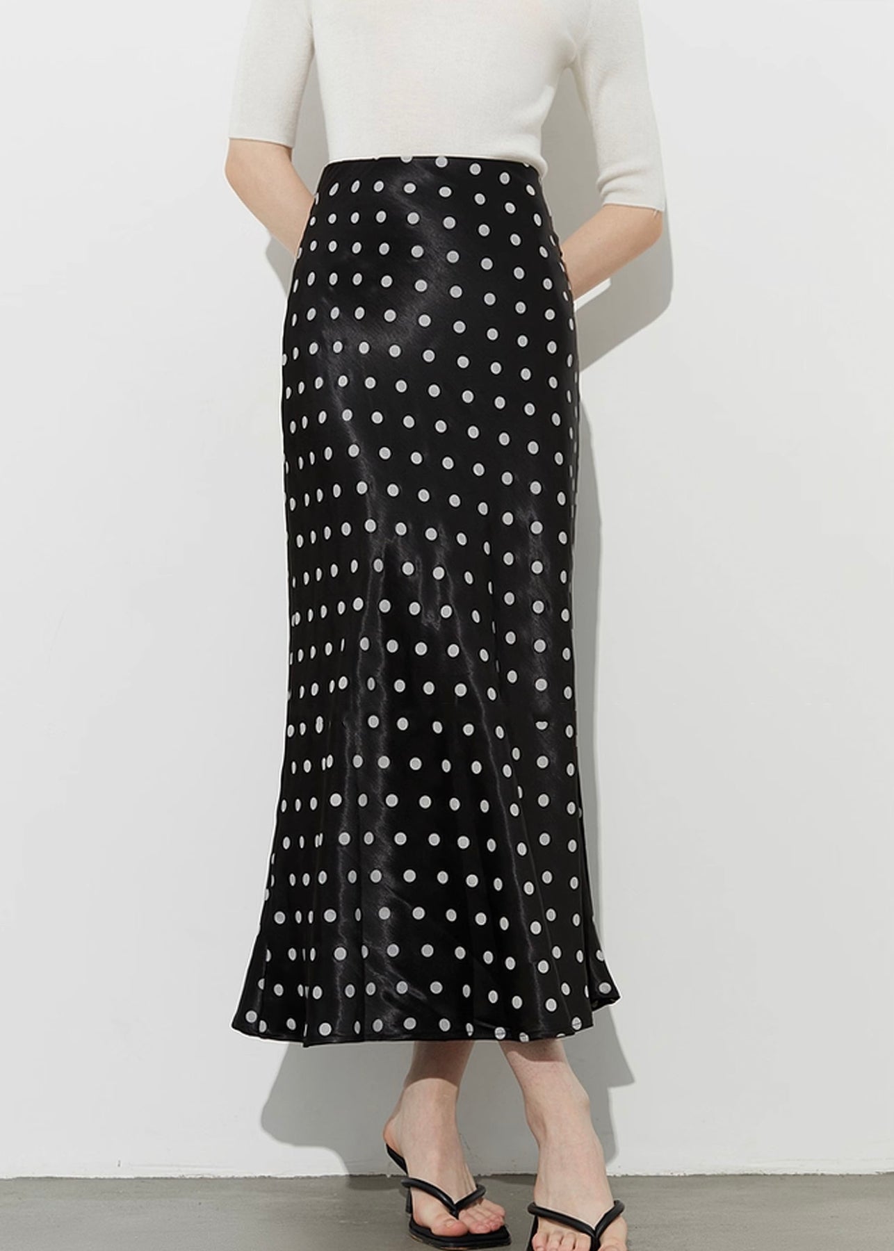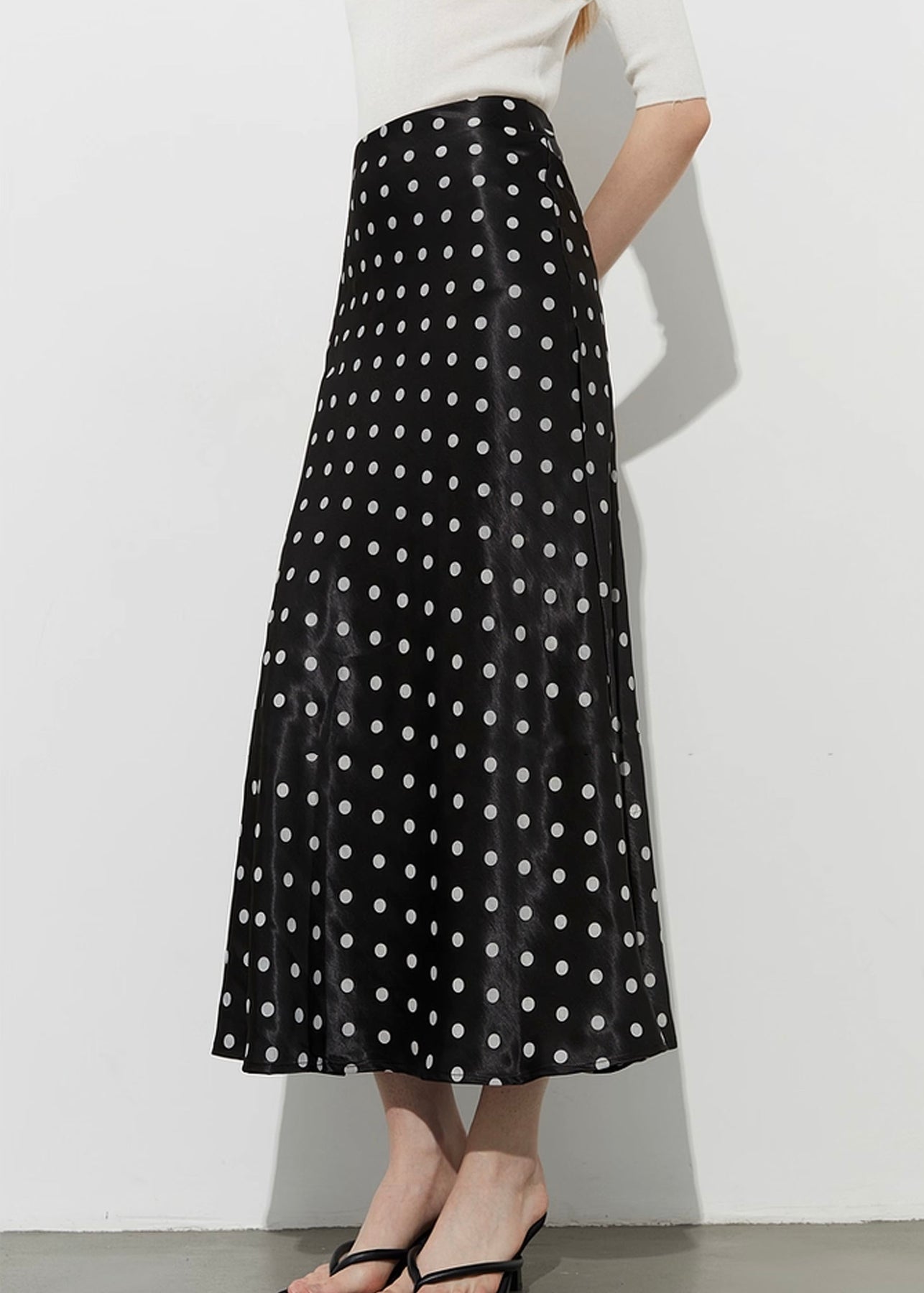 オンにもオフにも取り入れやすく、季節を問わず活躍するアイテム。トレンド感と女性らしさを両立した、大人のためのドットスカートです。