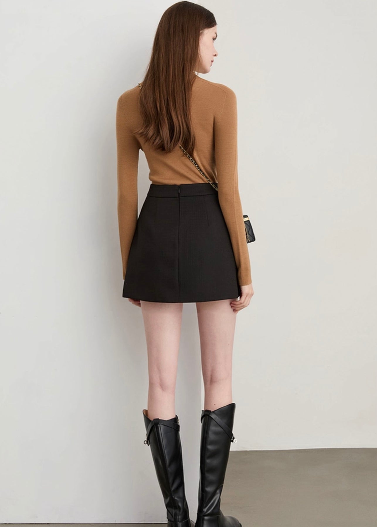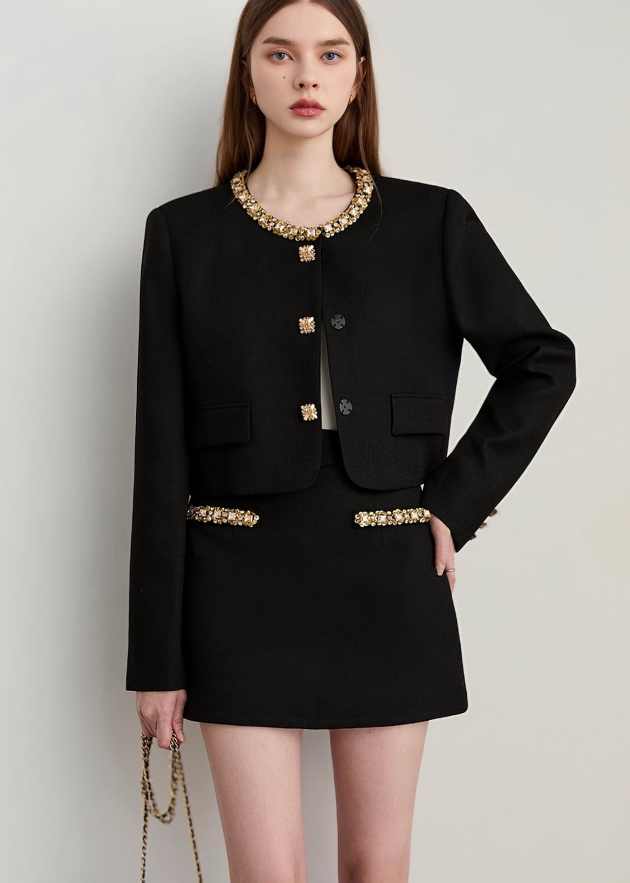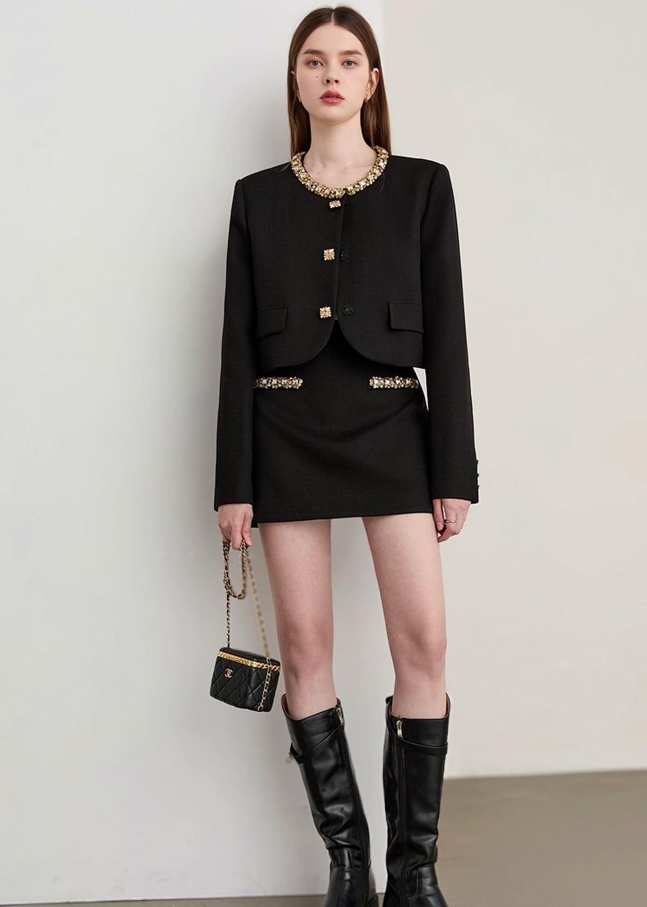 シンプルなブラックに煌めくビジューディテールが映える、タイトミニスカート。