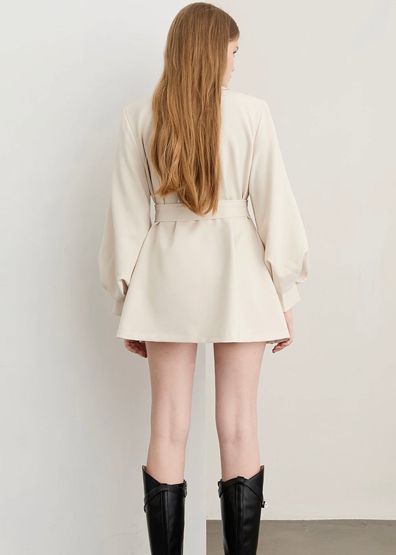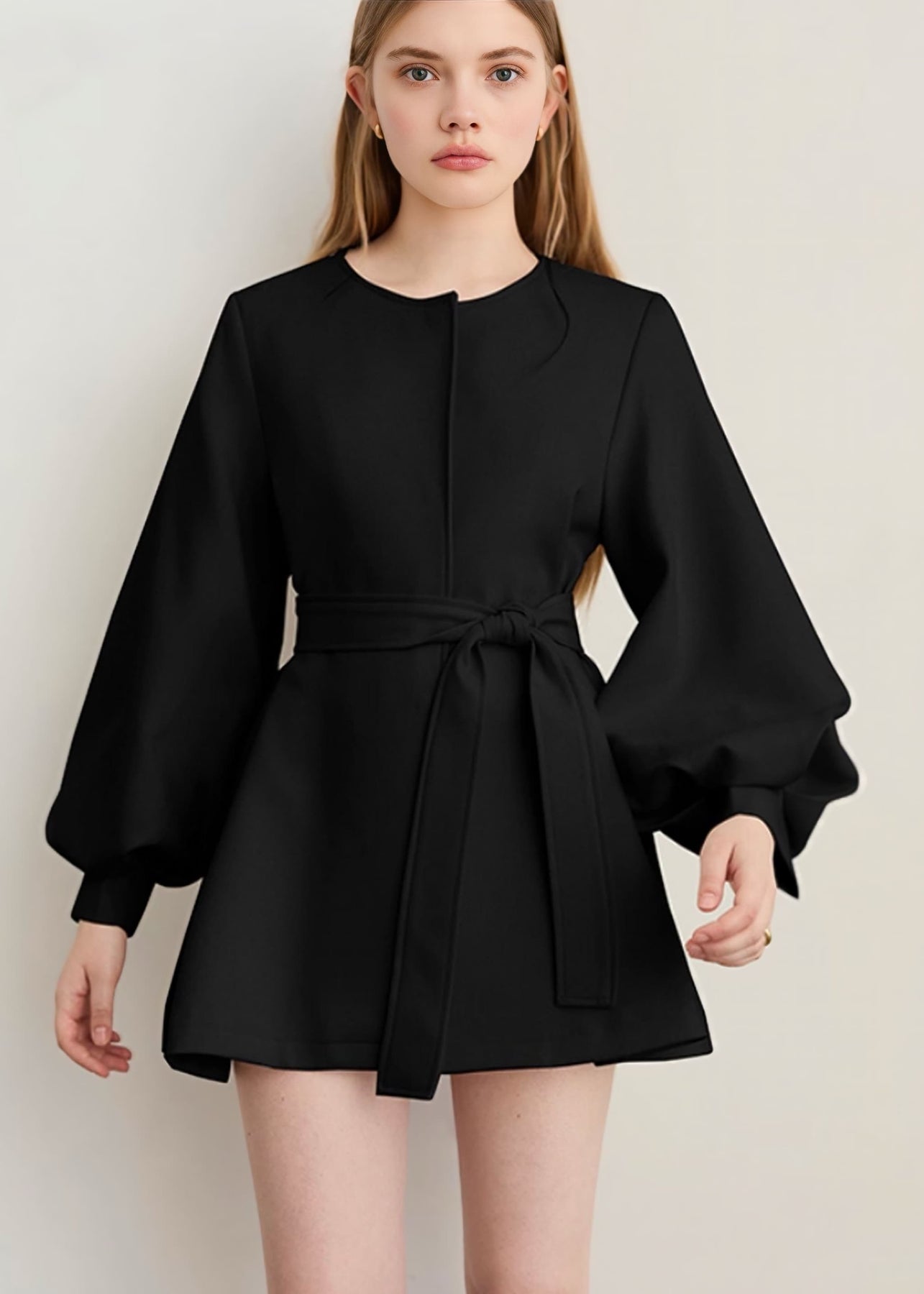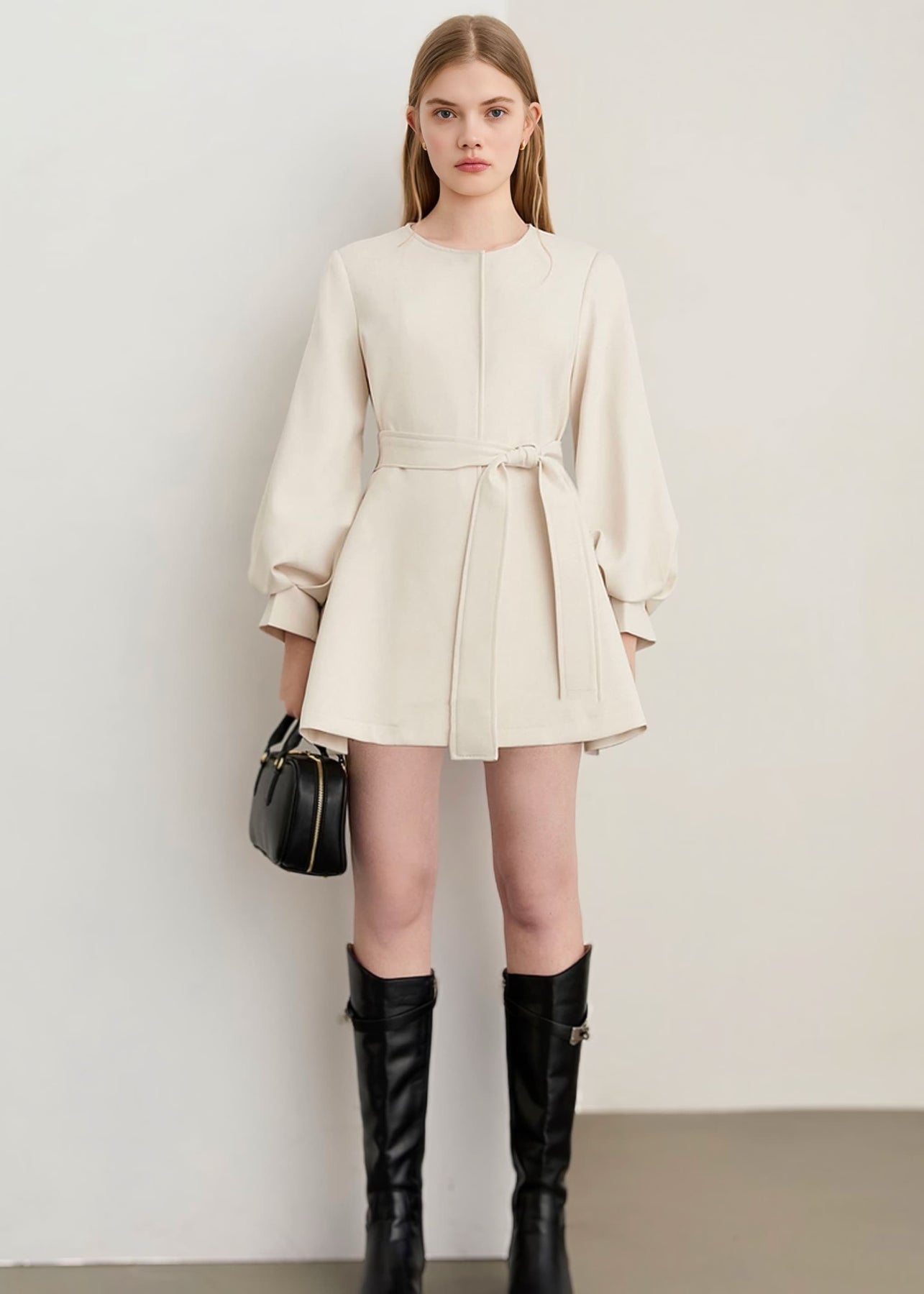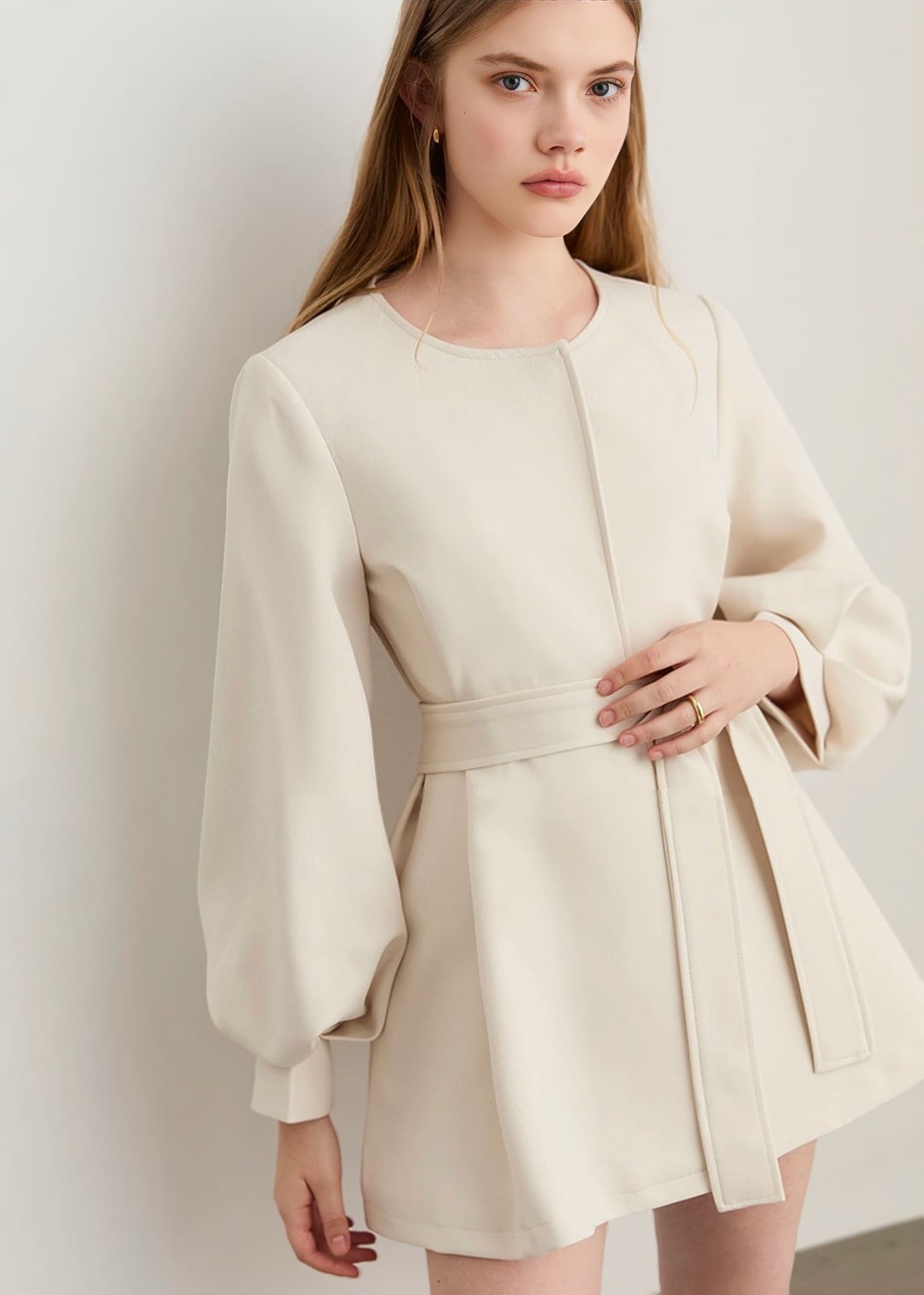 ラウンドネックのすっきりとしたデザインに、ふんわりとしたバルーンスリーブを掛け合わせ、甘さと上品さを絶妙にバランスさせました。ミニ丈のフィットアンドフレアシルエットは、女性らしい曲線美を引き立てつつも軽やかさをプラス。