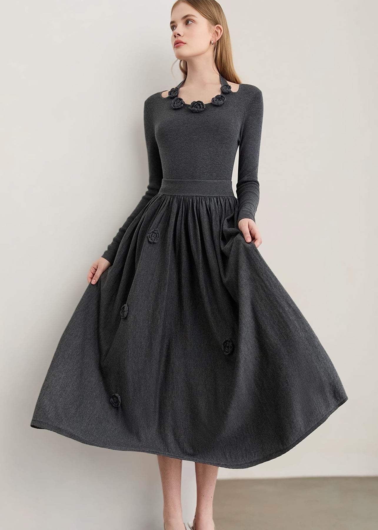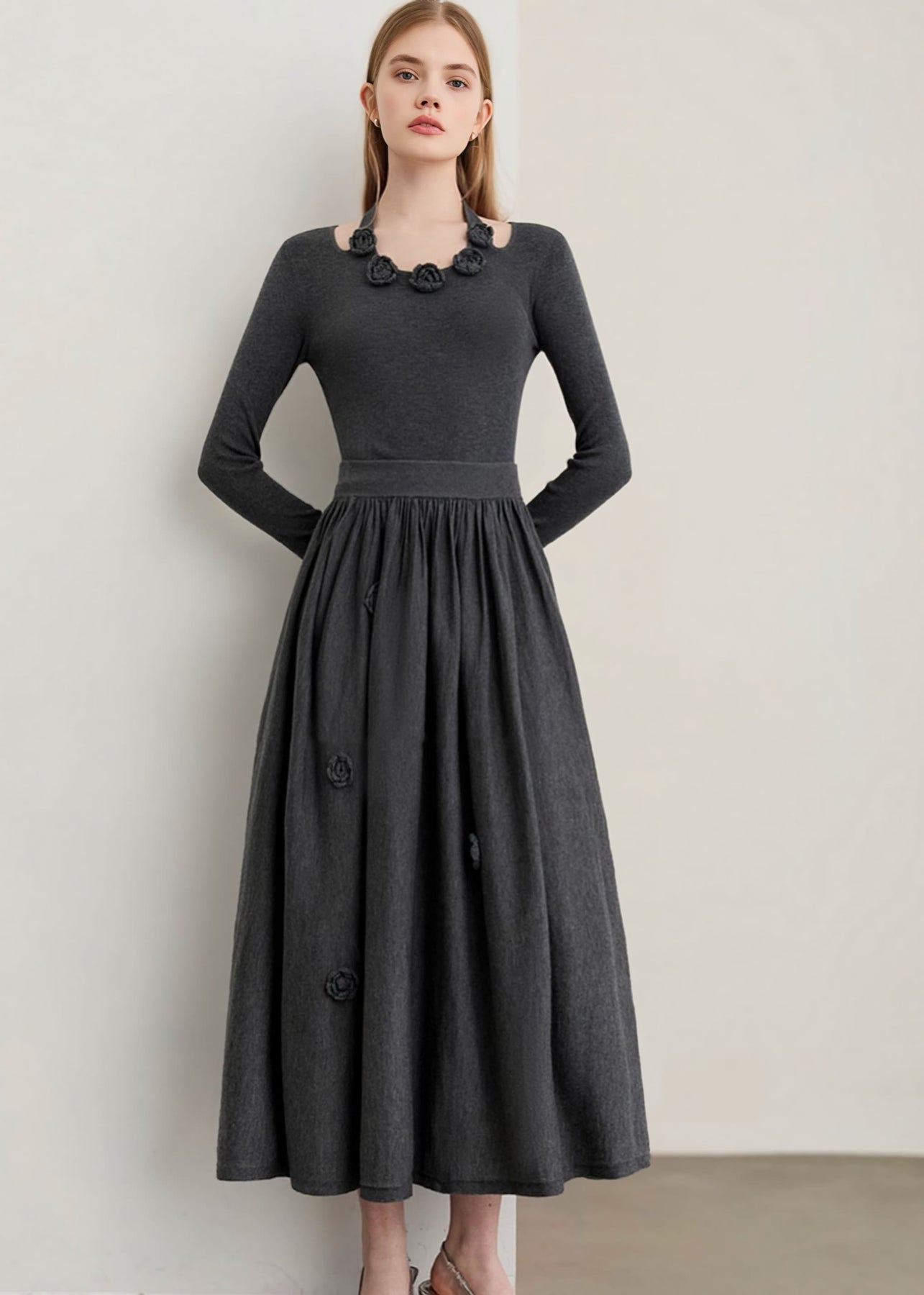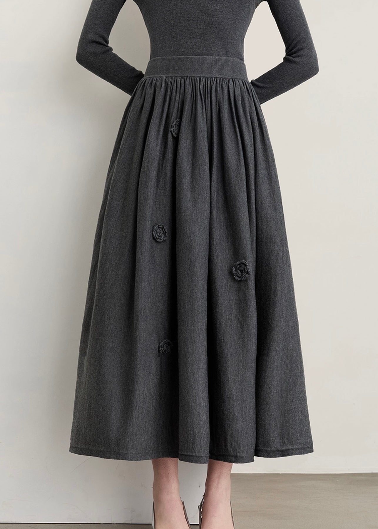上品さと可憐さを兼ね備えた、フラワーディテールウールニットフレアスカート。たっぷりとギャザーを効かせたロング丈のフレアシルエットが、歩くたびに軽やかな揺れ感を生み出し、女性らしい優雅さを引き立てます。