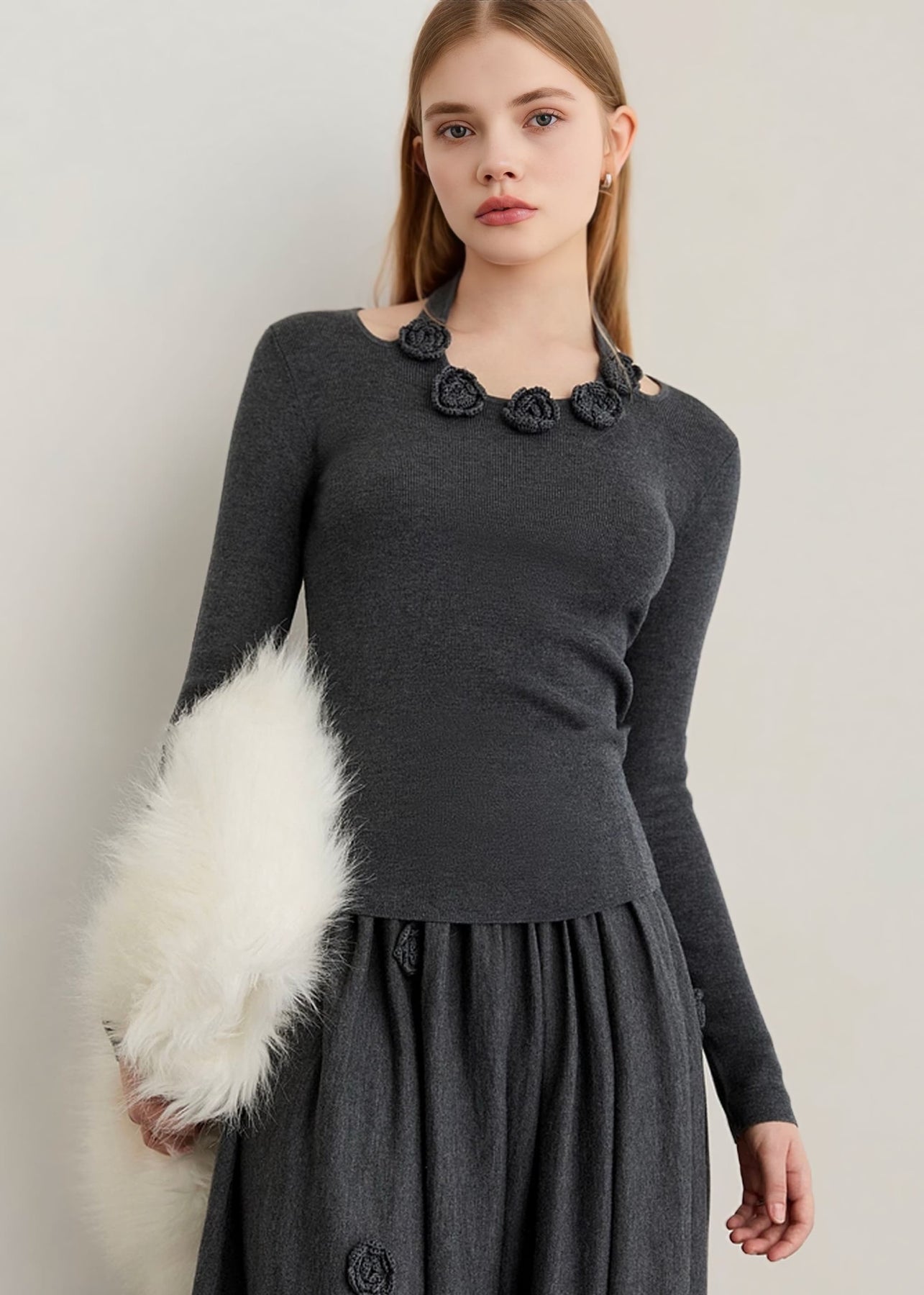 シンプルなチャコールグレーのベースに、立体感のある編み込みで表現されたフラワーモチーフをあしらうことで、控えめながらも華やかさをプラス。落ち着いたトーンの中にさりげなく映えるディテールが、シックで大人らしい印象を与えます。