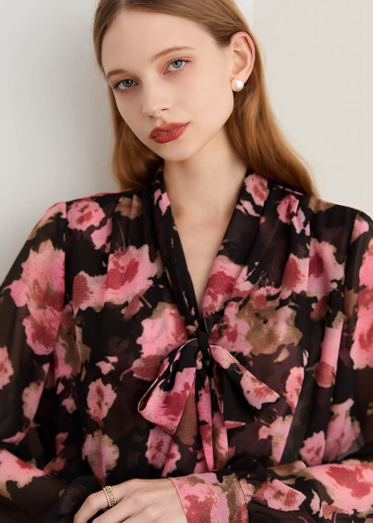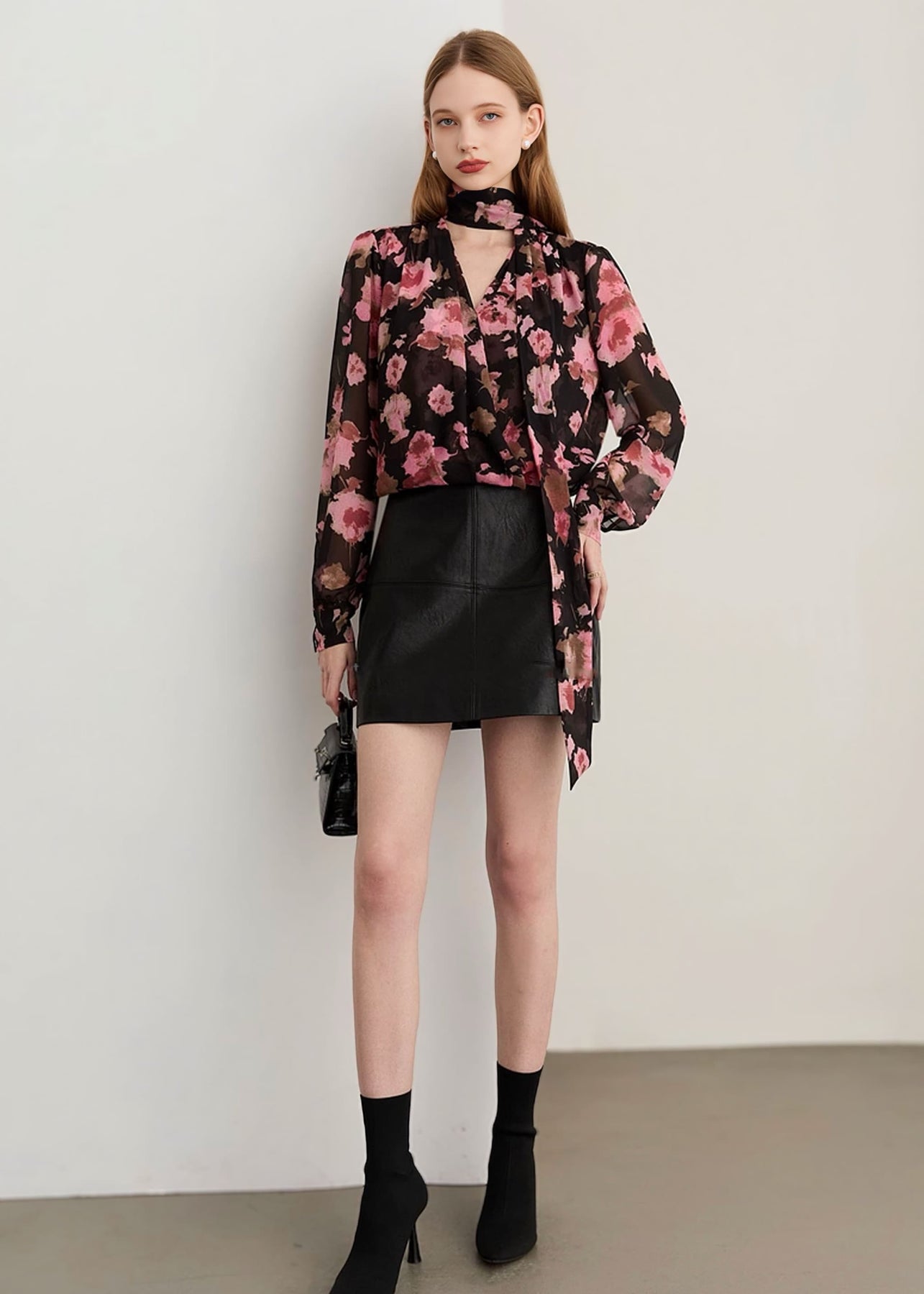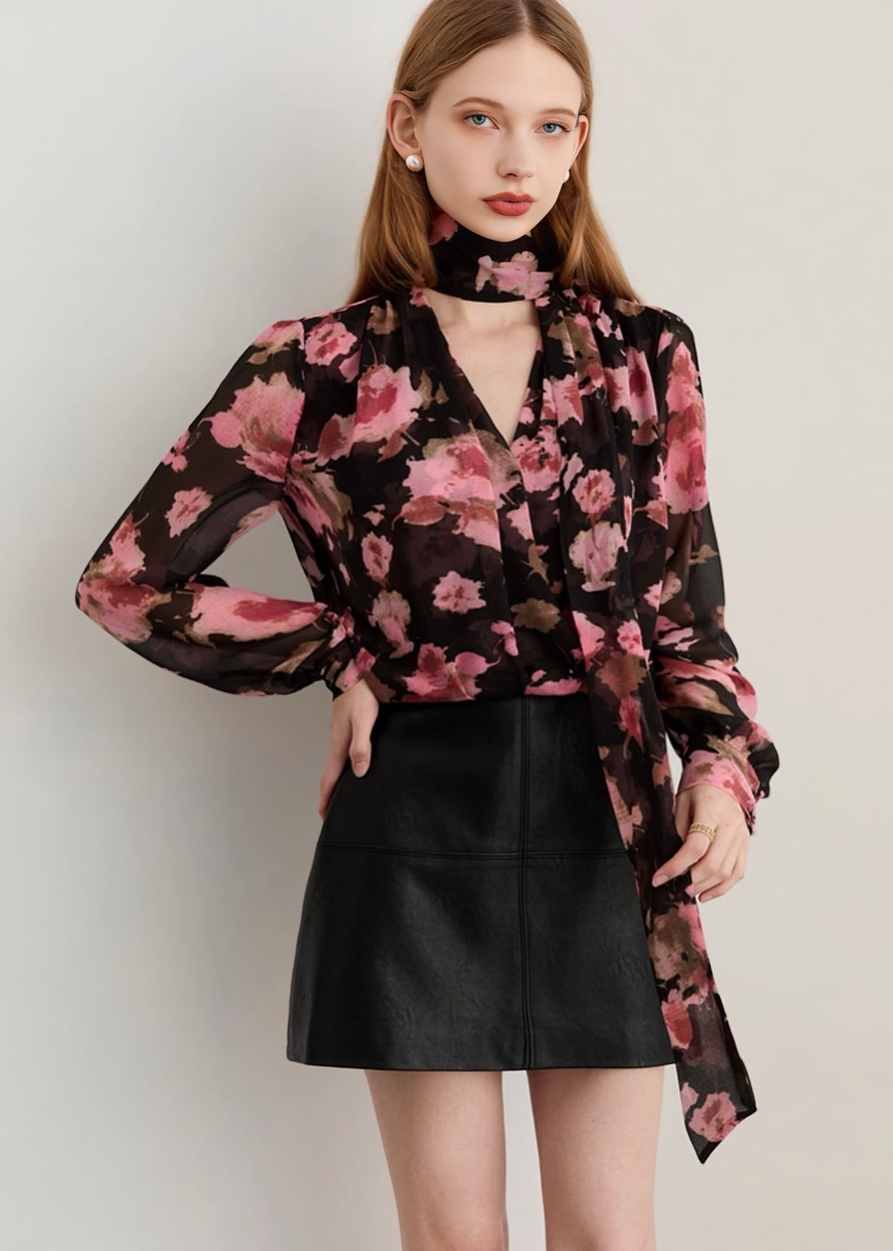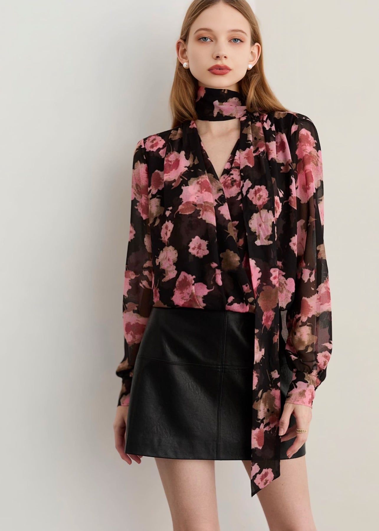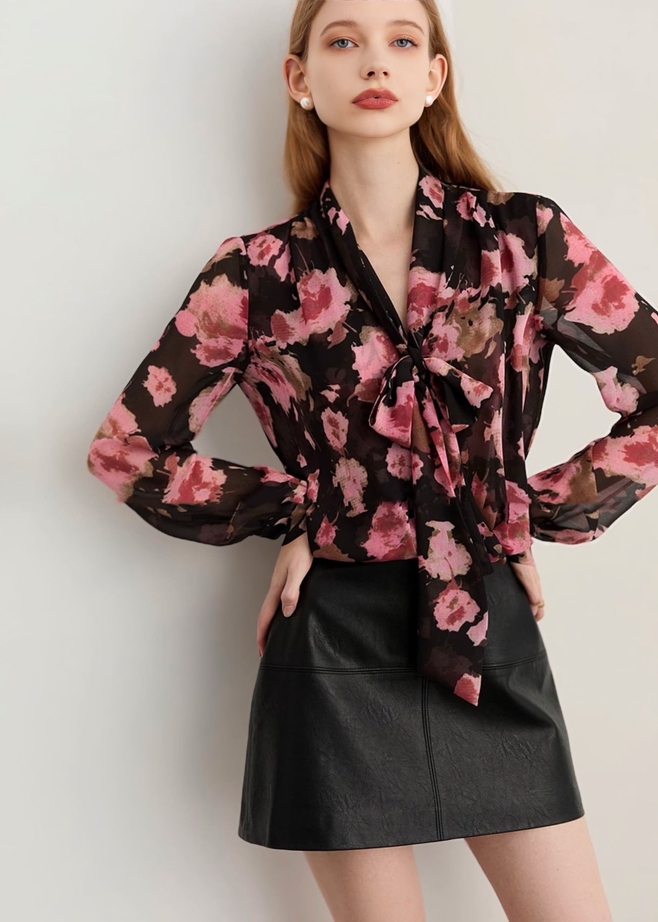 ブラックのシアー生地に大きく描かれたピンクのフラワーが咲き誇る「フラワーリボンタイブラウス」。程よい透け感が女性らしい抜け感を与えつつ、華やかで印象的なスタイルを叶えます。
