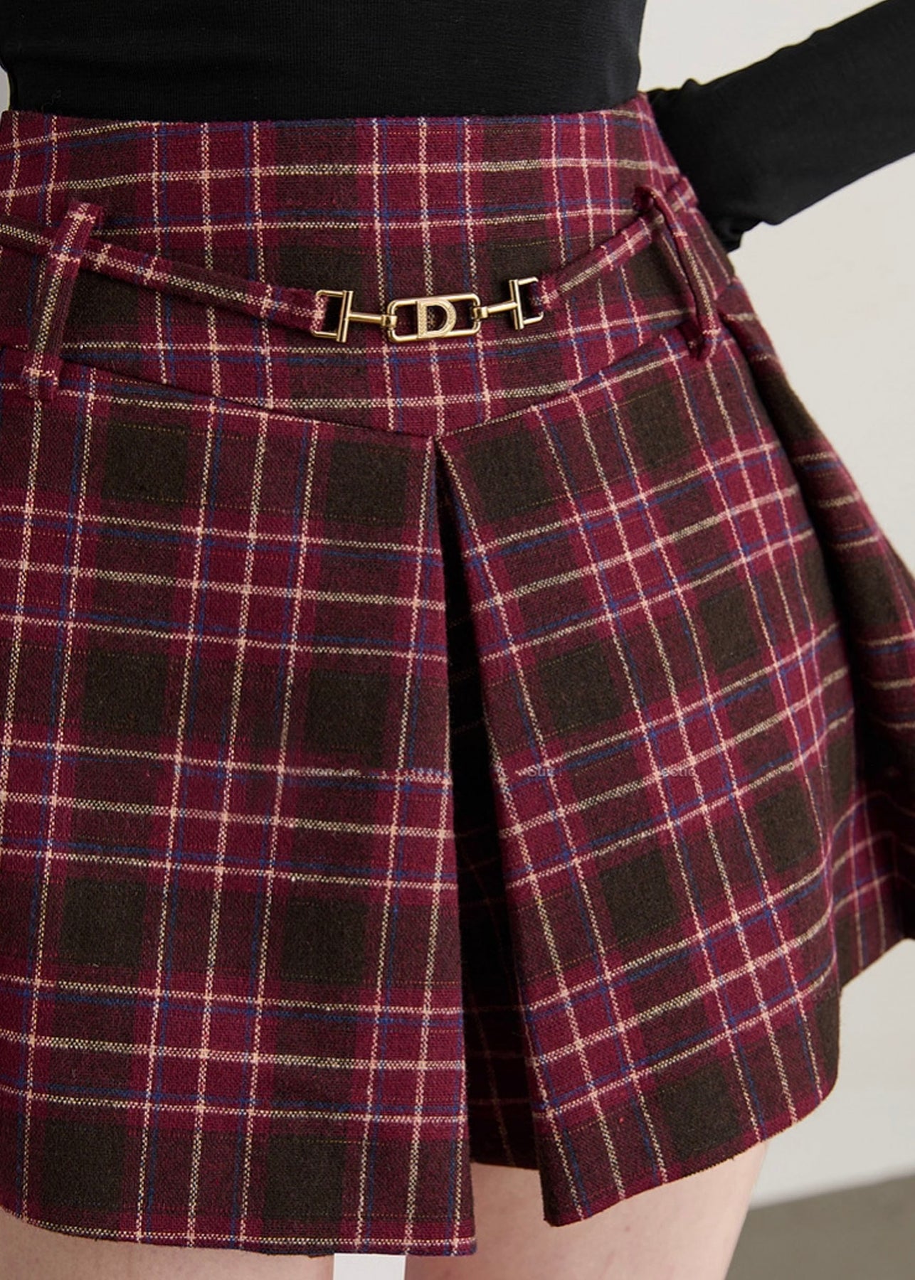 ブラウンの生地に赤のチェック柄が映える、クラシカルな雰囲気たっぷりのプリーツパンツ。