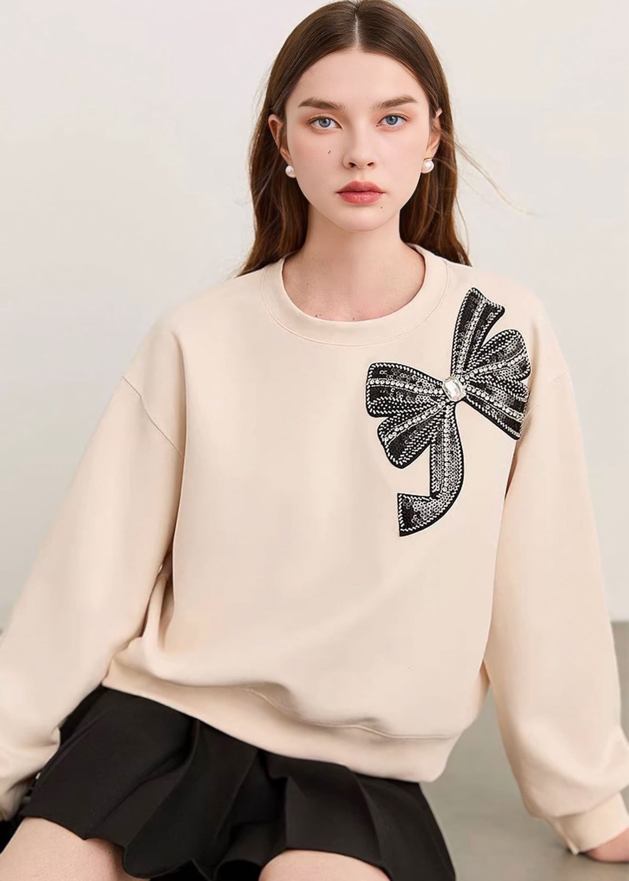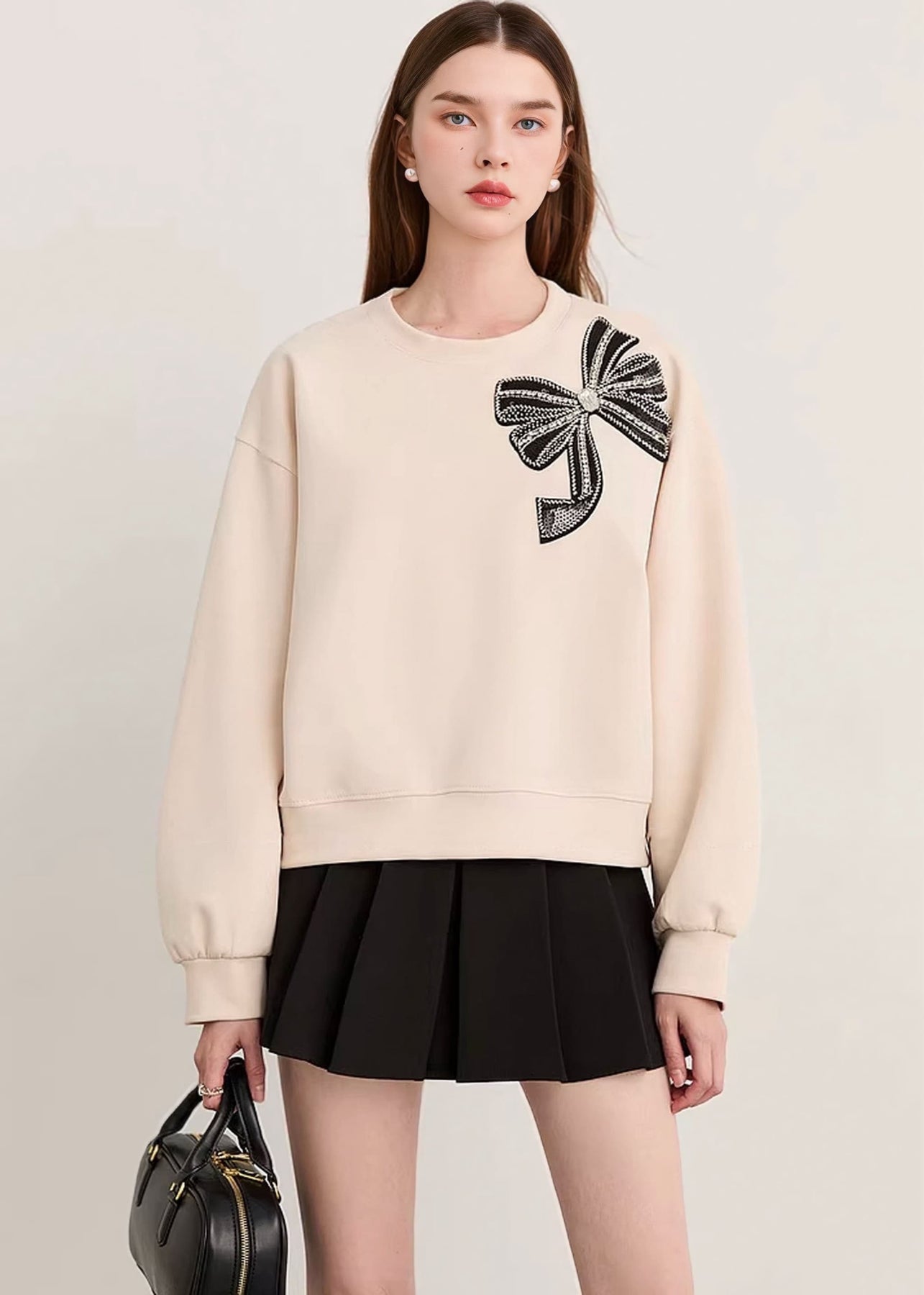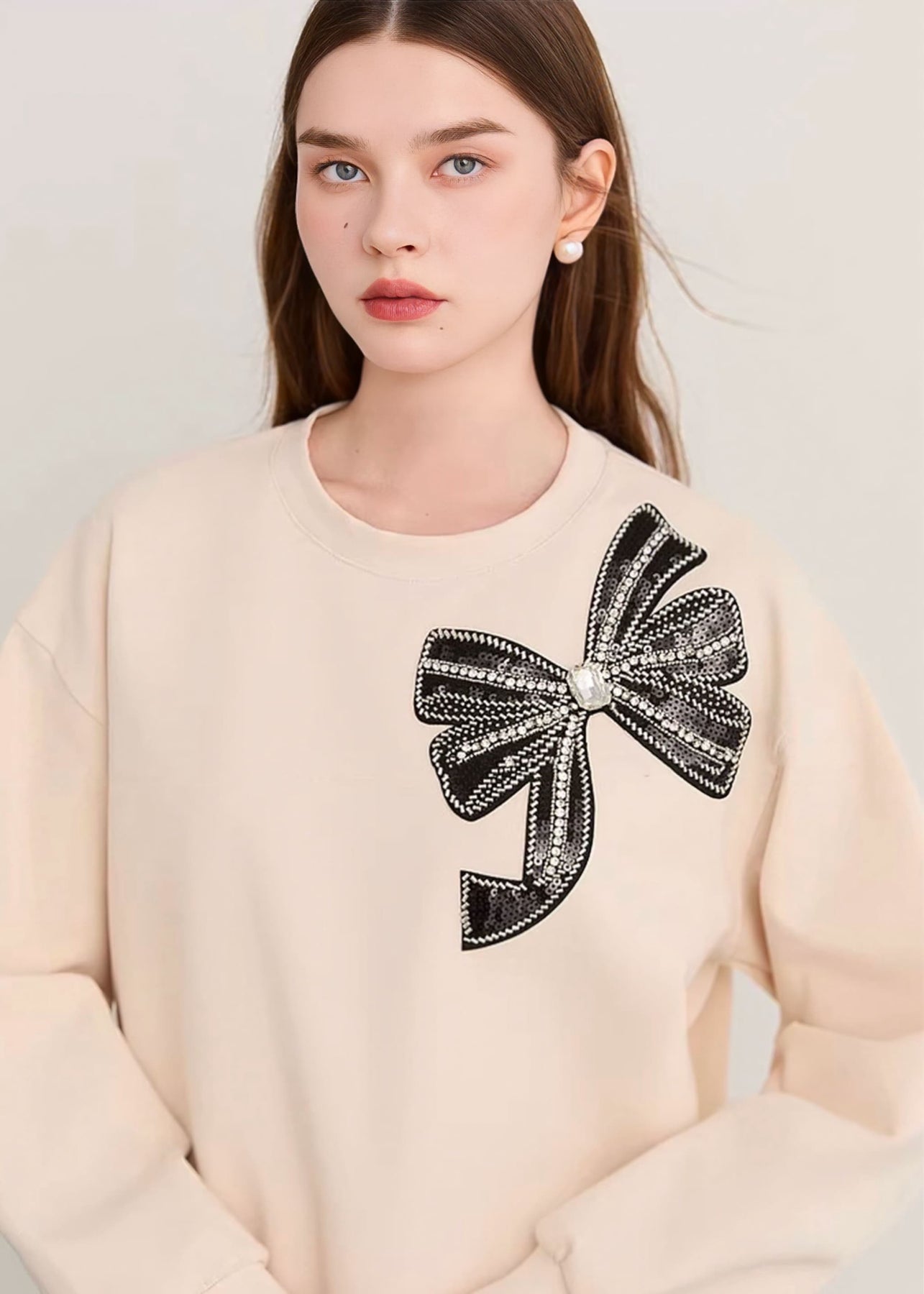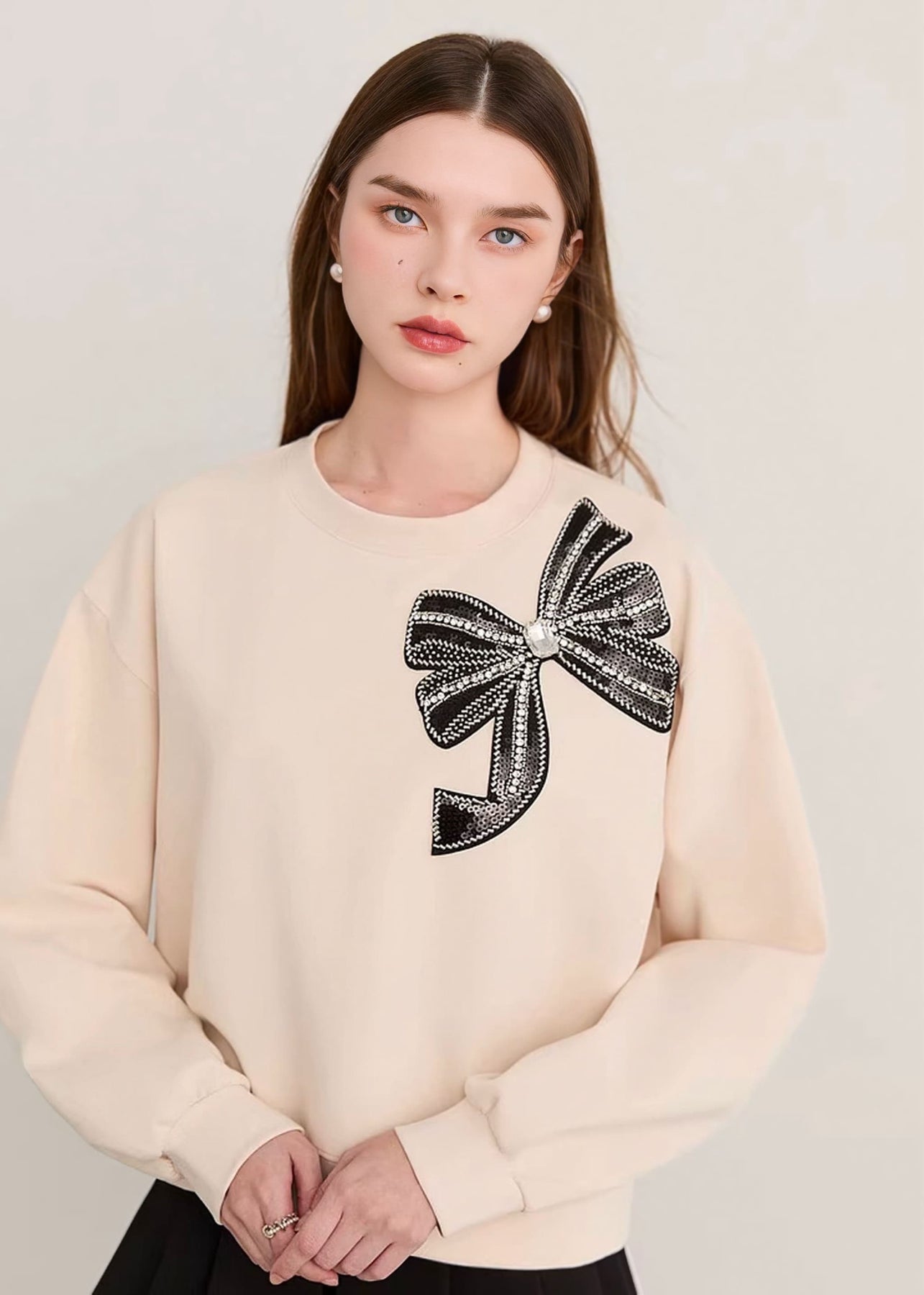 やわらかなアイボリーカラーが上品な印象を与える、ラウンドネックのスウェットシャツ。ベーシックなシルエットをベースにしながら、フロント左サイドに大胆にあしらわれたビジューのリボンデザインが、視線を惹きつける華やかなアクセントになっています。