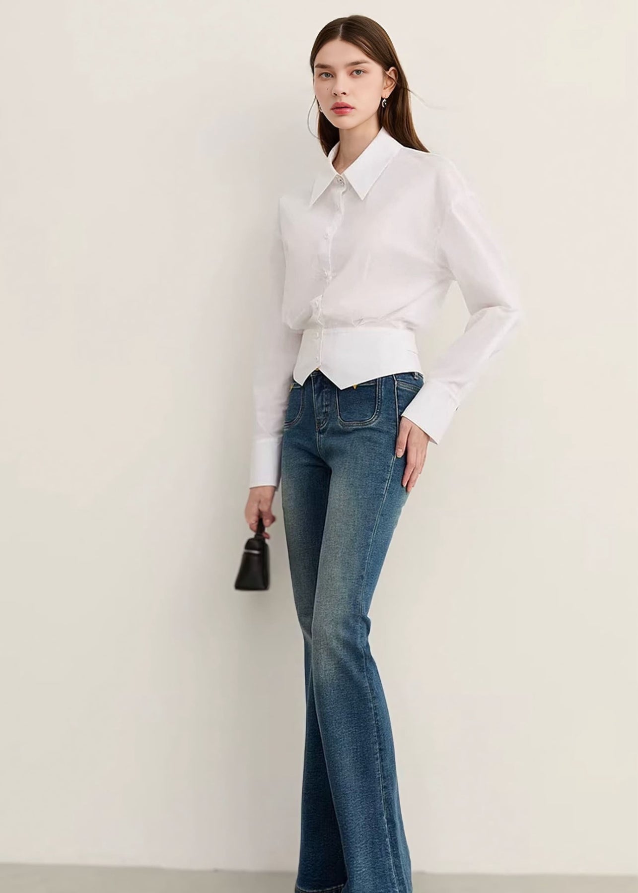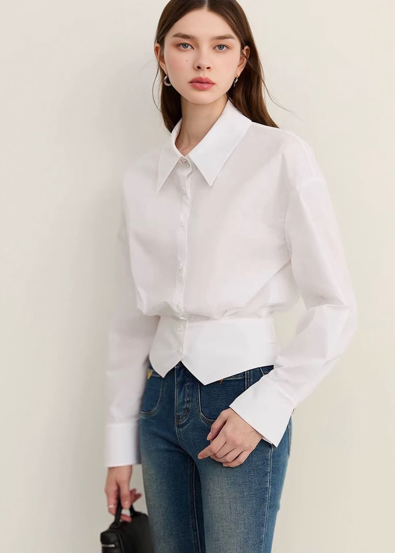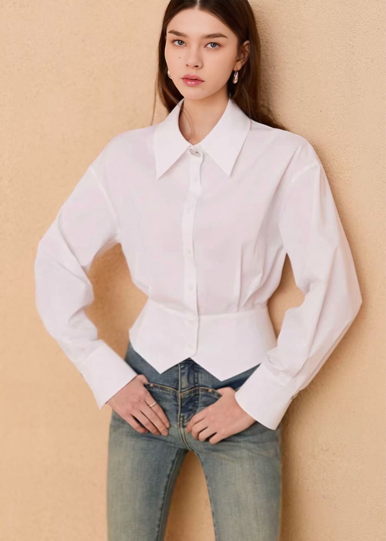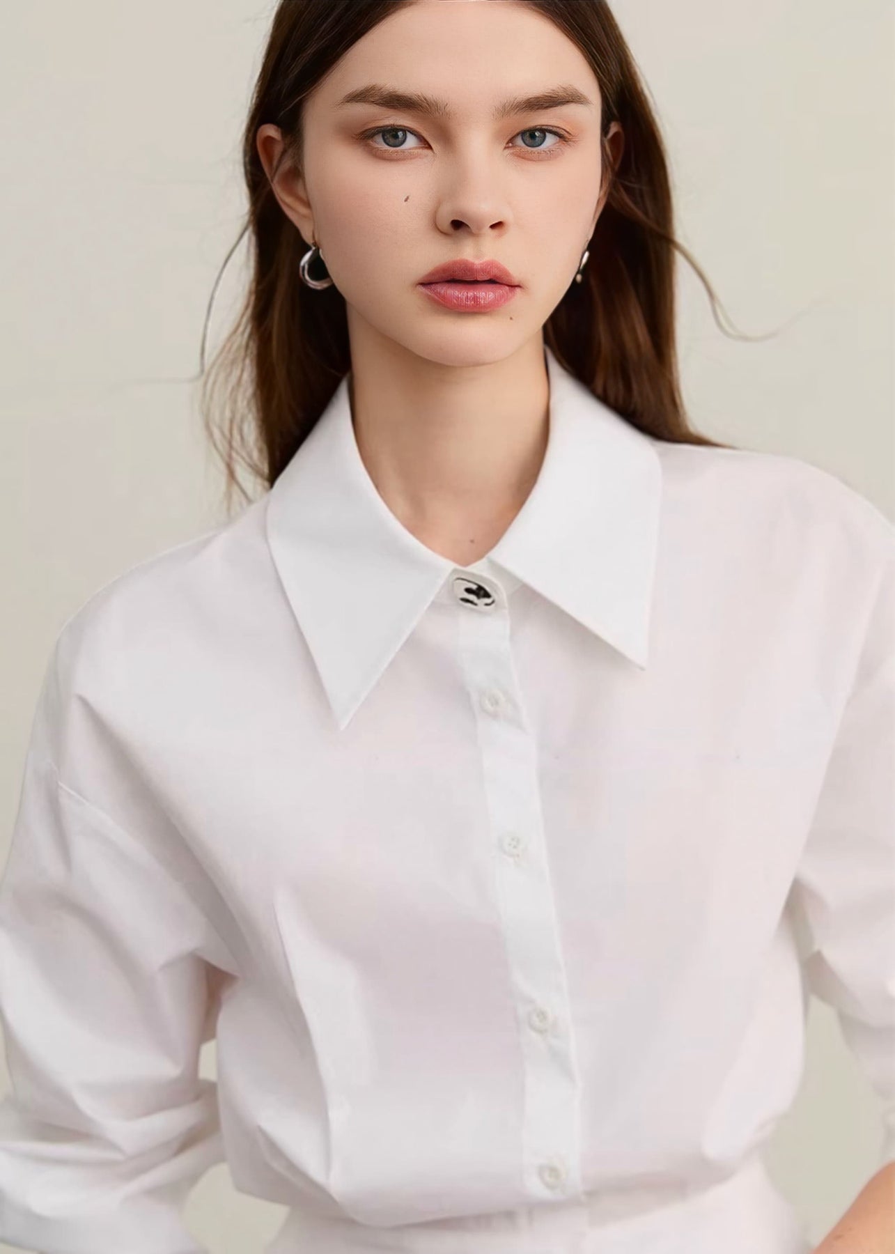 クリーンなホワイトカラーが印象的な、洗練されたデザインシャツ。