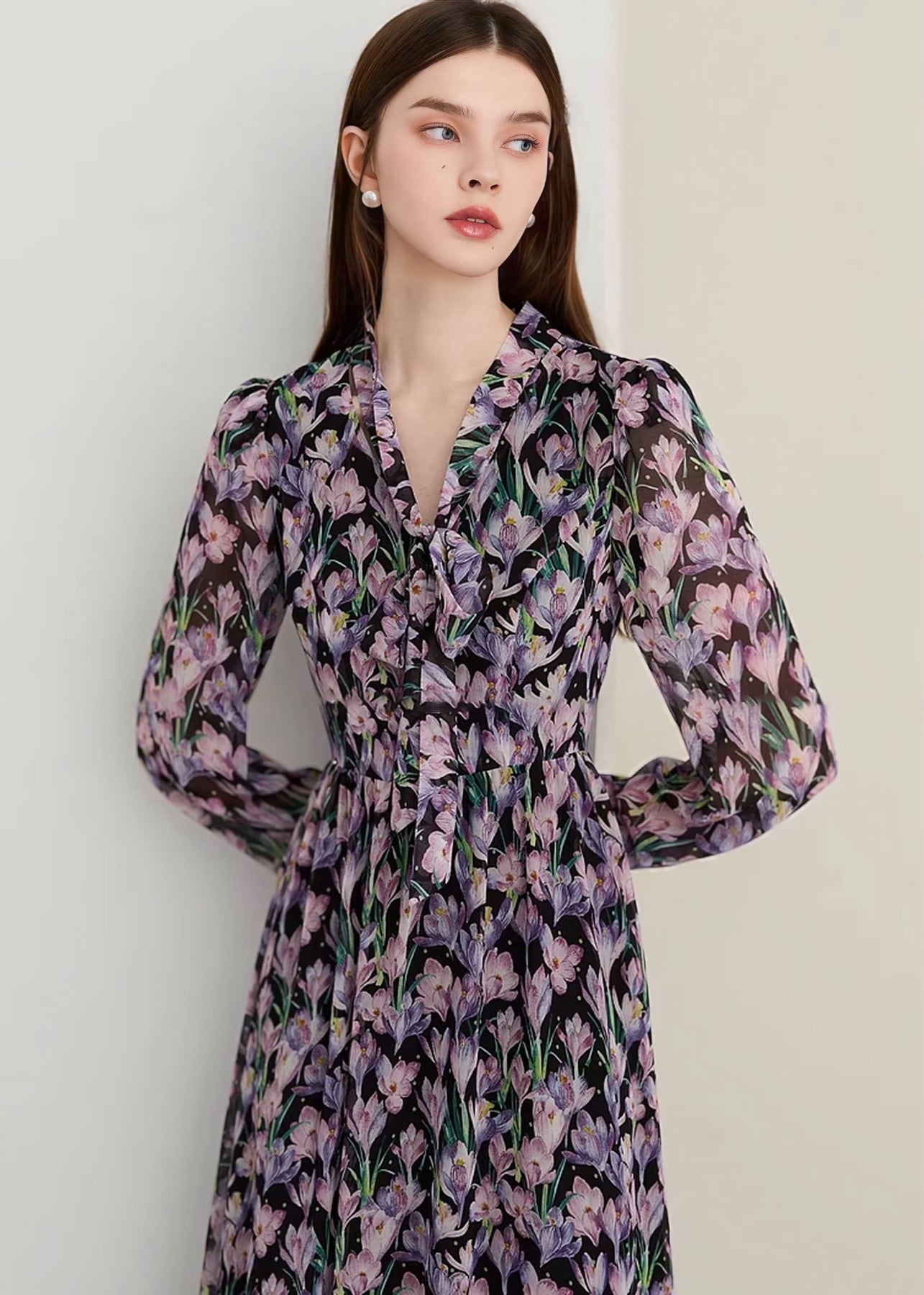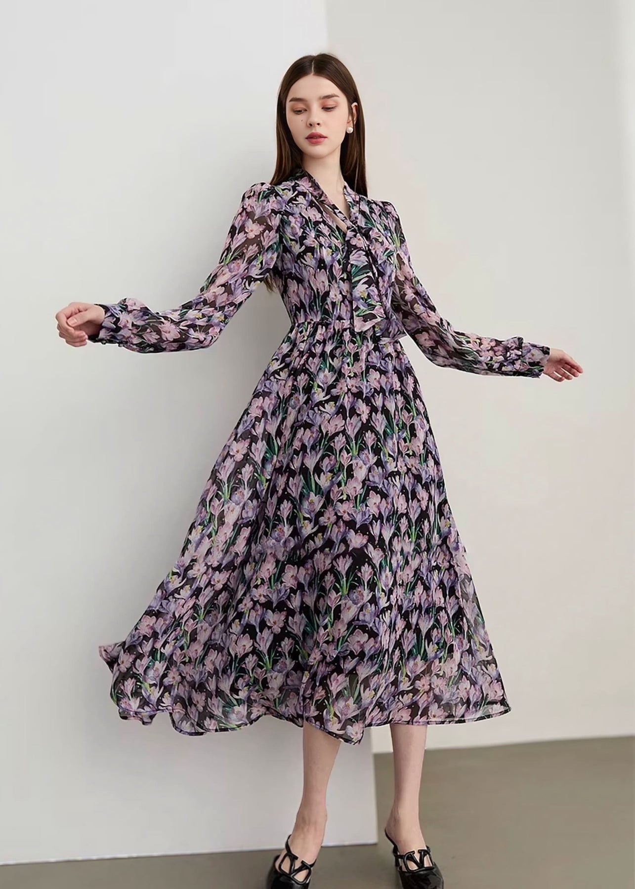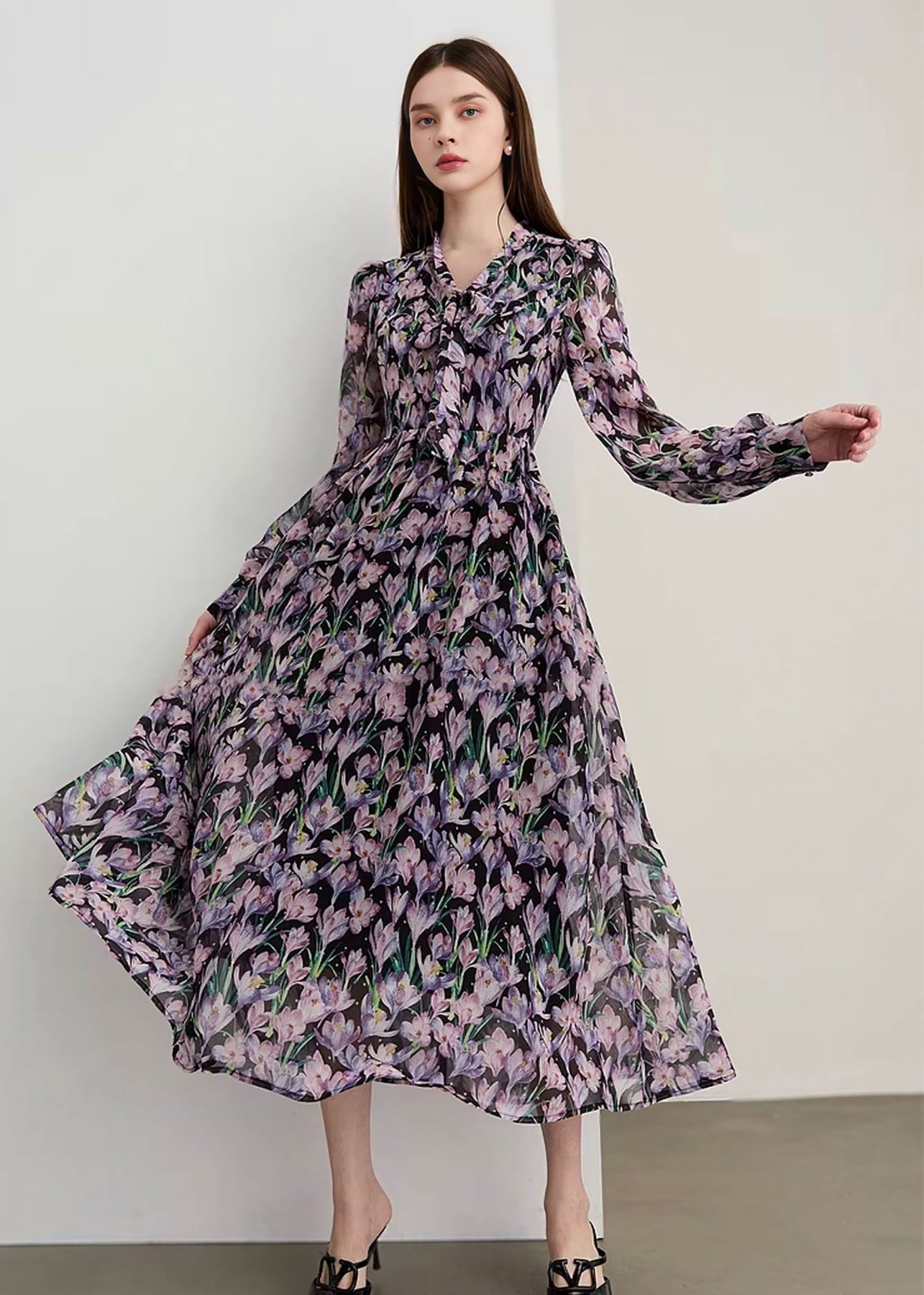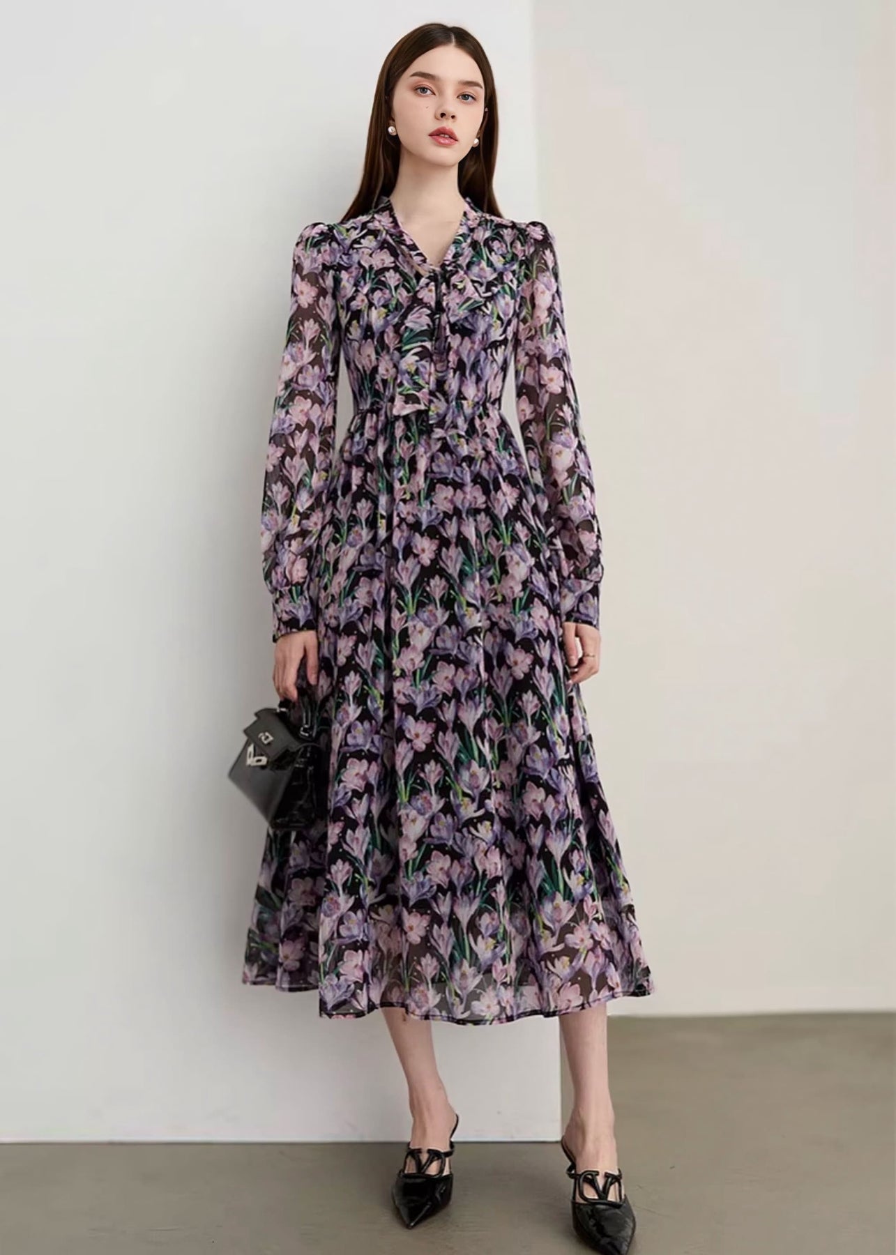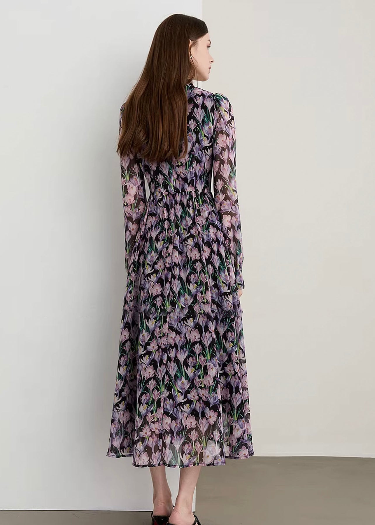 深みのあるブラックカラーをベースに、パープルとピンクの総花柄をあしらった、シックで華やかなロングワンピース。