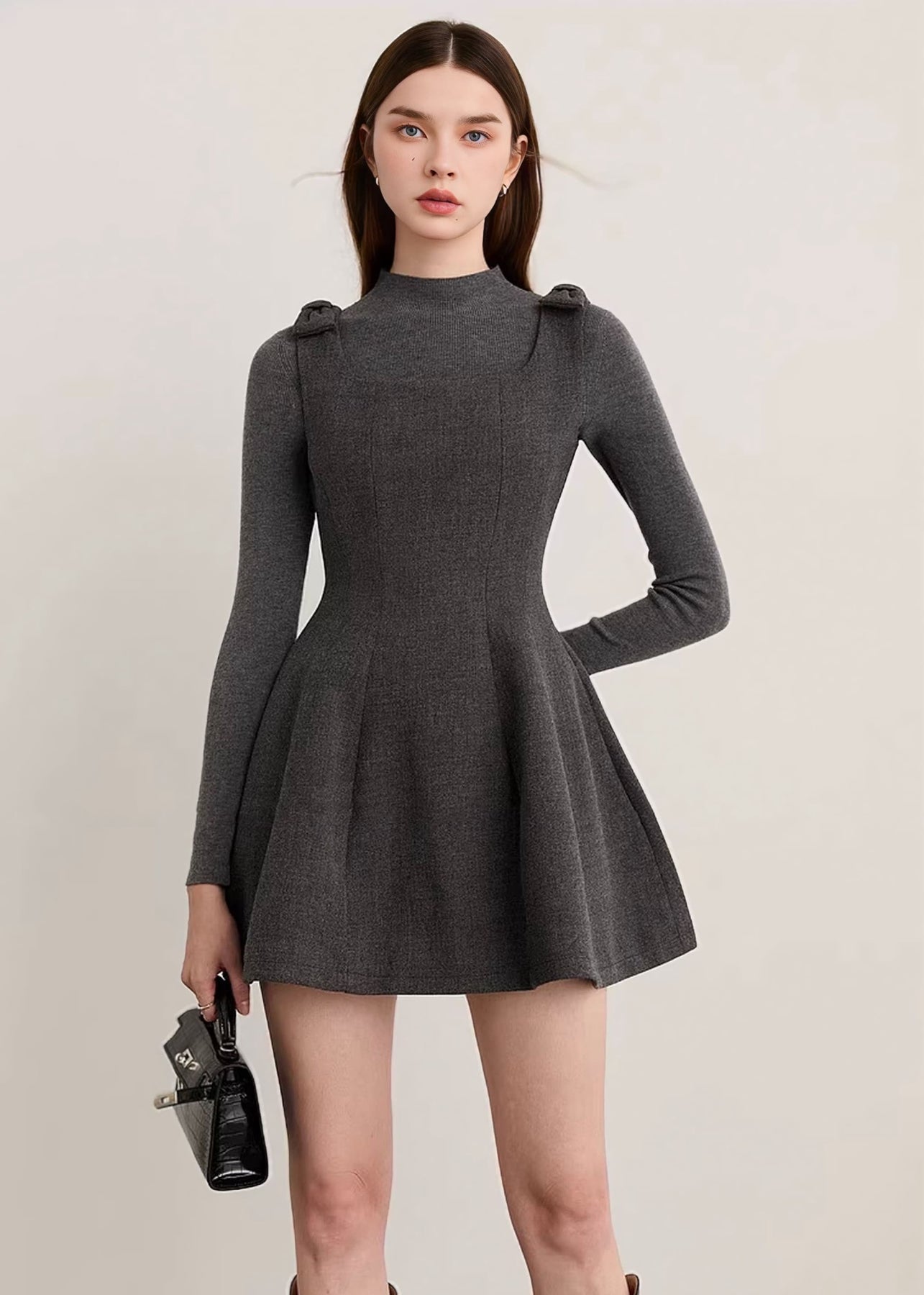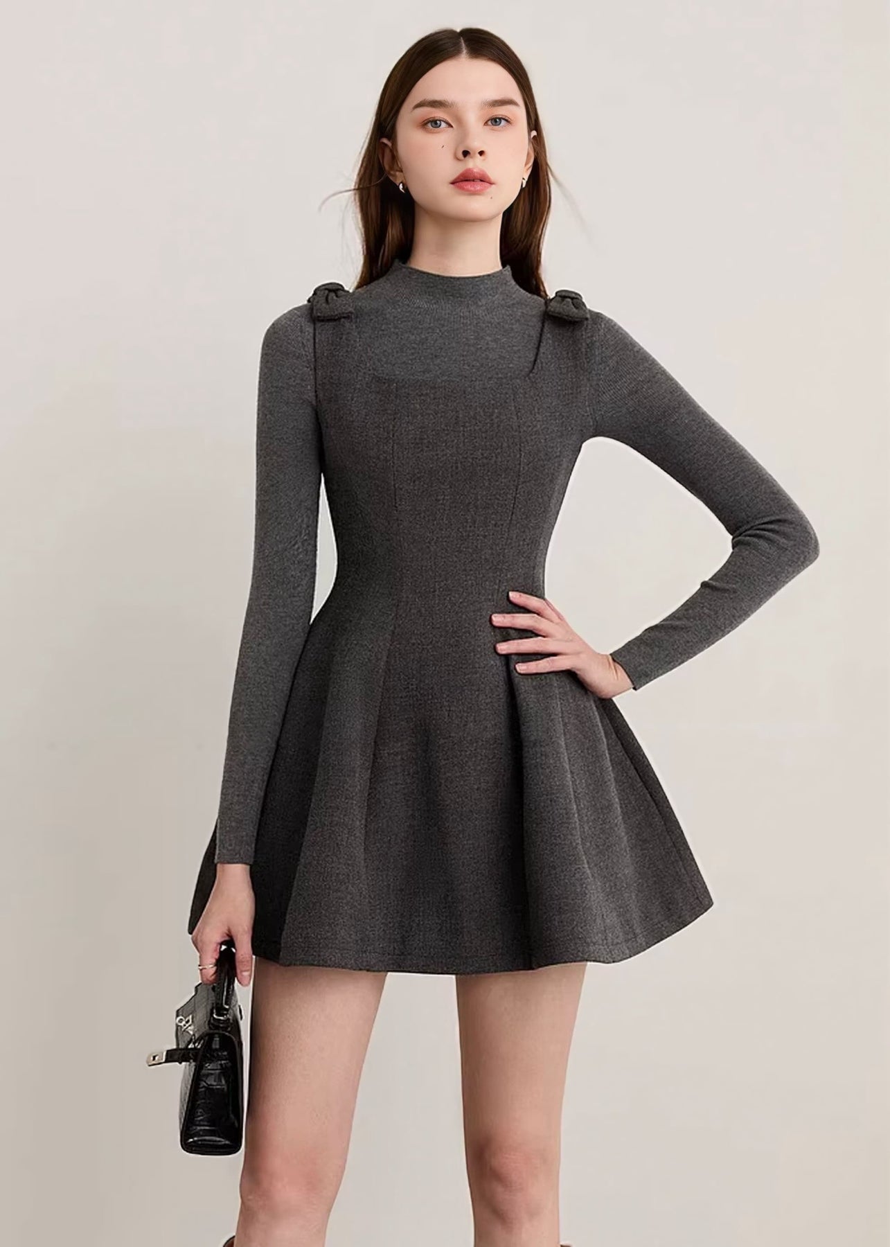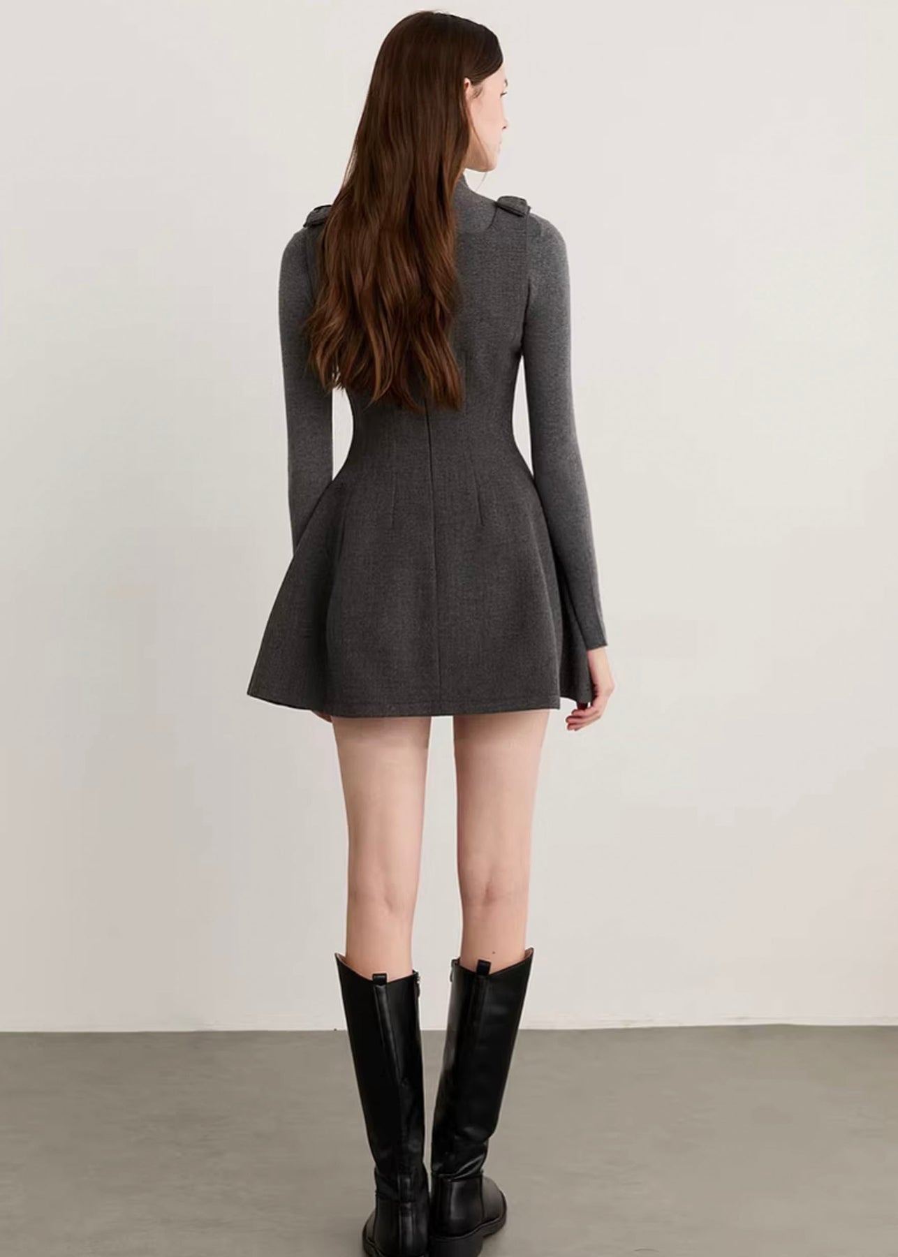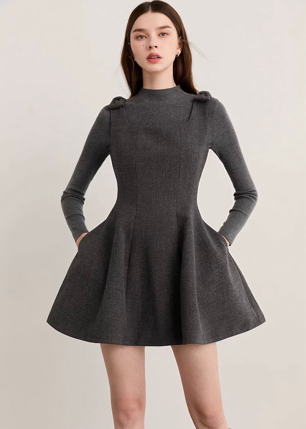 コンパクトな上半身とふんわりと広がるスカートラインのコントラストが、自然なくびれを演出し、スタイルアップを叶えます。