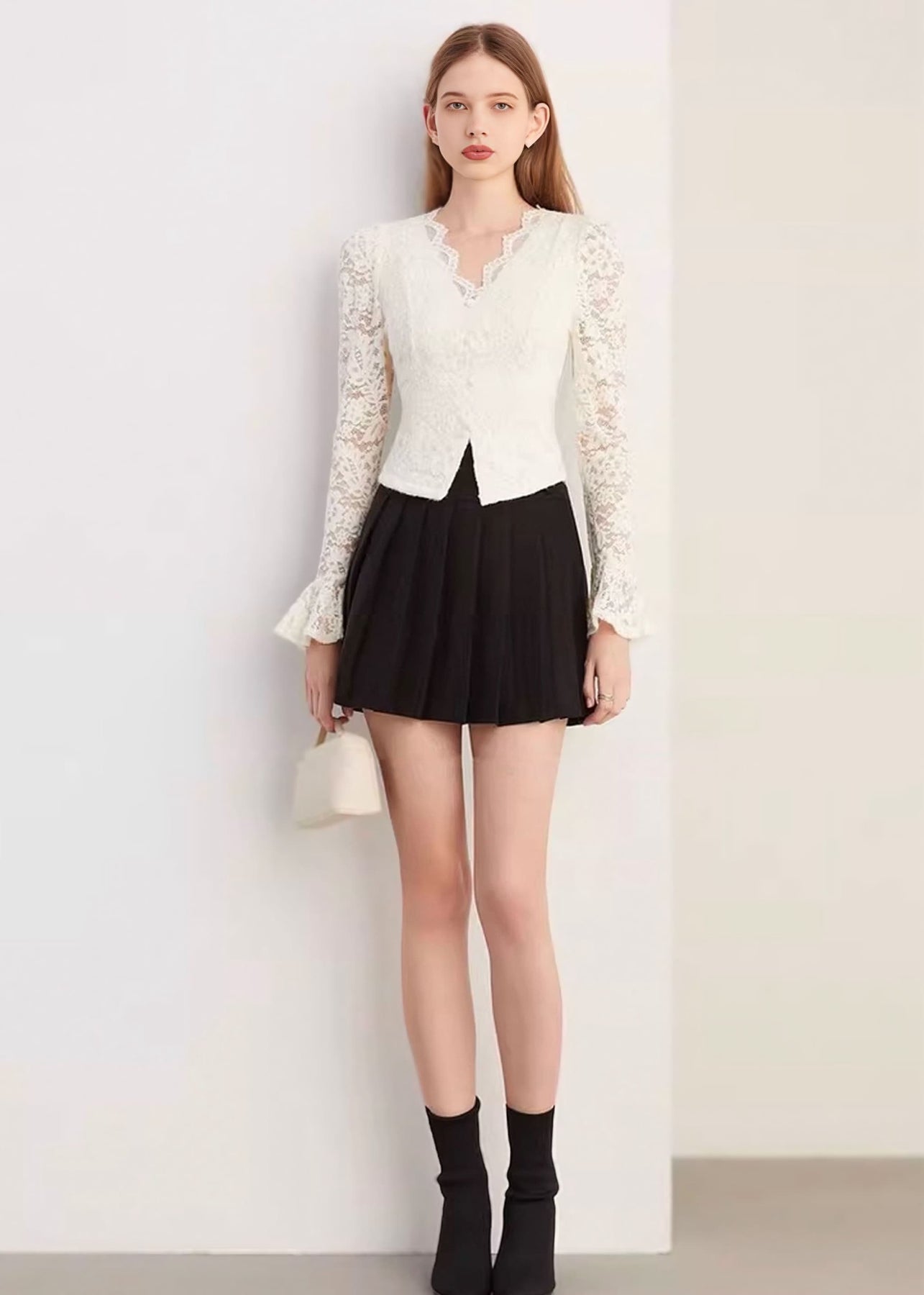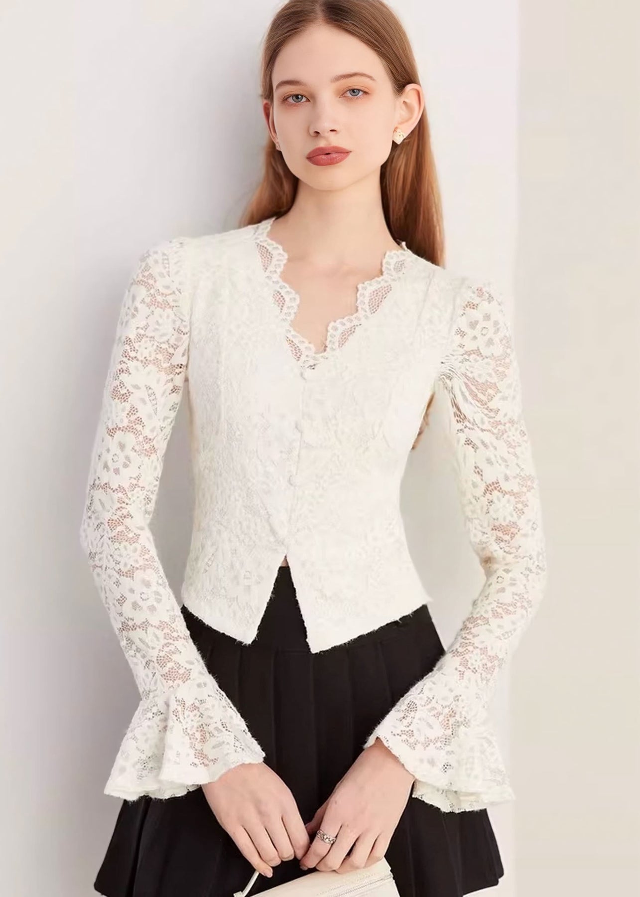 デコルテをすっきりと見せるVネックに、縁にはスカラップレースをあしらい、やわらかくフェミニンな印象に仕上げました。