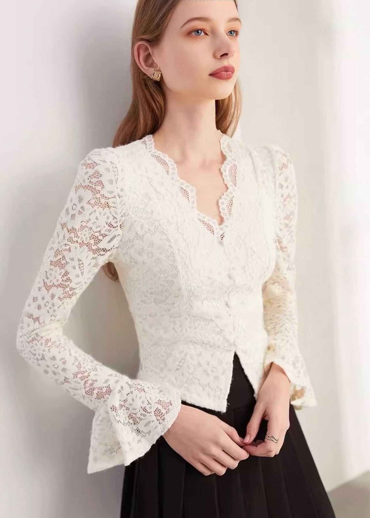 繊細な総レース素材が上品な華やかさを演出するレースレイヤーブラウス。