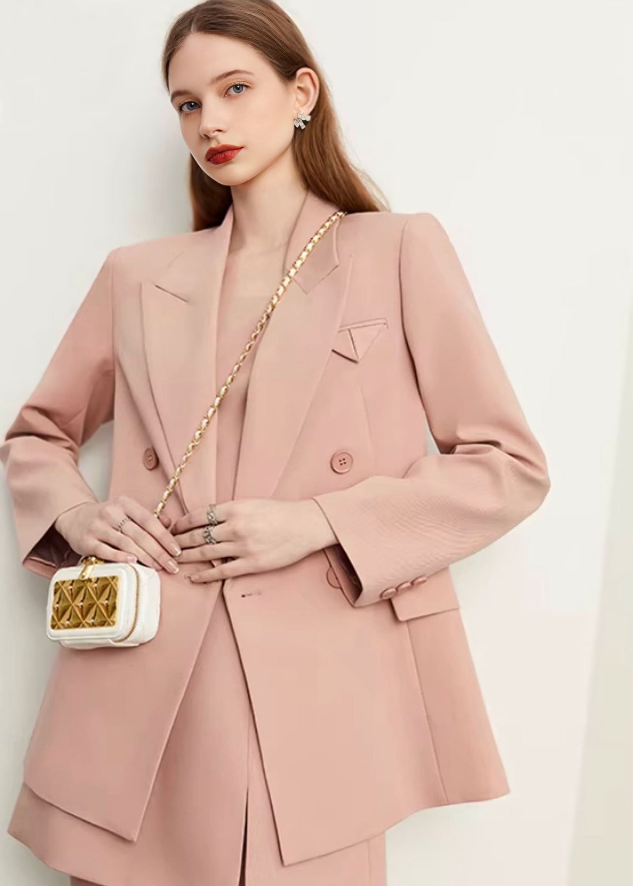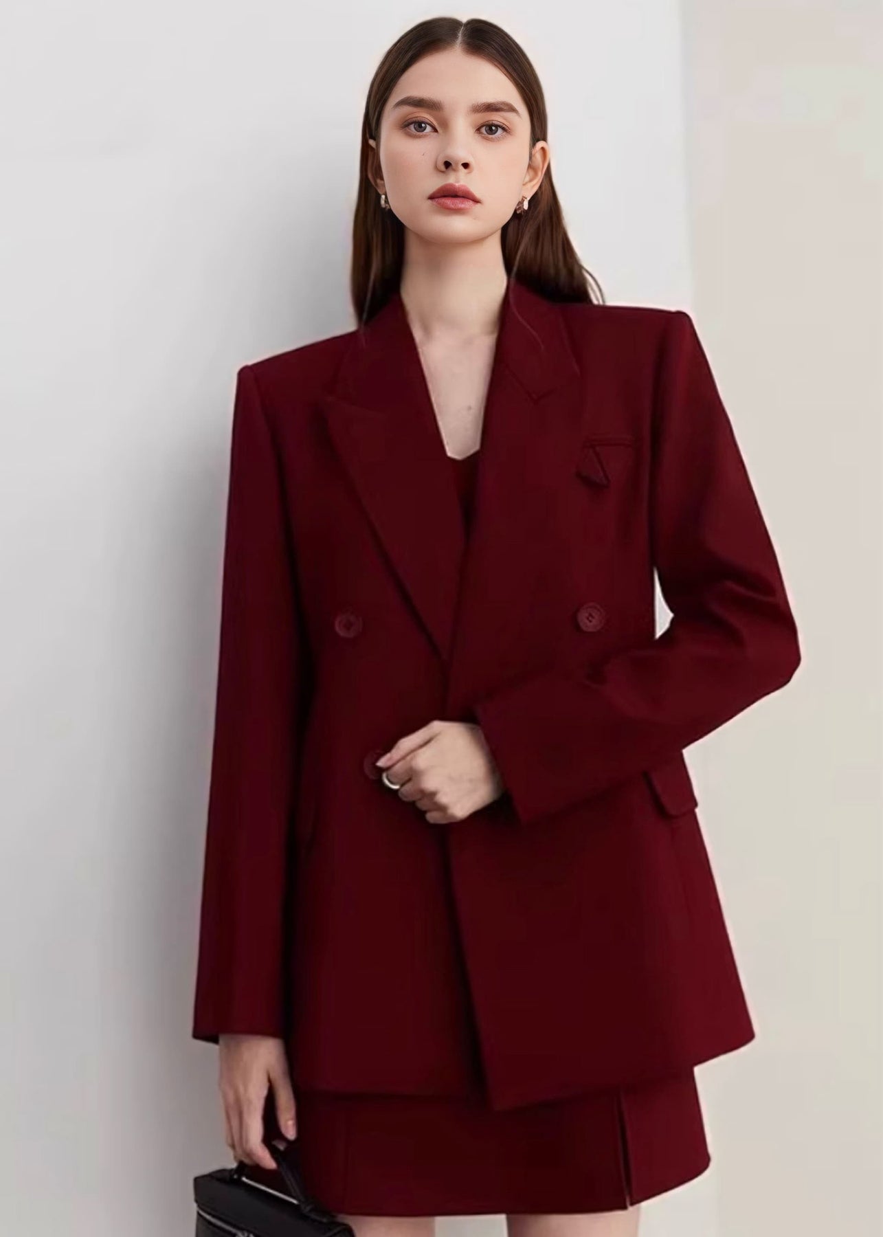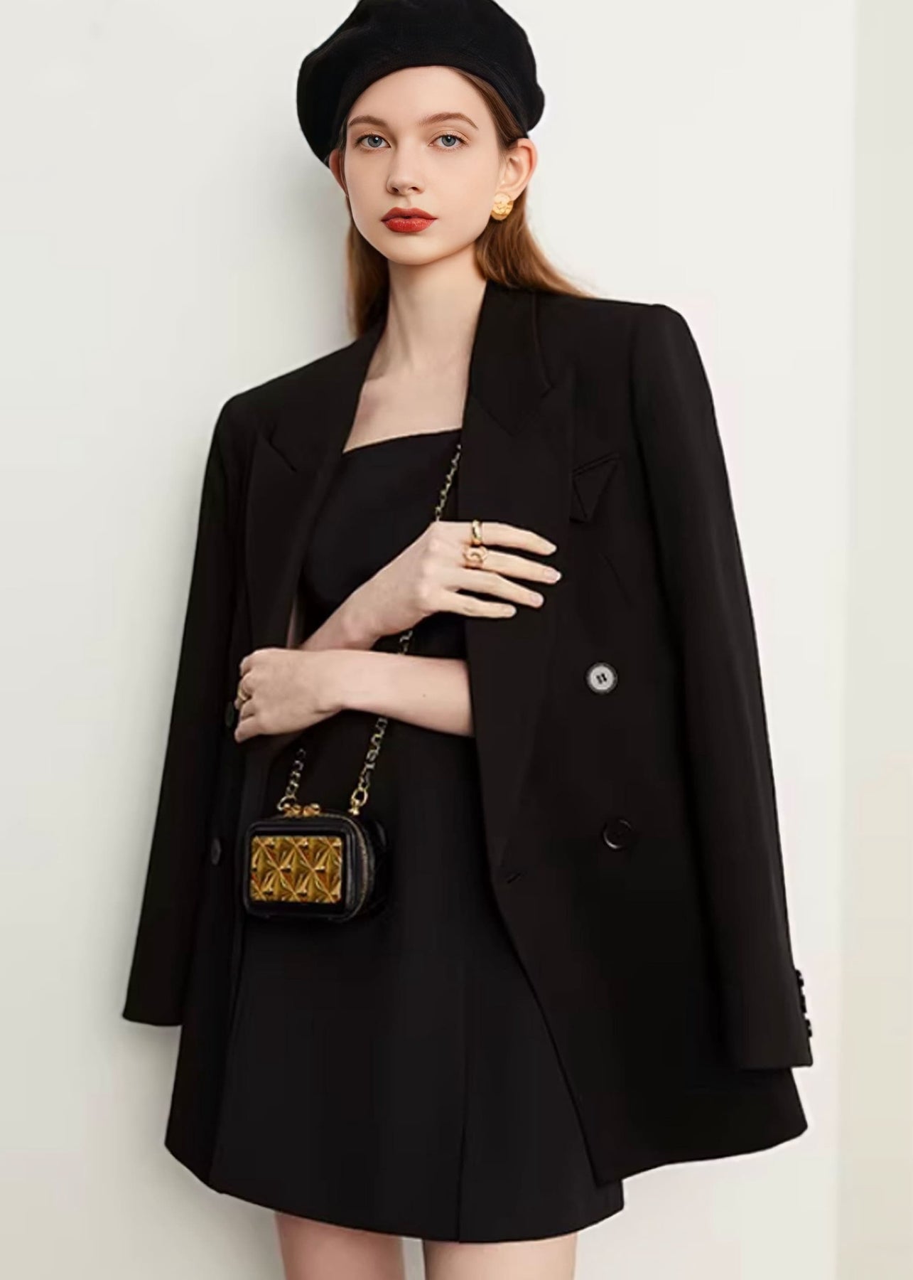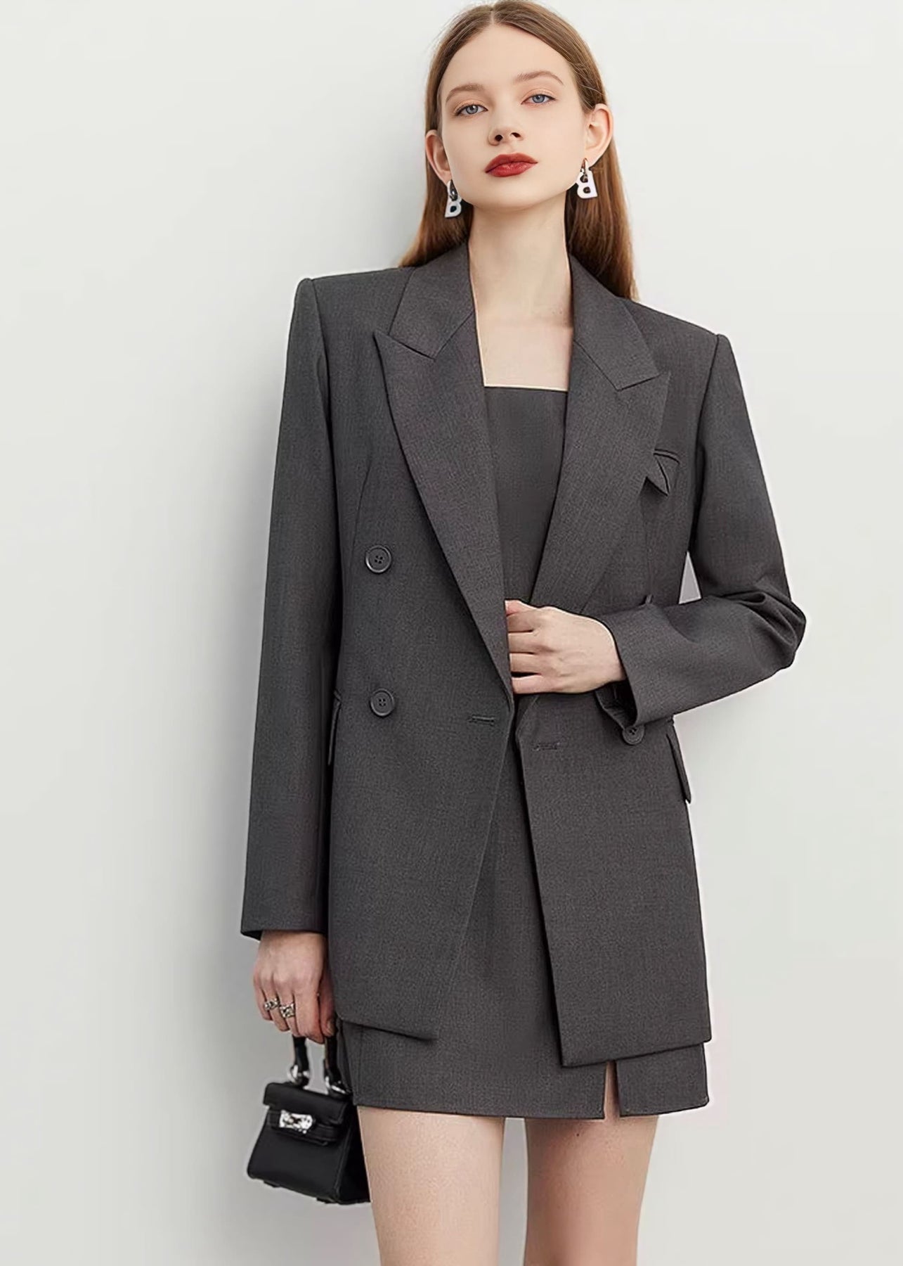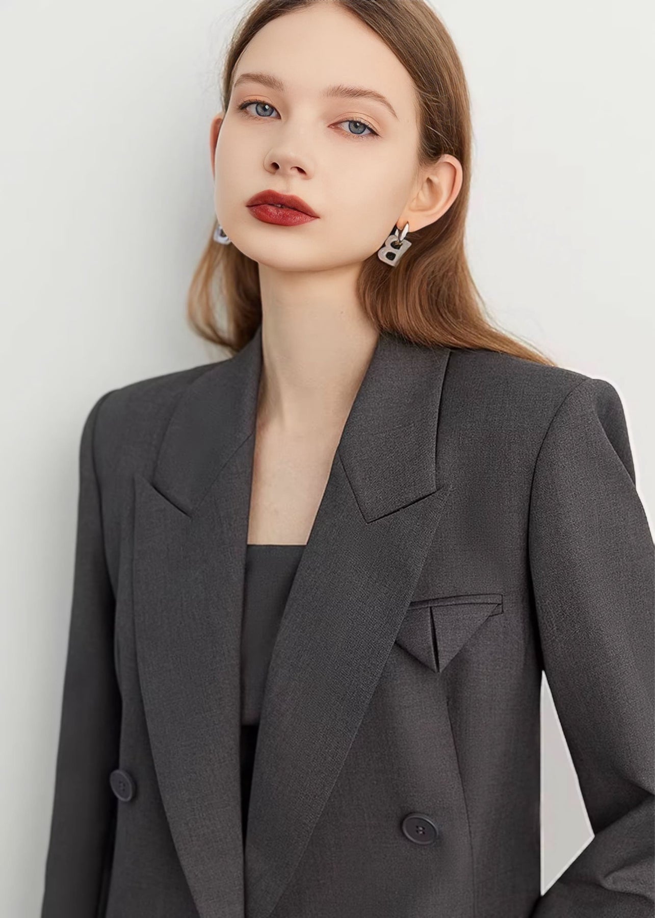 直線的なラインが際立ち、マニッシュでモードな雰囲気を引き立てます。