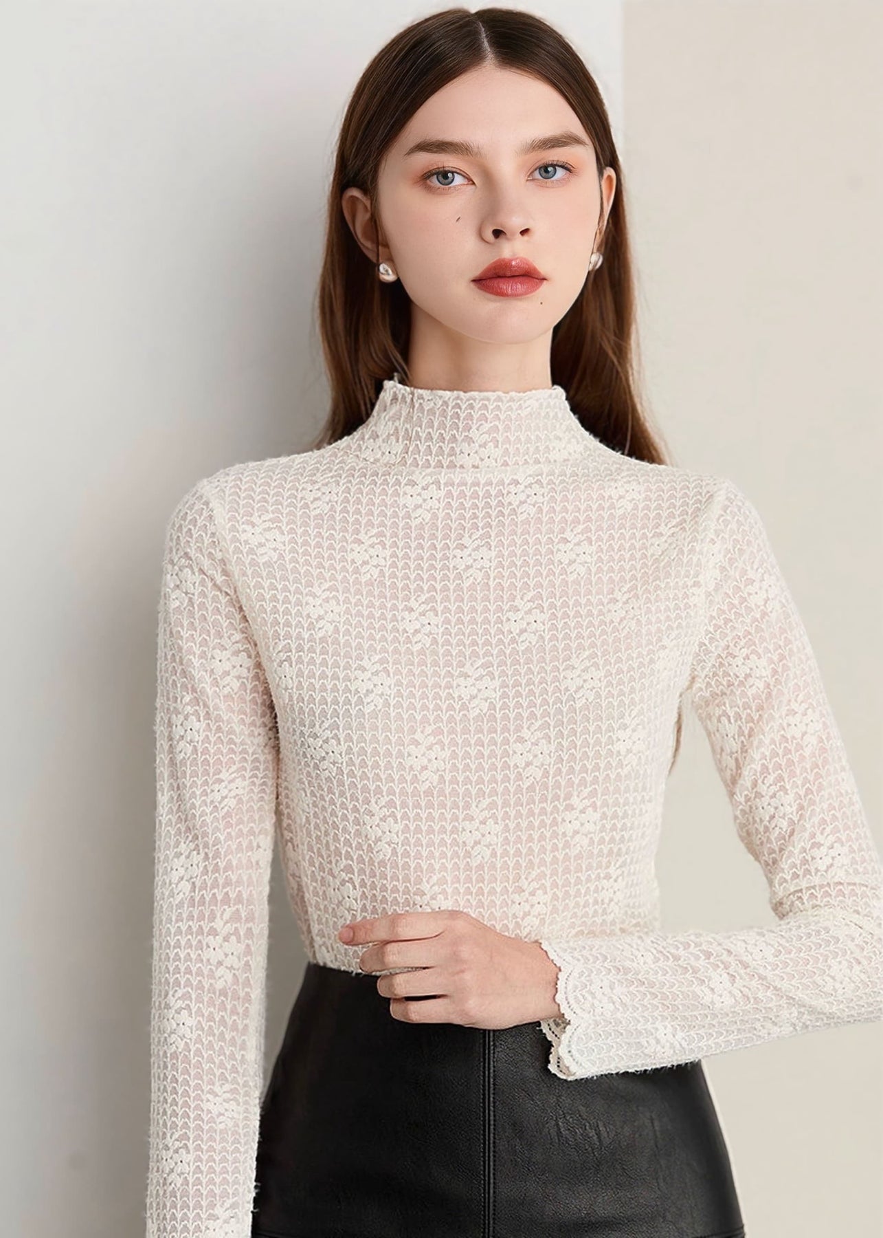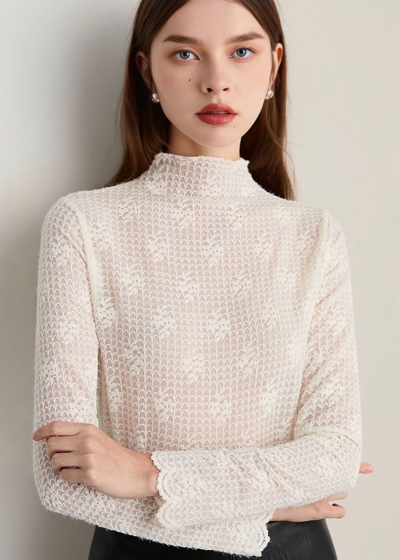 ほどよい透け感が女性らしい軽やかさをプラスし、一枚で着ても、ジャケットやワンピースのインナーとしても美しく映える万能アイテム。
