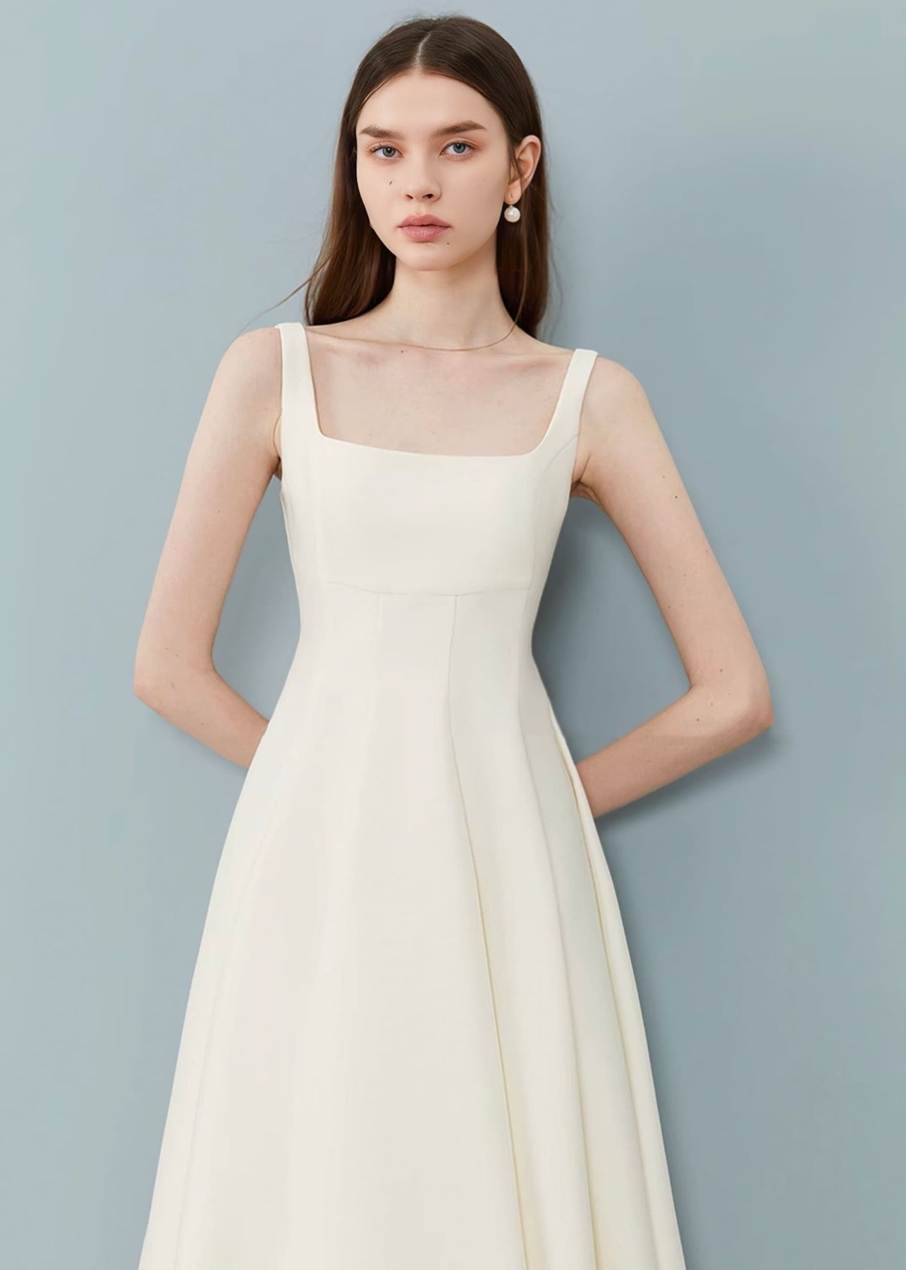 スクエアネックがデコルテを美しく見せ、シンプルながらも洗練されたデザインが上品な印象を与えます。